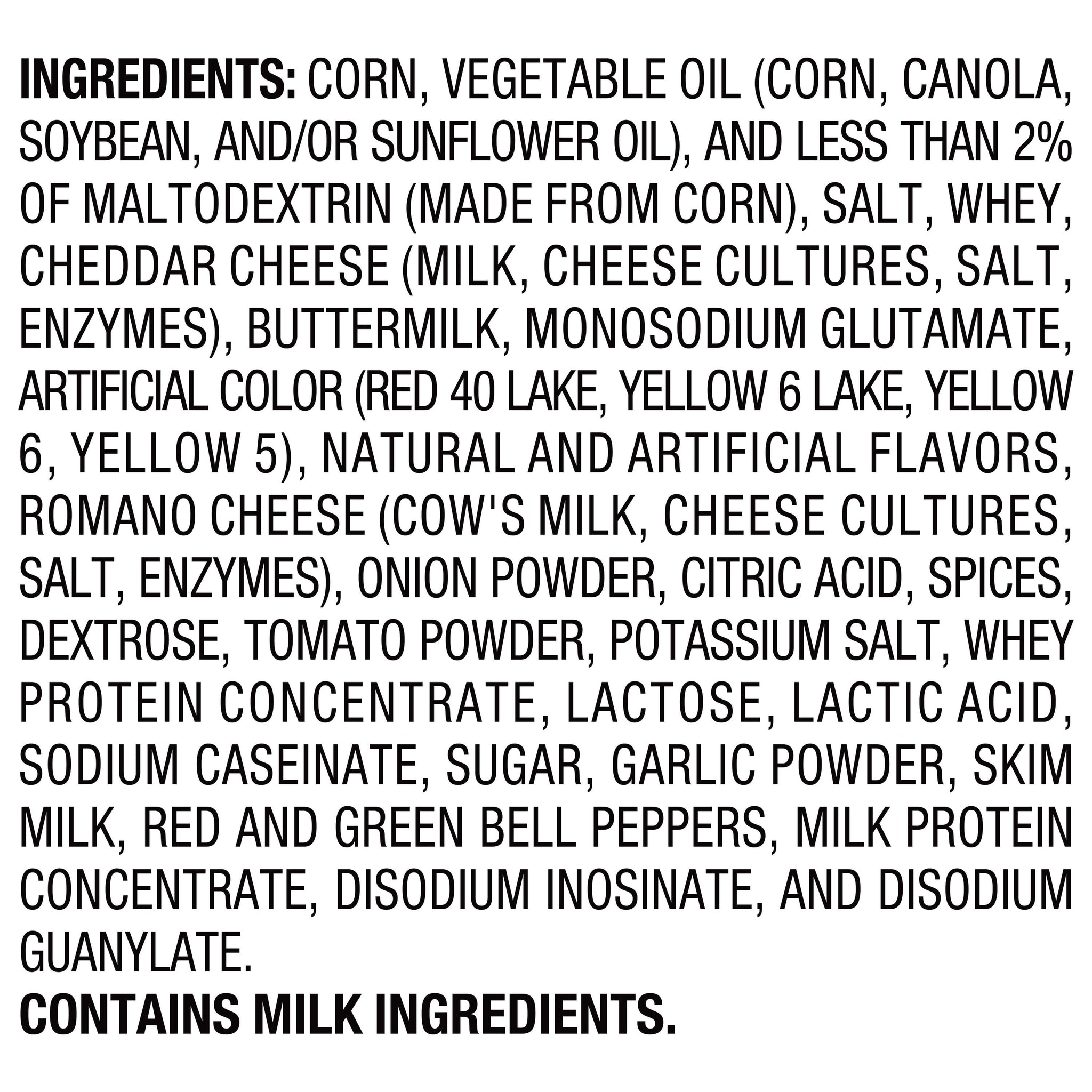 Corn, Vegetable Oil (Sunflower, Corn, and/or Canola Oil), Maltodextrin (made from Corn), Salt, Whey, Cheddar Cheese (Milk, Cheese Cultures, Salt, Enzymes), Buttermilk, Monosodium Glutamate, Artificial Color (Red 40 Lake, Yellow 6 Lake, Yellow 6, Yellow 5), Natural and Artificial Flavors, Romano Cheese (Cow's Milk, Cheese Cultures, Salt, Enzymes), Onion Powder, Citric Acid, Spices, Dextrose, Tomato Powder, Potassium Chloride, Whey Protein Concentrate, Lactose, Lactic Acid, Sodium Caseinate, Sugar, Garlic Powder, Skim Milk, Red and Green Bell Pepper Powder, Milk Protein Concentrate, Disodium Inosinate, Disodium Guanylate/div>