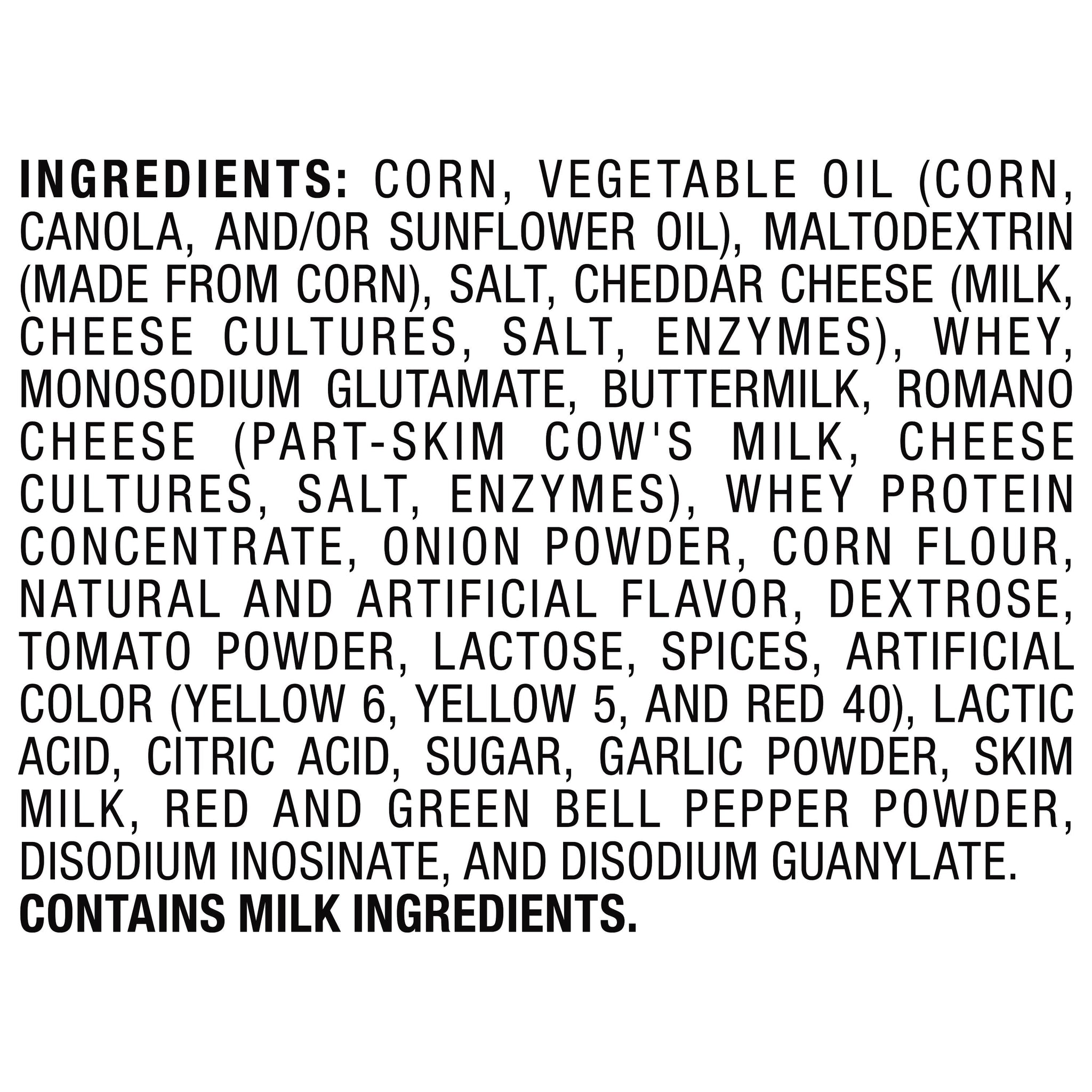 Corn, Vegetable Oil (Corn, Canola, and/or Sunflower Oil), Maltodextrin (made from Corn), Salt, Cheddar Cheese (Milk, Cheese Cultures, Salt, Enzymes), Whey, Monosodium Glutamate, Buttermilk, Romano Cheese (Part-Skim Cow's Milk, Cheese Cultures, Salt, Enzymes), Whey Protein Concentrate, Onion Powder, Corn Flour, Natural and Artificial Flavor, Dextrose, Tomato Powder, Lactose, Spices, Artificial Color (Yellow 6, Yellow 5, and Red 40), Lactic Acid, Citric Acid, Sugar, Garlic Powder, Skim Milk, Red and Green Bell Pepper Powder, Disodium Inosinate, Disodium Guanylate/div>