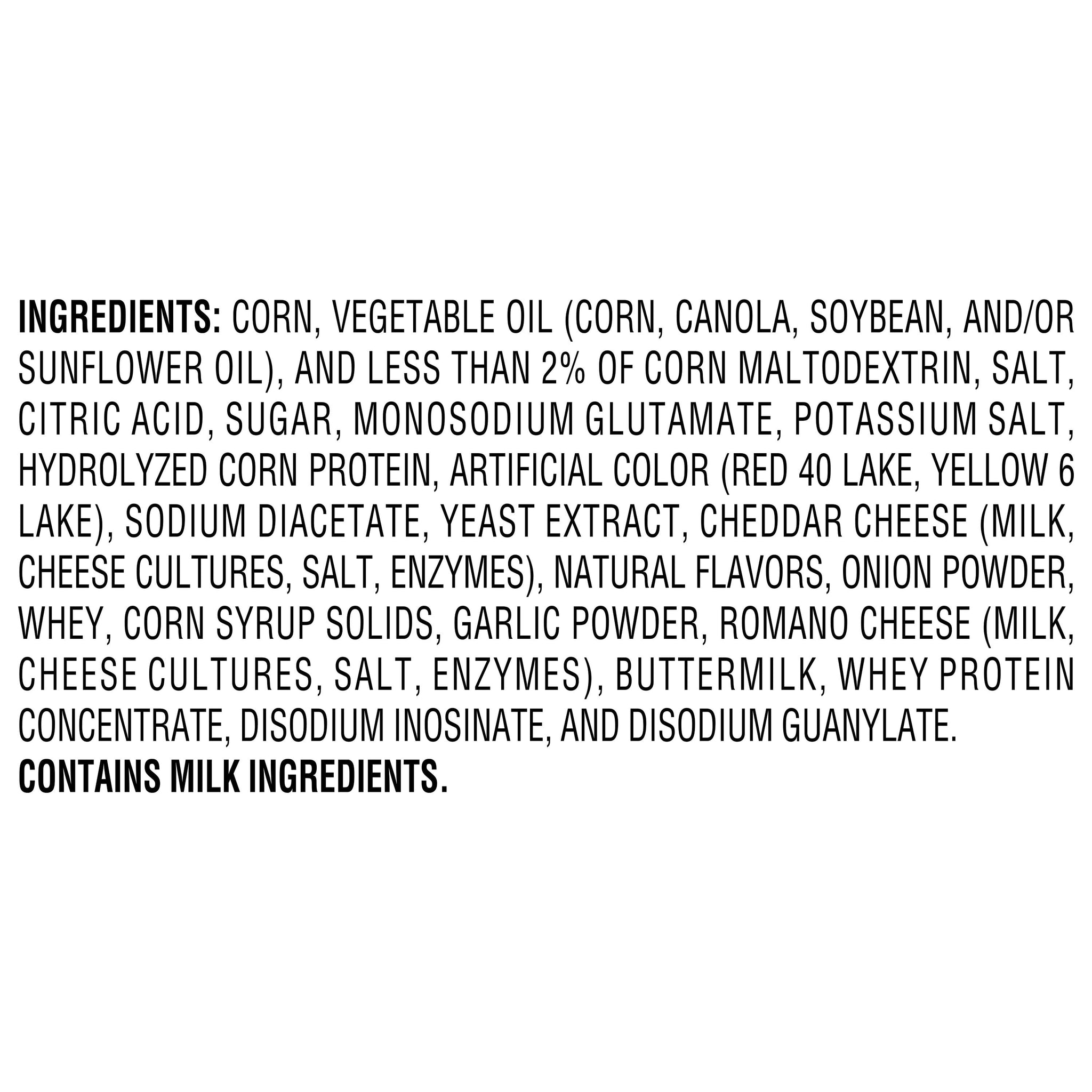 Corn, Vegetable Oil (Corn, Canola, Soybean, and/or Sunflower Oil), and Less than 2% of Corn Maltodextrin, Salt, Citric Acid, Sugar, Monosodium Glutamate, Potassium Salt, Hydrolyzed Corn Protein, Artificial Color (Red 40 Lake, Yellow 6 Lake), Sodium Diacetate, Yeast Extract, Cheddar Cheese (Milk, Cheese Cultures, Salt, Enzymes), Natural Flavors, Onion Powder, Whey, Corn Syrup Solids, Garlic Powder, Romano Cheese (Milk, Cheese Cultures, Salt, Enzymes), Buttermilk, Whey Protein Concentrate, Disodium Inosinate, and Disodium Guanylate./div>