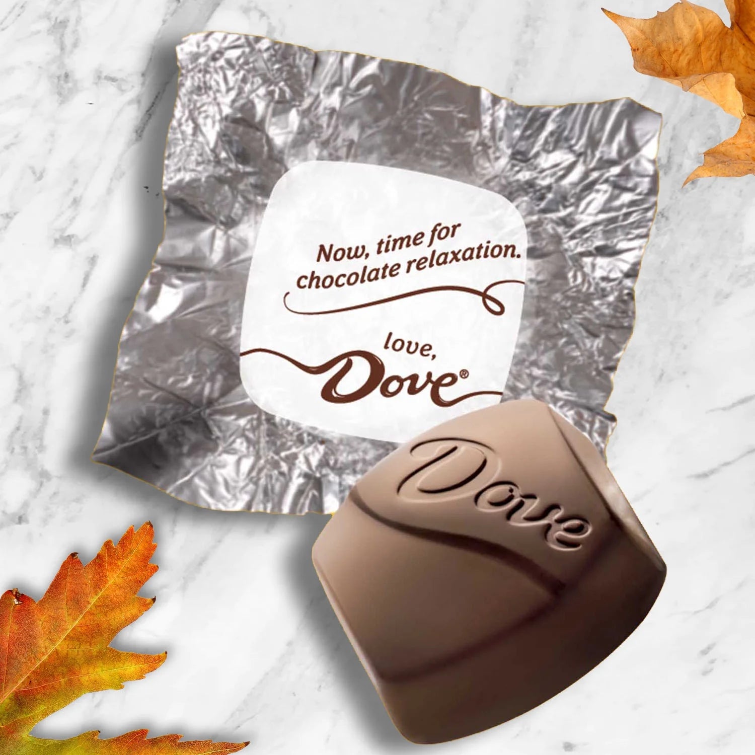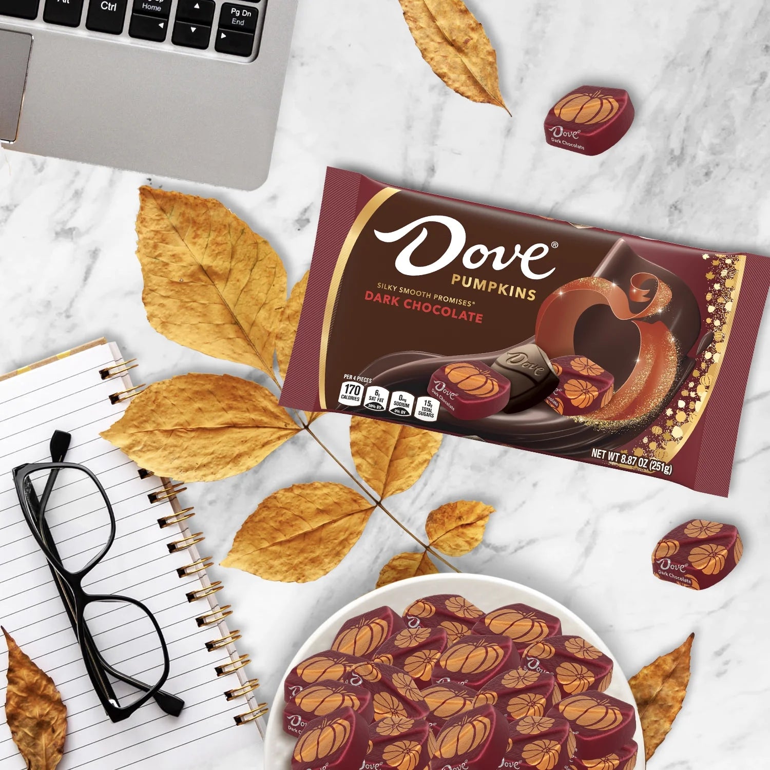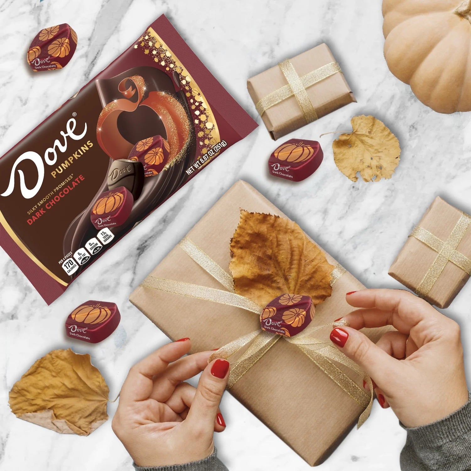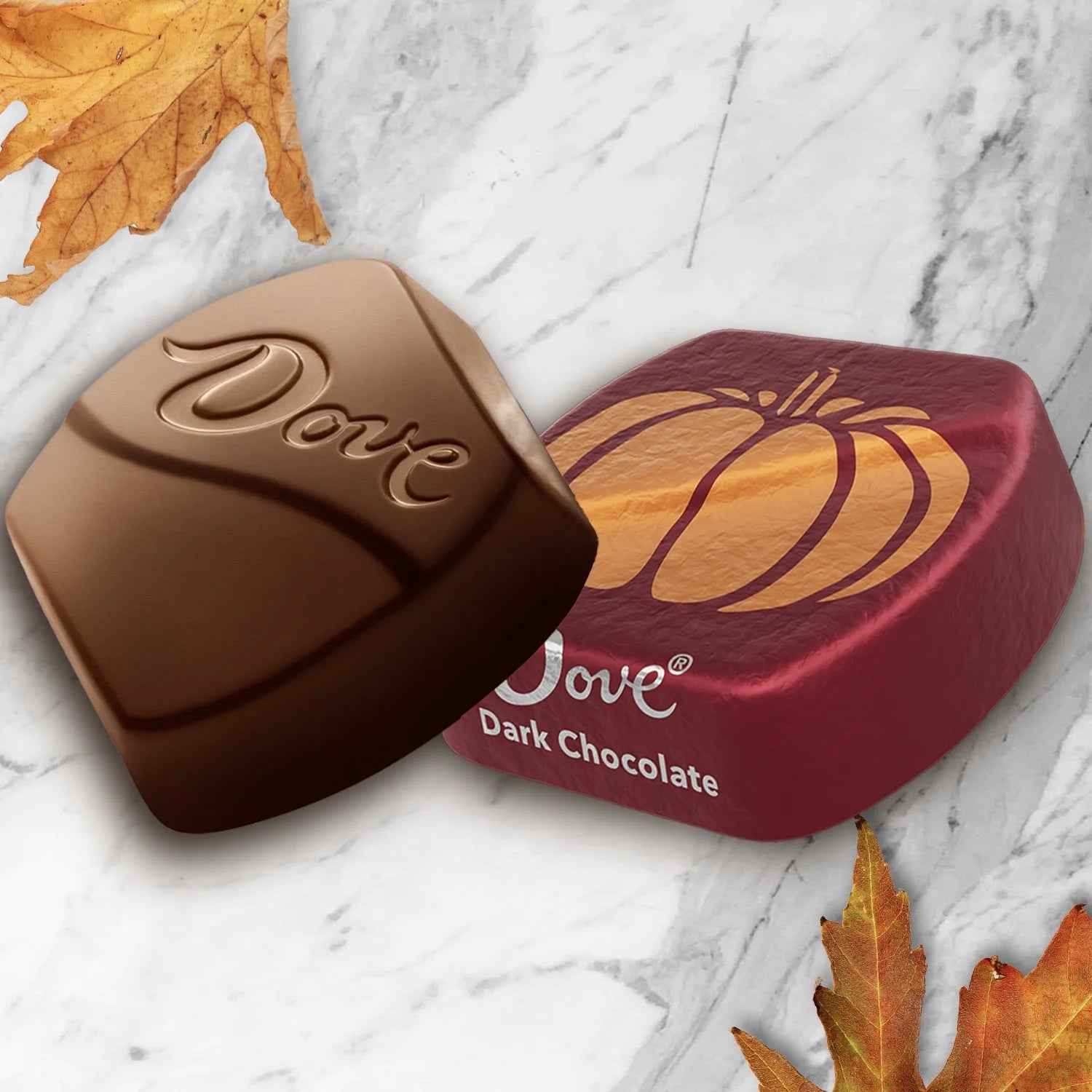 • Individually wrapped in festive pumpkin-decorated foils, DOVE PROMISES elevate candy dishes at home or the office with a premium pop