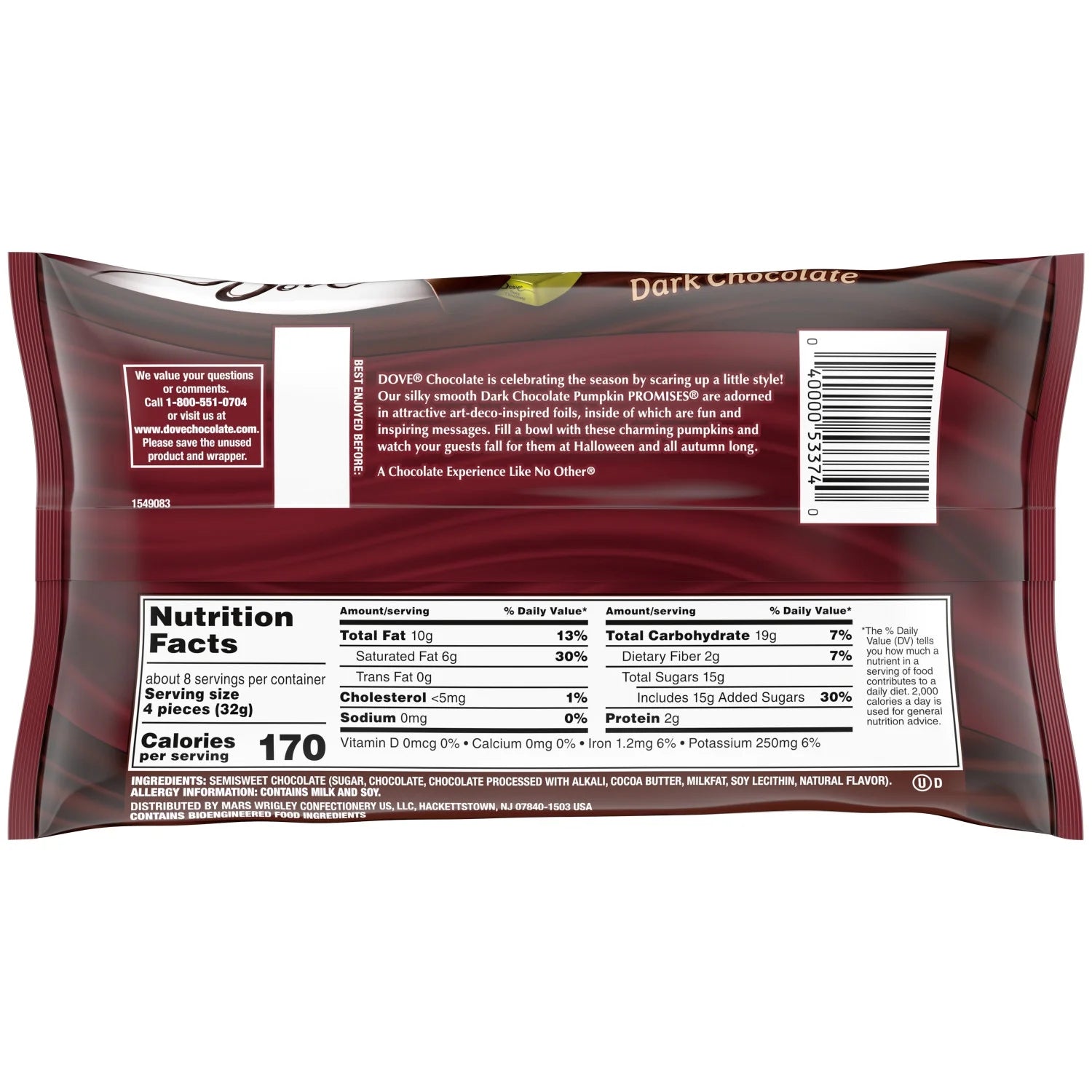 • Contains one (1) 8.87-ounce bag of DOVE PROMISES Dark Chocolate Pumpkin Halloween Candy