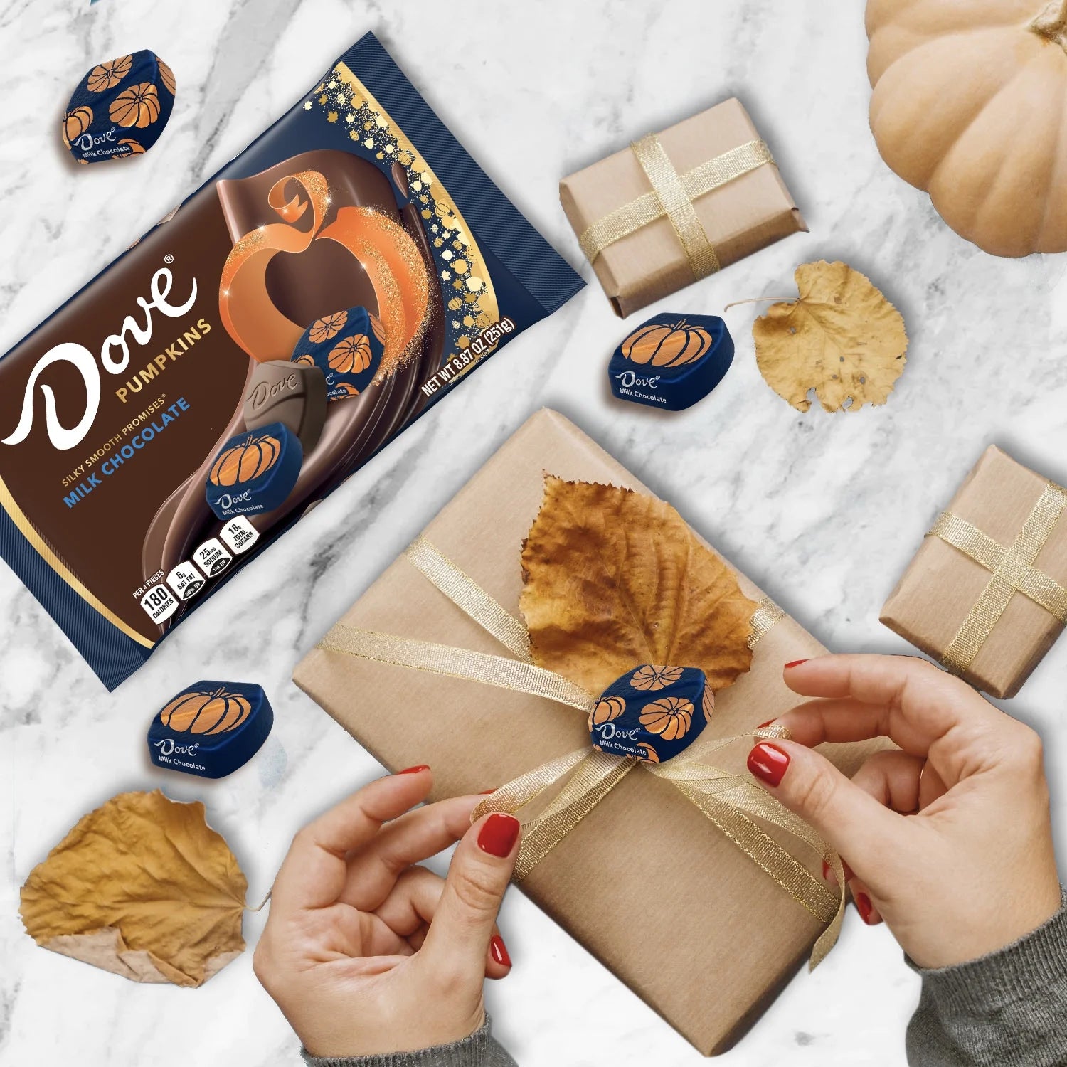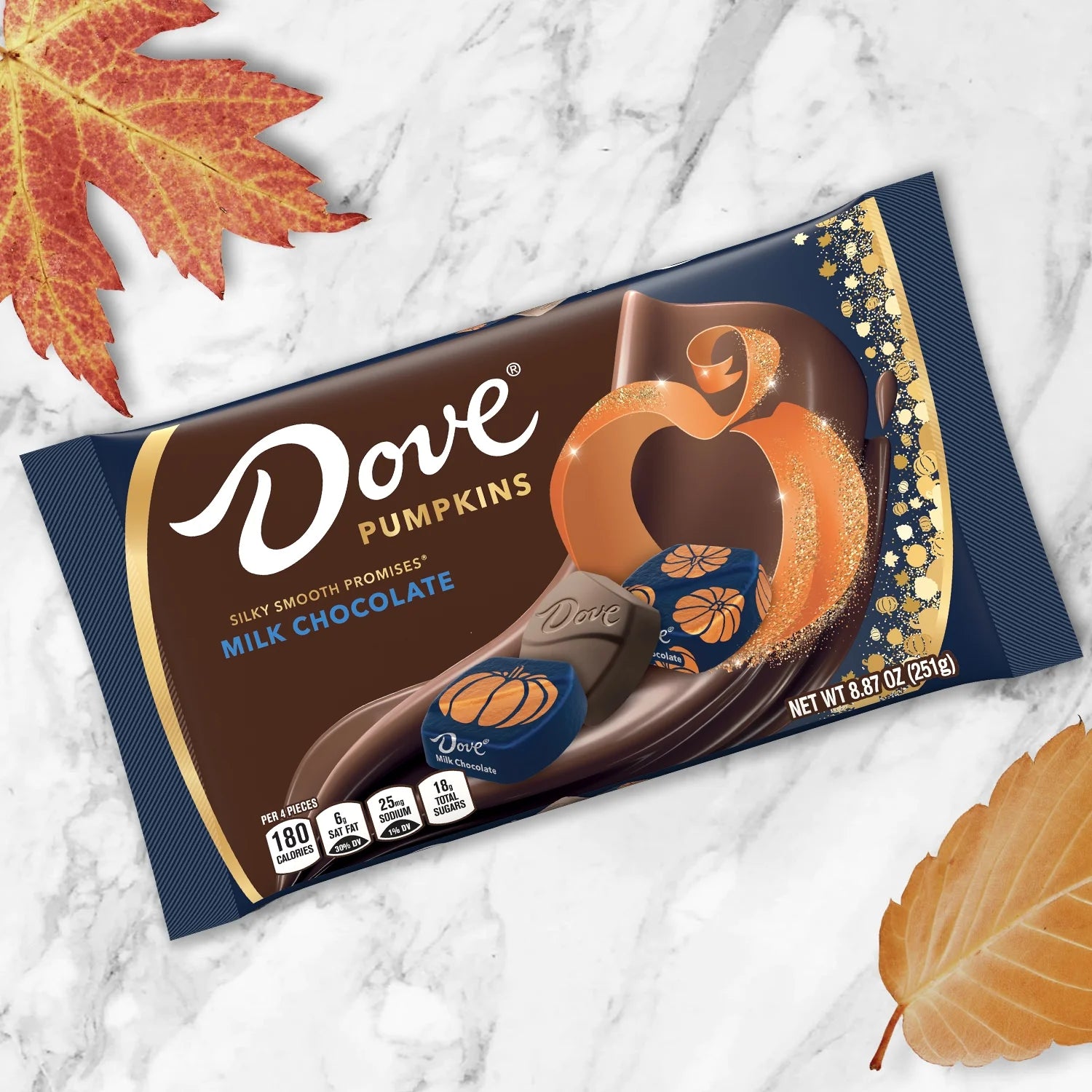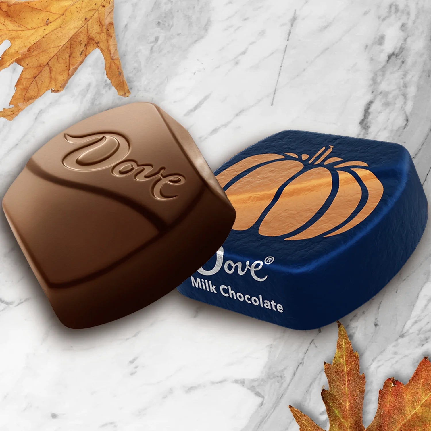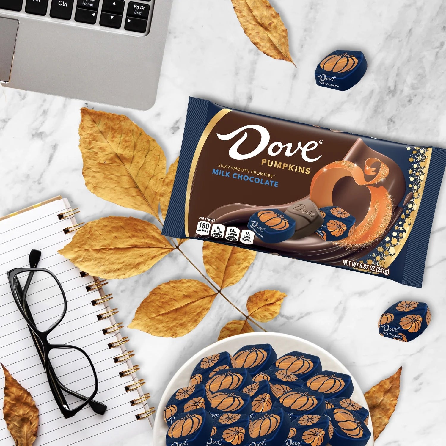 Get ready to add a touch of luxury to your fall! Elevate all your autumn activities with the indulgent pleasure of DOVE PROMISES Milk Chocolate Pumpkin Halloween Candy. Each bite delivers the rich taste of cacao, individually wrapped in festive fall pumpkin designs. Perfect for filling your candy bowl at home or adding to trick-or-treat goodie bags at work, these exquisite chocolates are sure to impress. On a crisp, cool night, gather around the bonfire and elevate the classic s'mores experience by incorporating DOVE PROMISES Milk Chocolate Candy. Cozy up with your favorite Halloween movie and a bowl of DOVE PROMISES chocolates for the ultimate fall treat. This season, indulge in the chocolate delight of DOVE PROMISES Milk Chocolates. Order today and treat yourself to the luxurious flavors of autumn!