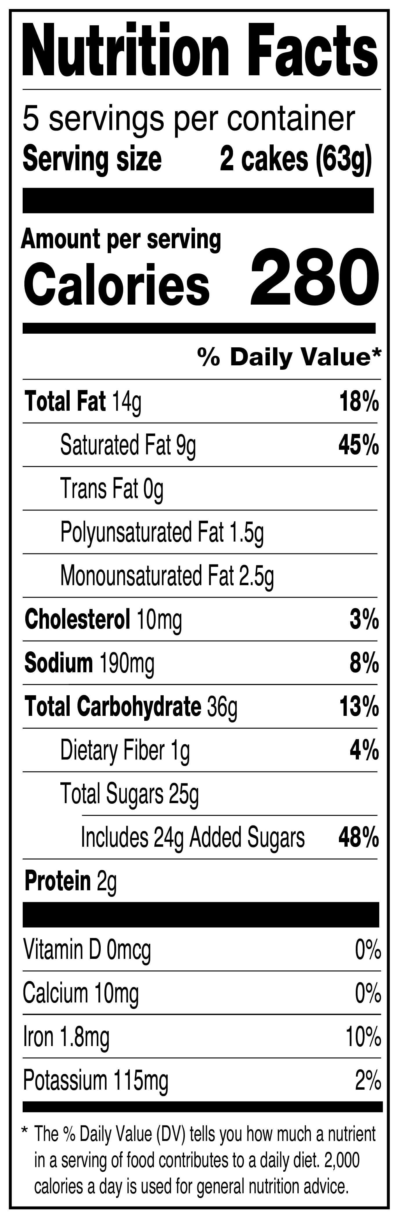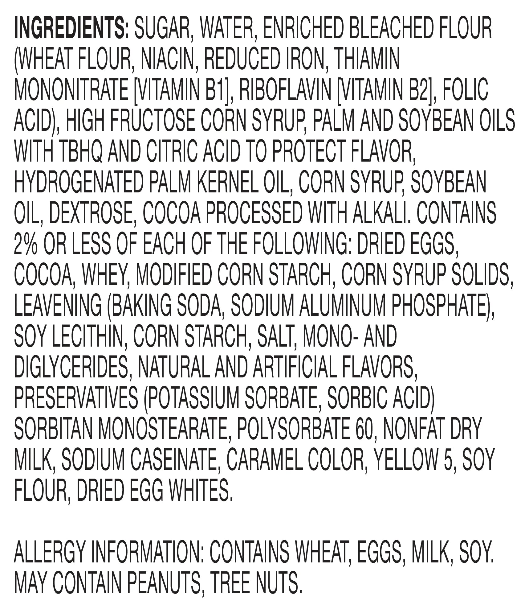 Sugar, Water, High Fructose Corn Syrup, Enriched Bleached Flour (Wheat Flour, Niacin, Reduced Iron, Thiamin Mononitrate [Vitamin B1], Riboflavin [Vitamin B2], Folic Acid), Palm and Soybean Oils with TBHQ and Citric Acid to Protect Flavor, Hydrogenated Palm Kernel Oil, Corn Syrup, Dextrose, Cocoa Processed with Alkali, Cocoa, Soybean Oil. Contains 2% or less of each of the following: Dried Eggs, Whey, Soy Flour, Modified Corn Starch, Corn Syrup Solids, Mono- and Diglycerides, Soy Lecithin, Palm Oil, Corn Starch, Salt, Preservatives (Sorbic Acid, Potassium Sorbate), Leavening (Baking Soda, Sodium Aluminum Phosphate), Natural and Artificial Flavors,Sorbitan Monostearate, Polysorbate 60, Sodium Caseinate, Nonfat Dry Milk, Buttermilk, Calcium Caseinate./div>