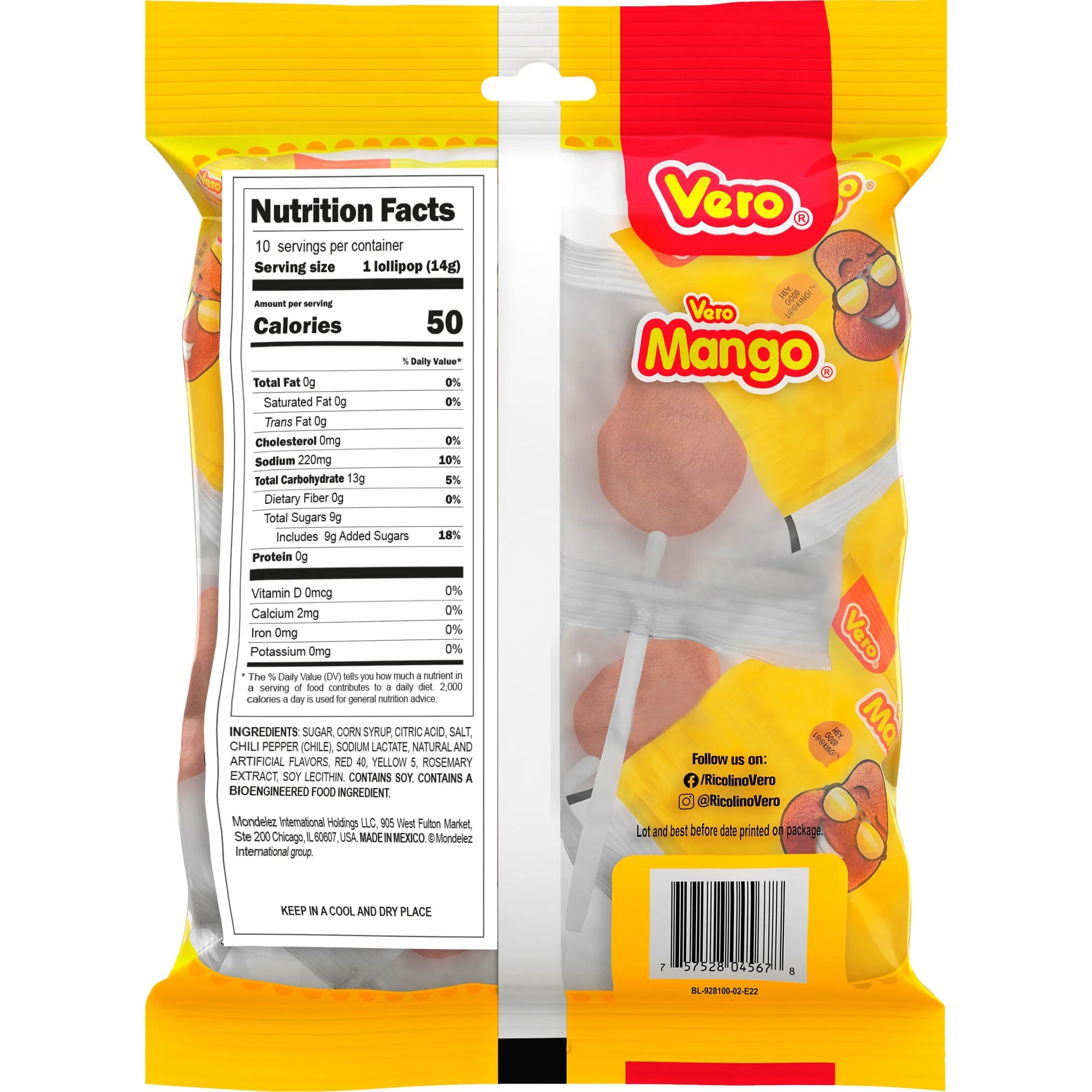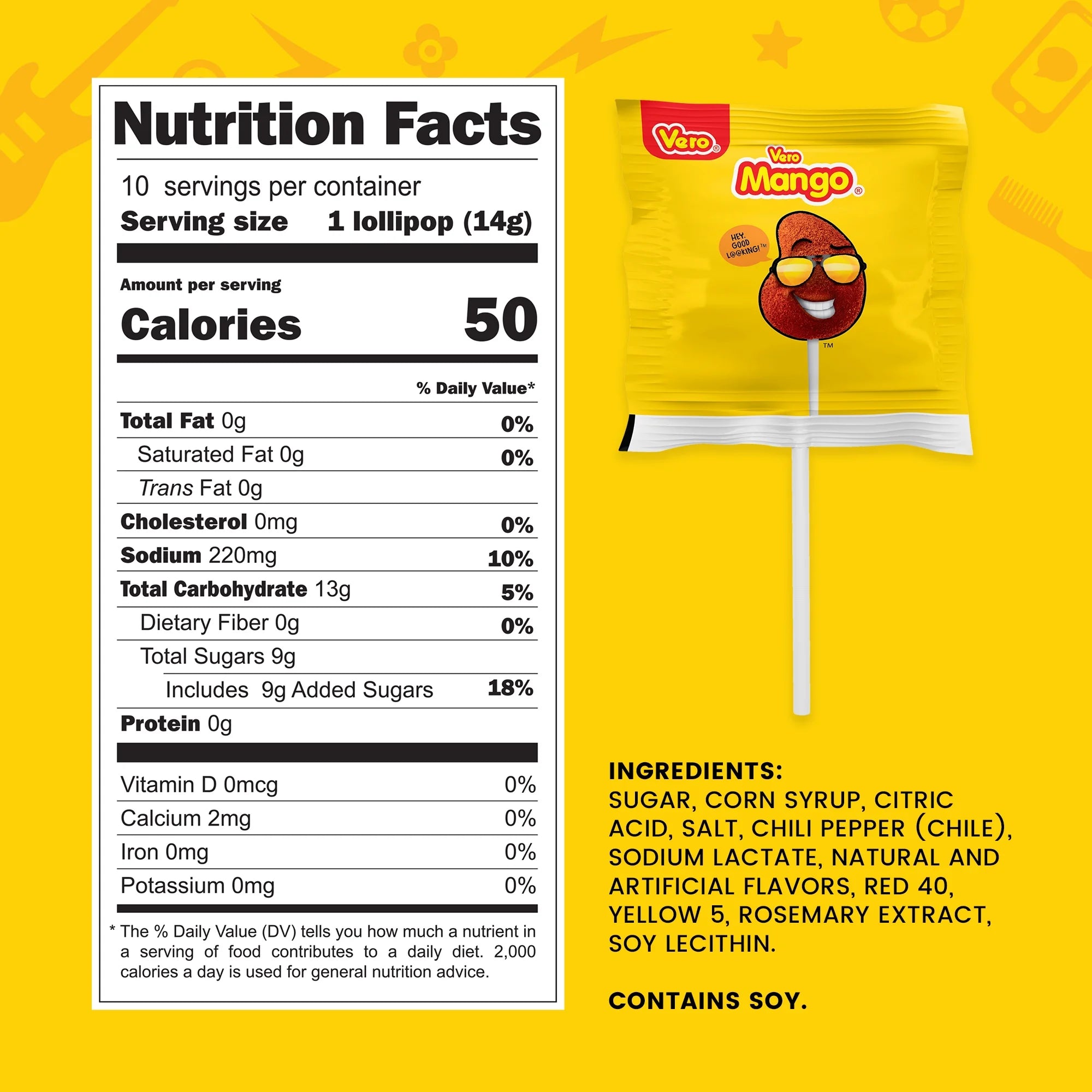 Discover the unique flavors of Dulces Vero Mango Candy Lollipops! These lollipops offer a blend of sweet, spicy, and chewy sensations. Starting with a mildly spicy chili powder coating, they transition into deliciously sweet mango candy. 10-count of individually wrapped for convenience, they’re perfect for enjoying at home or on the go. Whether for fiestas, piñatas, Halloween, or holiday treats, this Mexican candy bag is ideal for sharing the spicy-sweet experience of Vero Mango Candy Lollipops with family and friends. Contains no peanuts.