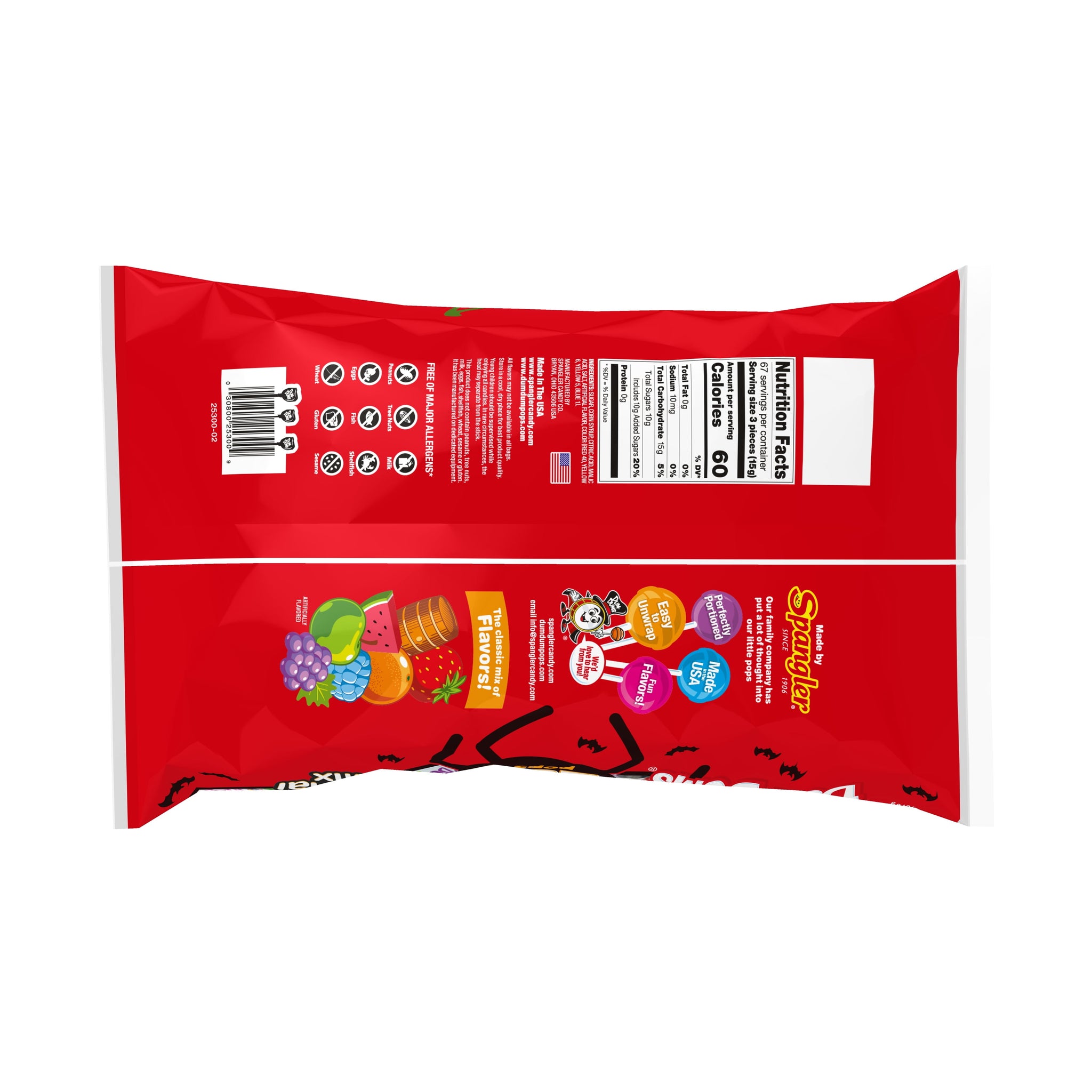 Make Halloween POP! Add this all-time Halloween favorite to your basket of Halloween treats. Halloween isn’t the same without Dum-Dums. Up to sixteen flavors are included in each pack including delicious fruity flavors like Blu Raspberry, Fruit Punch, Watermelon, Pineapple, Cherry and Sour Apple. You’ll also find all-time favorites like Cream Soda, Root Beer and Butterscotch. And don’t forget the famous Mystery Flavor which will keep you guessing! Dum-Dums are free of the top eight food allergens and they’re Kosher certified. These little pops are the just right size for your trick-or-treaters, big and small. Everyone can find a favorite flavor. Dum-Dums 200ct® are made by Spangler®, a family company making family treats since 1906. Dum-Dums, Make Life POP!