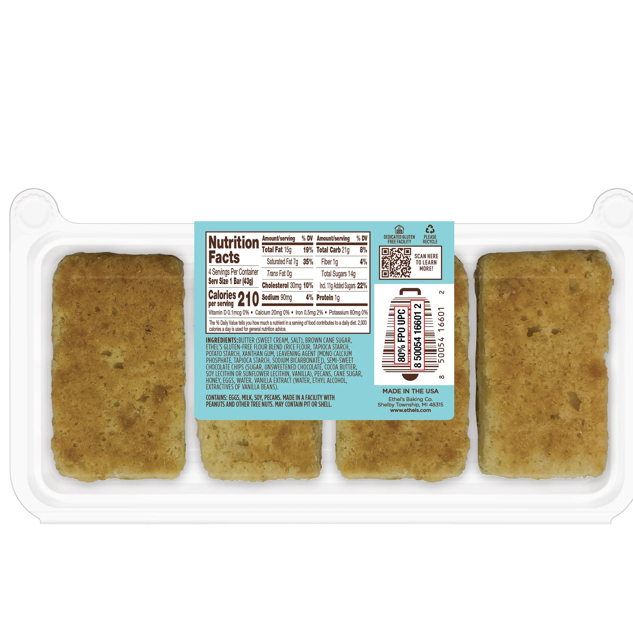 Butter (sweet cream, salt), brown cane sugar, Ethel’s Gluten Free Flour Blend (rice flour, tapioca starch, potato starch, xanthan gum, leavening agent [mono calcium phosphate, tapioca starch, sodium bicarbonate]), semi-sweet chocolate chips (sugar, unsweetened chocolate, cocoa butter, soy lecithin or sunflower lecithin, vanilla), pecans, cane sugar, honey, eggs, water, vanilla extract (water, ethyl alcohol, extractives of vanilla beans)./div>