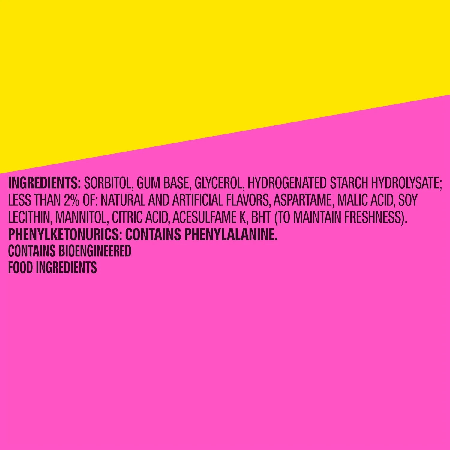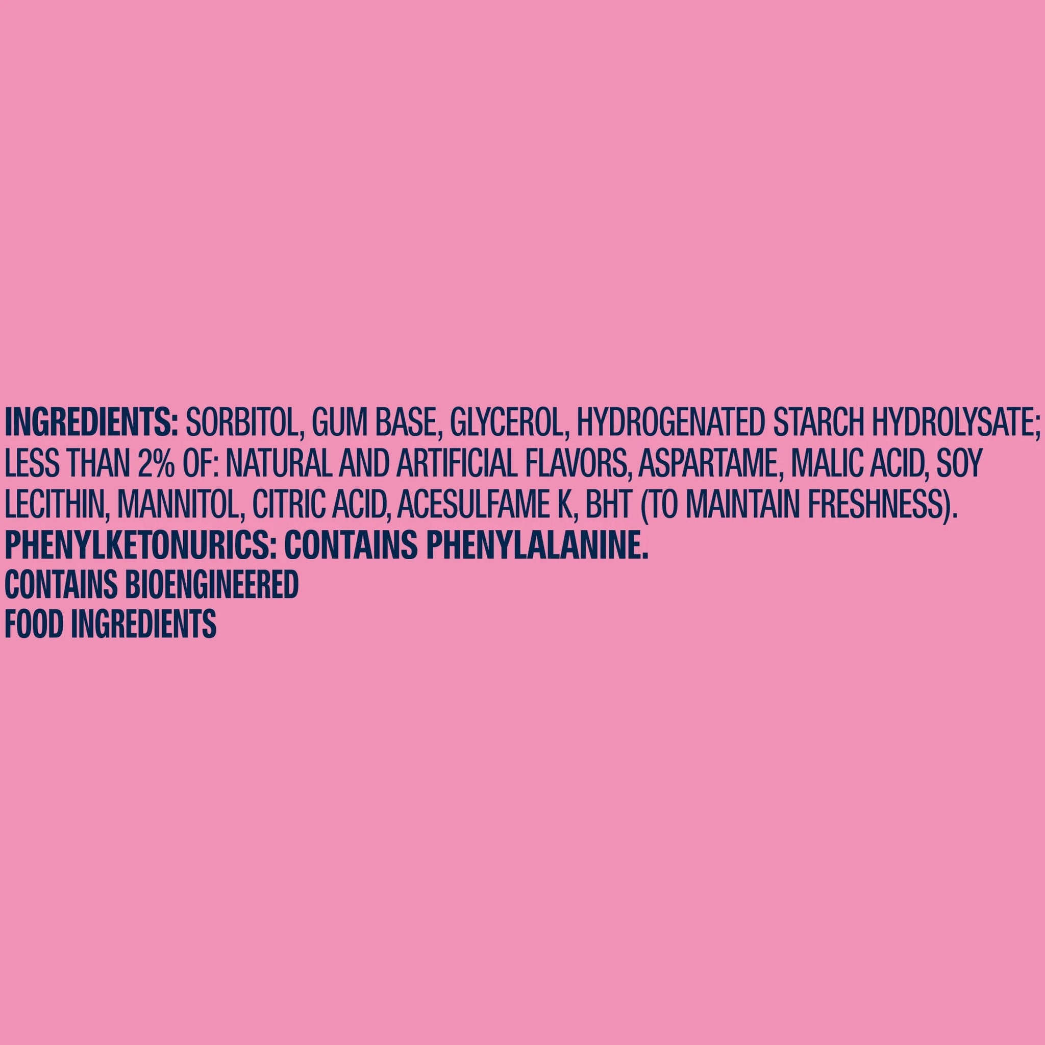 SORBITOL, GUM BASE, GLYCEROL, HYDROGENTATED STARCH HYDROLYSATE; LESS THAN 2% OF: NATURAL AND ARTIFICIAL FLAVORS, ASPARTAME, MALIC ACID, SOY LECITHIN, MANNITOL, CITRIC ACID, ACESULFAME K, BHT (TO MAINTAIN FRESHNESS)./div>