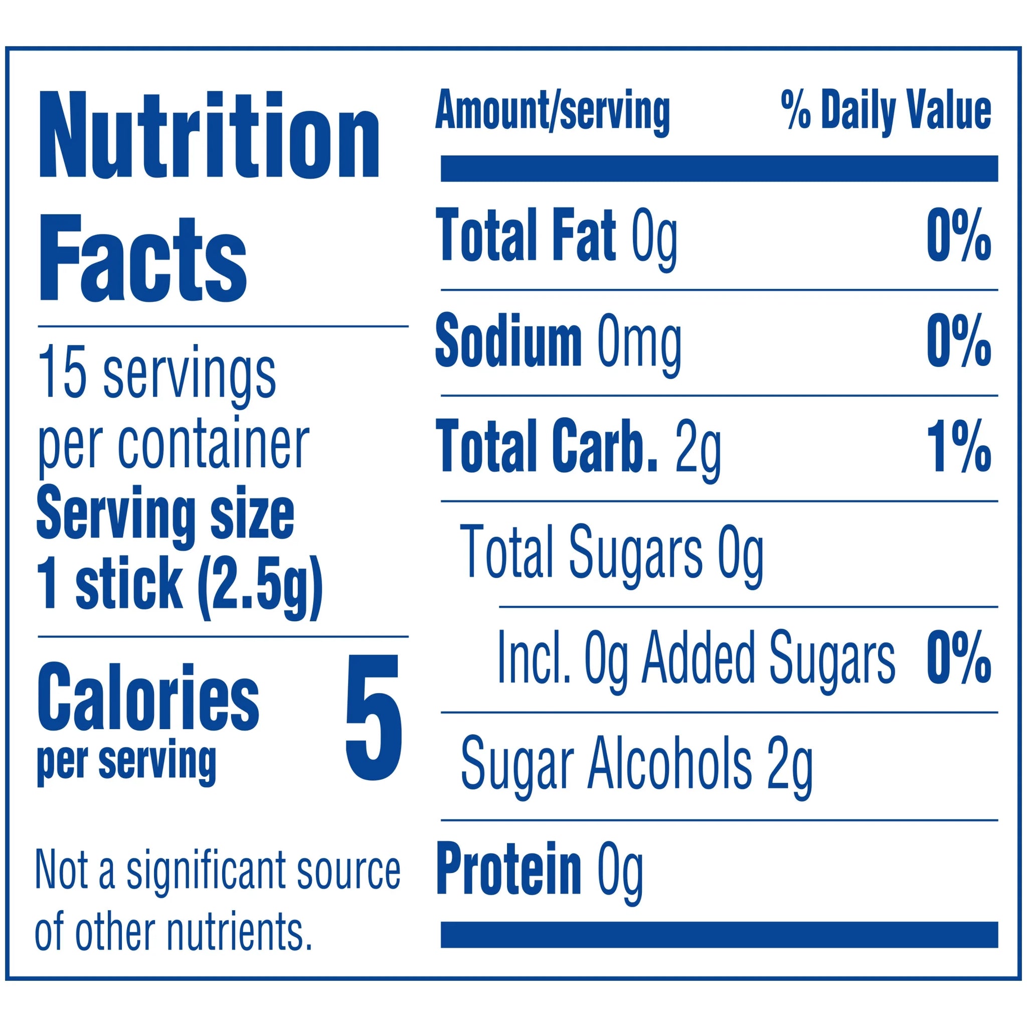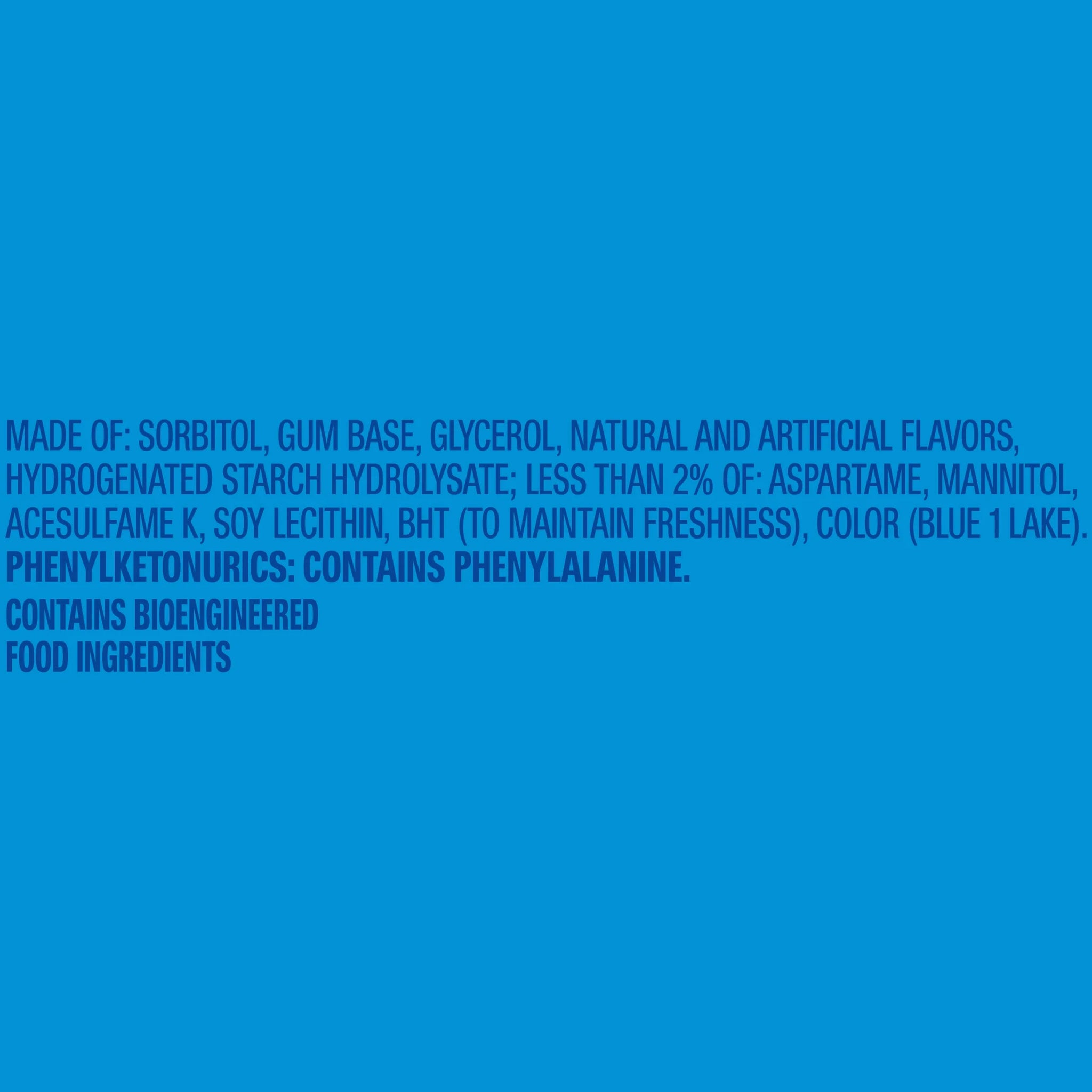 SORBITOL, GUM BASE, GLYCEROL, NATURAL AND ARTIFICIAL FLAVORS, HYDROGENATED STARCH HYDROLYSATE; LESS THAN 2% OF: ASPARTAME, MANNITOL, ACESULFAME K, SOY LECITHIN, BHT (TO MAINTAIN FRESHNESS), COLOR (BLUE 1 LAKE)./div>