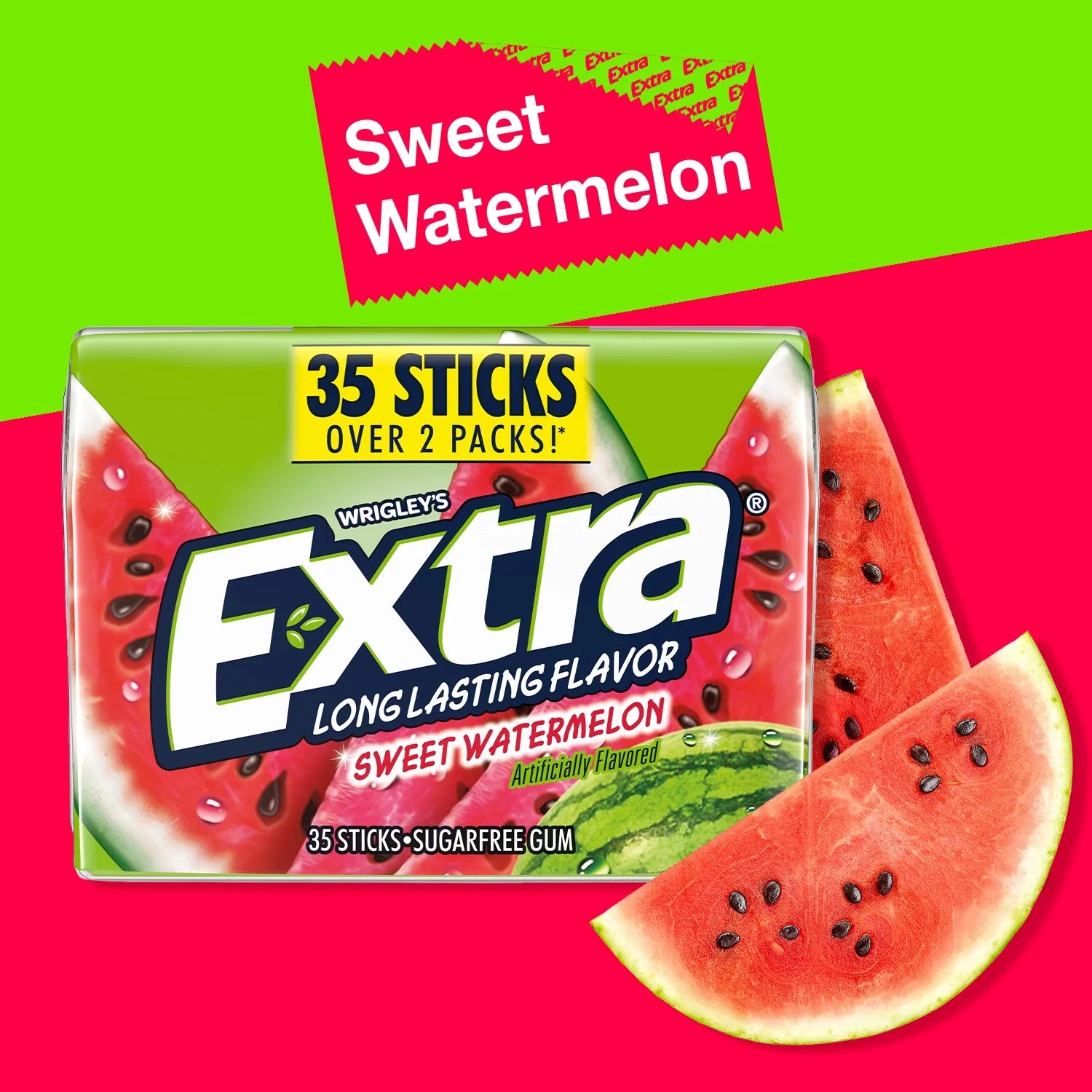The semester may be starting, but that doesn't mean summer has to end. Let the delicious fruity flavor of EXTRA Sweet Watermelon Sugar Free Chewing Gum keep you in the sun a little bit longer. As you prepare for your first day of classes, remember to pack your syllabus, notebooks, pens, and packs of EXTRA Sweet Watermelon chewing gum. Toss this bulk gum pack into your backpack or tote and navigate through campus confidently and with breath. To loved ones who want to send a college care package, make sure you add EXTRA Sweet Watermelon Sugar-Free Gum to the box. This EXTRA Sweet Watermelon 35-stick bulk gum pack is the perfect addition to your school supplies and dorm decor. Start the year off with a chew! Add this bulk pack to your cart today.
