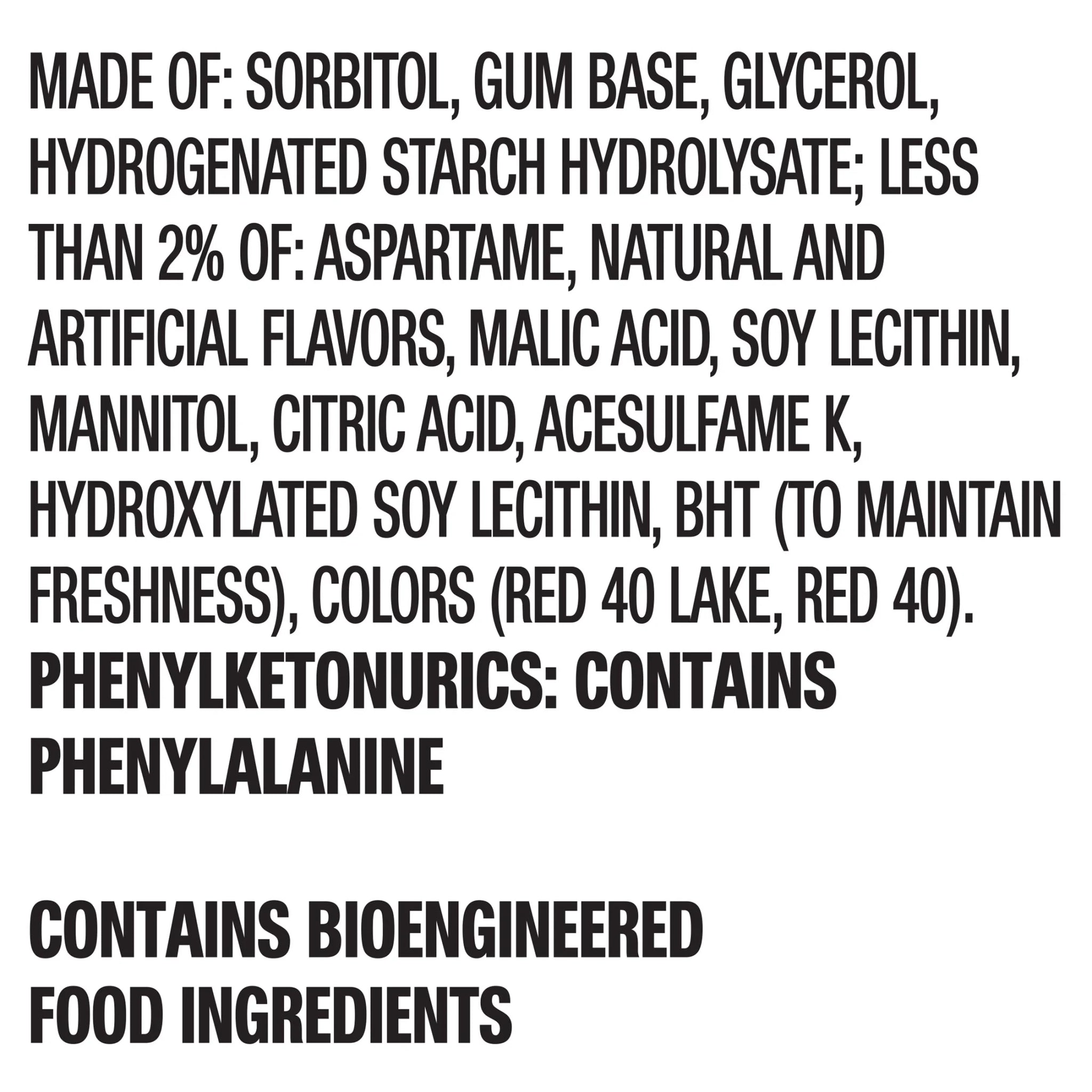 Sorbitol, Gum Base, Glycerol, Hydrogenated Starch Hydrolysate; Less than 2% of: Aspartame, Natural and Artificial Flavors, Malic Acid, Soy Lecithin, Mannitol, Citric Acid, Acesulfame K, Hydroxylated Soy Lecithin, BHT (to Maintain Freshness), Colors (Red 40 Lake, Red 40)./div>