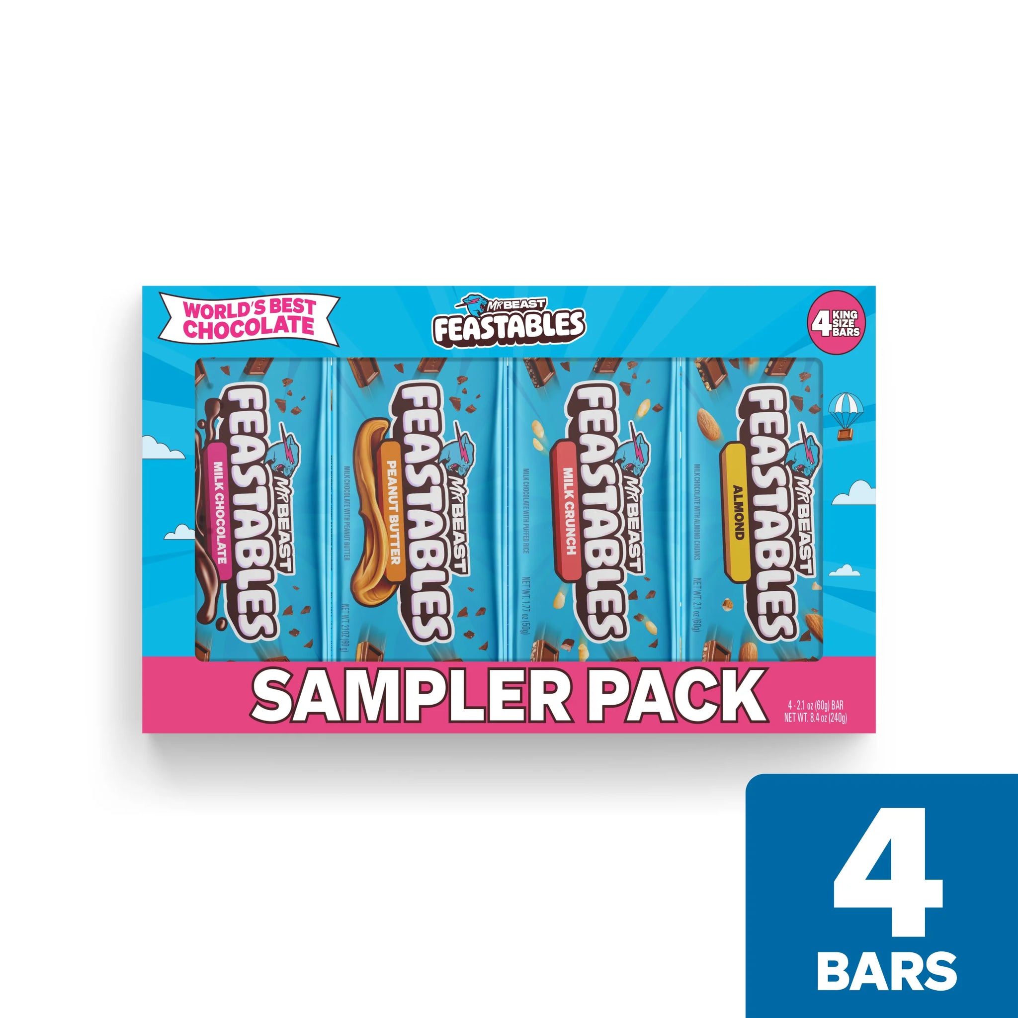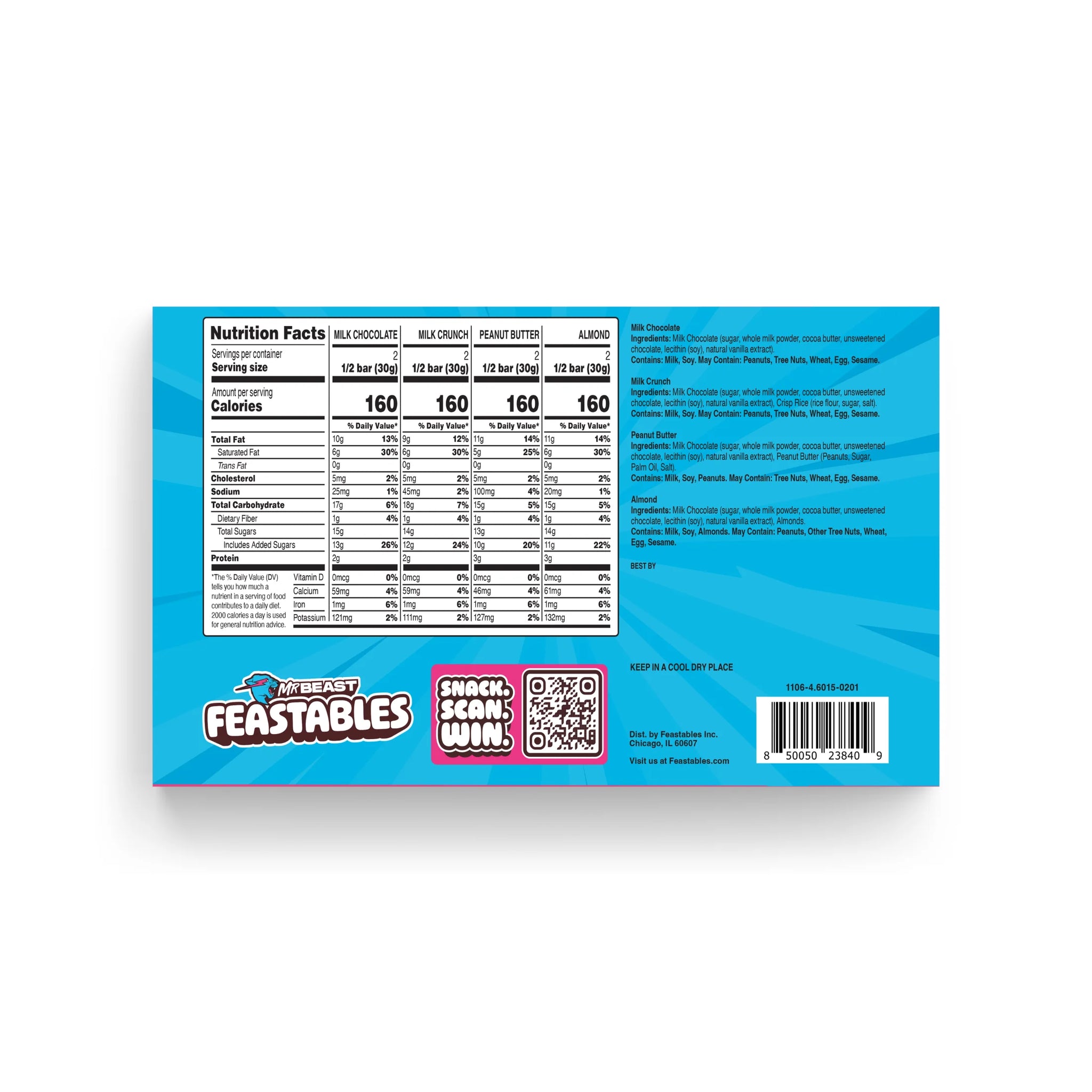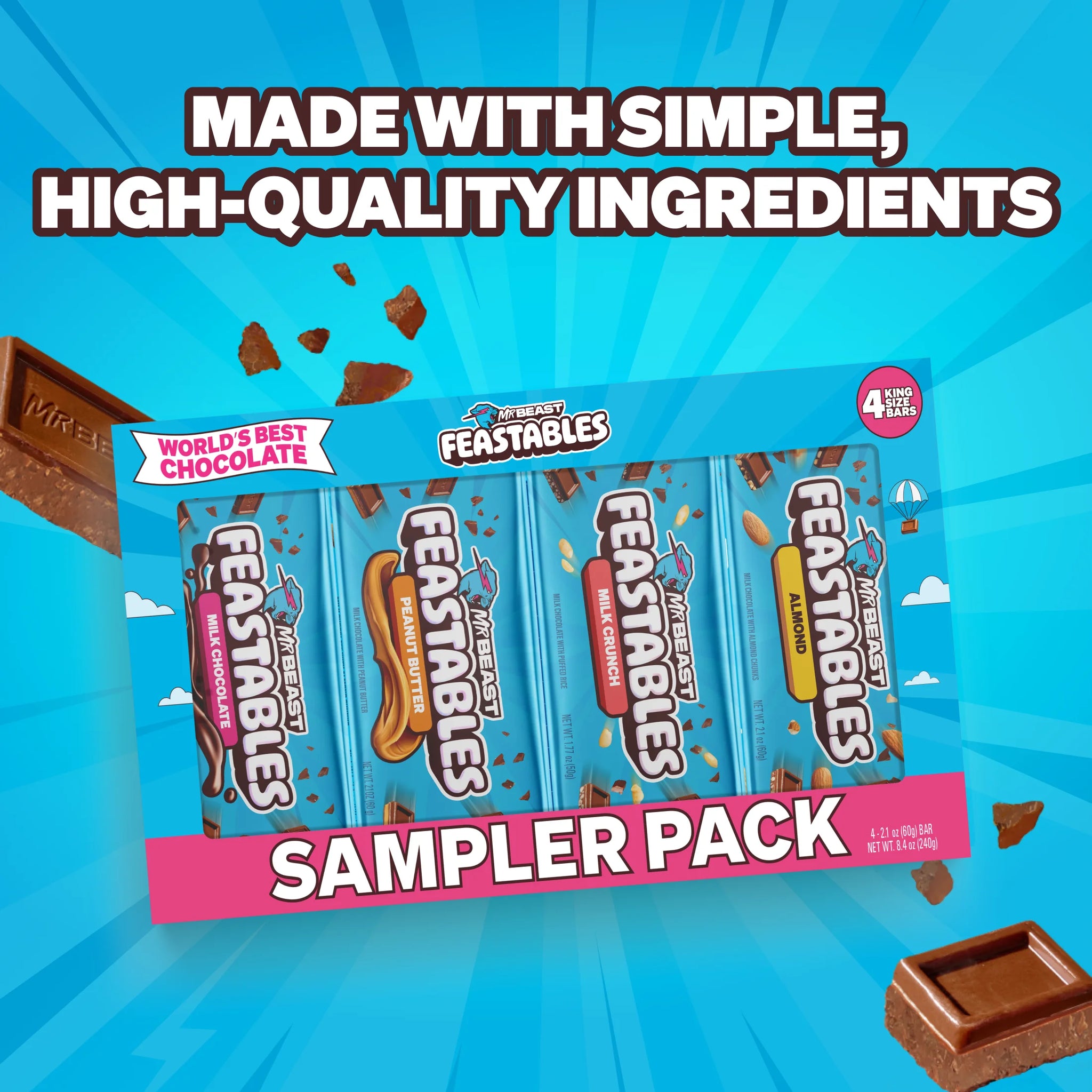 Indulge in the new and improved Feastables MrBeast Milk Chocolate Bars. Crafted with a reformulated recipe for a richer and more delectable flavor experience. This variety pack includes four delicious chocolate bars, each crafted with a reformulated recipe for a richer and more delectable flavor experience. From creamy peanut butter to crunchy almonds and crispy puffed rice, there's something for every craving in this assortment. The new formula features simple, high-quality ingredients resulting in a deliciously satisfying chocolate snack. Share the joy with this shareable treat, perfect for satisfying cravings and relishing sweet moments. Gluten free and made with simple ingredients.