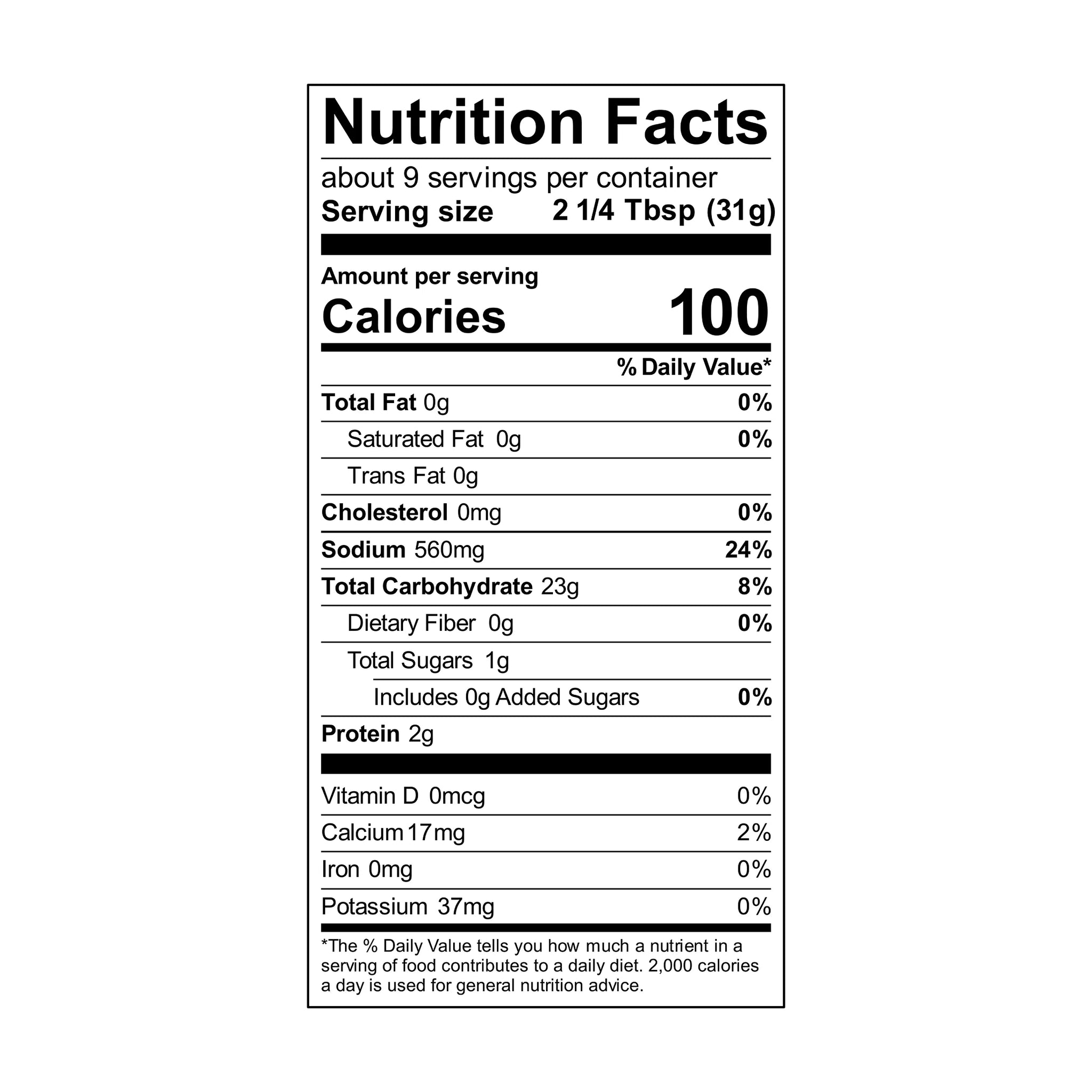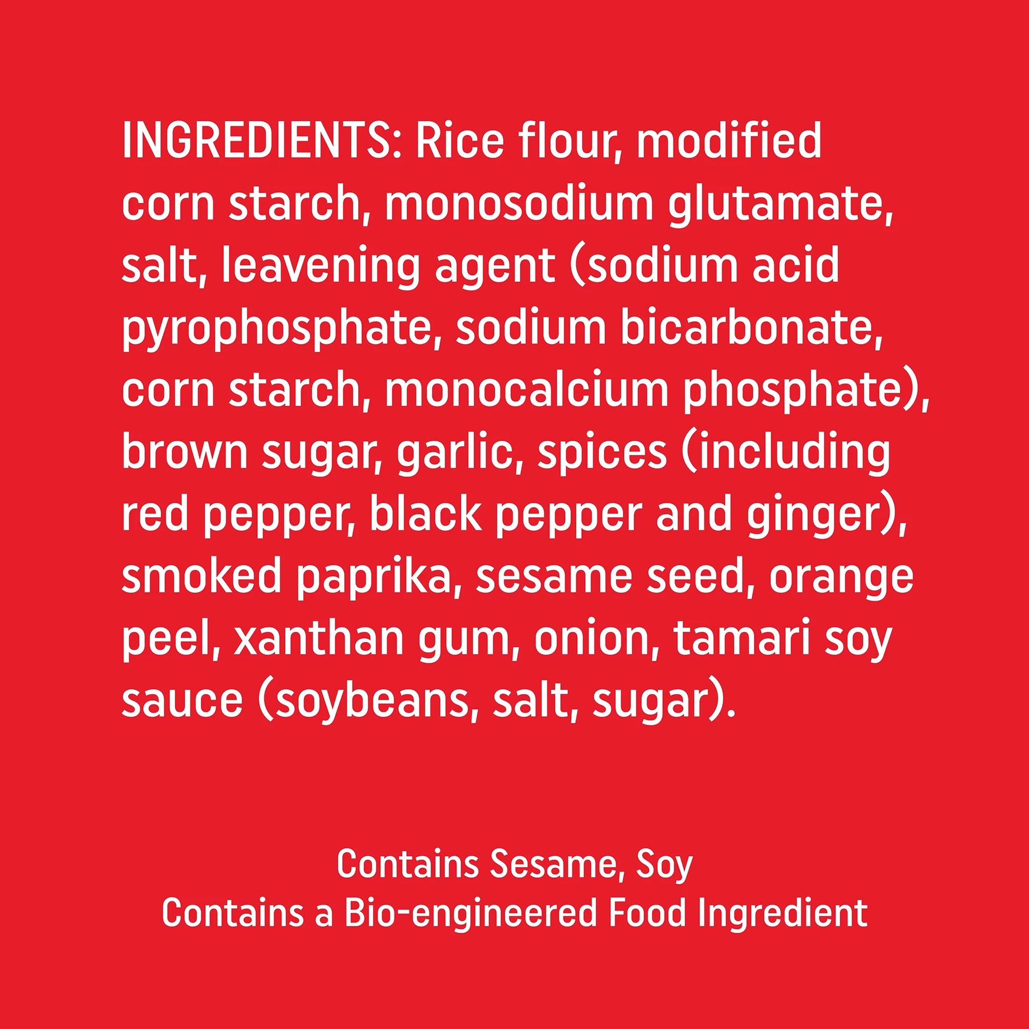 Rice Flour, Corn Starch, Monosodium Glutamate, Salt, Leavening Agent (Sodium Acid Pyrophosphate, Sodium Bicarbonate, Corn Starch, Monocalcium Phosphate), Brown Sugar, Garlic, Spices (Including Red Pepper, Black Pepper and Ginger), Sesame Seed, Smoked Paprika, Orange Peel, Xanthan Gum, Onion and Soy Sauce Powder (Wheat, Soybeans, Salt). Contains a Bio-Engineered Food Ingredient (Cornstarch)./div>