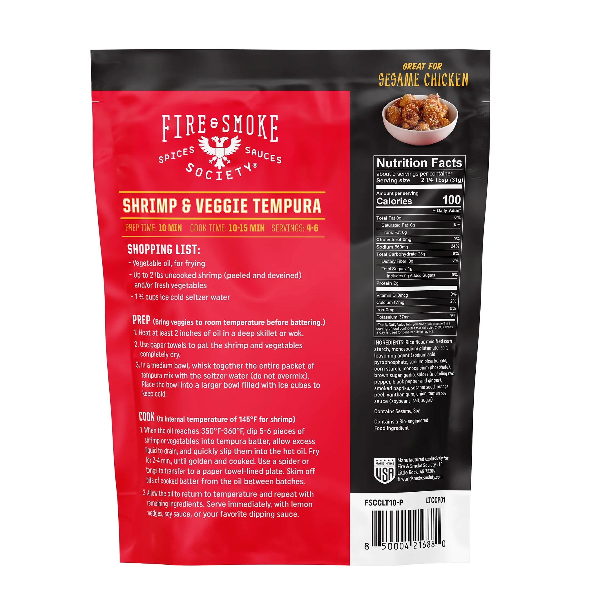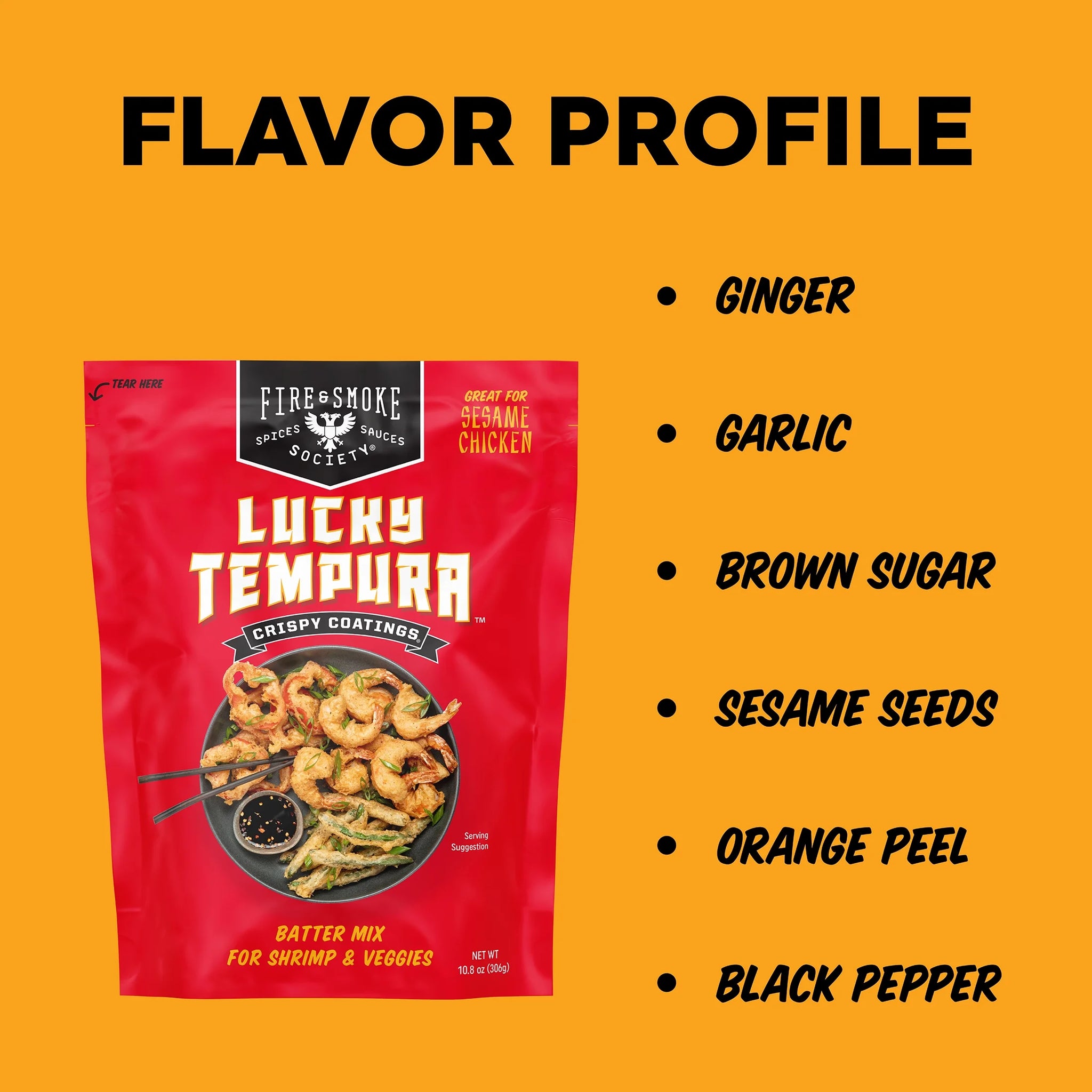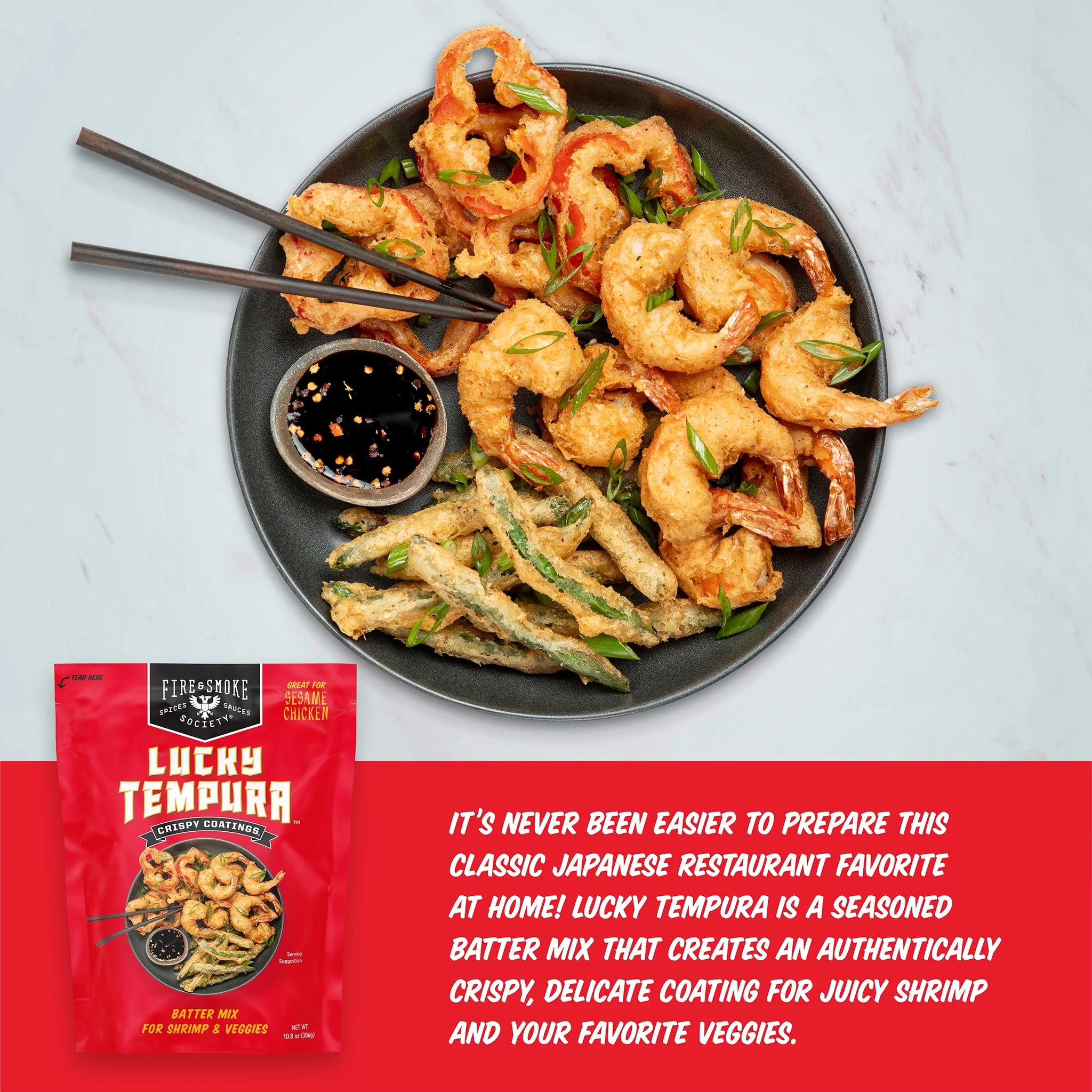 - Fire & Smoke Society Lucky Tempura seasoned flour is a delicious, seasoned batter mix that creates an authentically crispy, delicate coating for juicy shrimp and your favorite veggies.