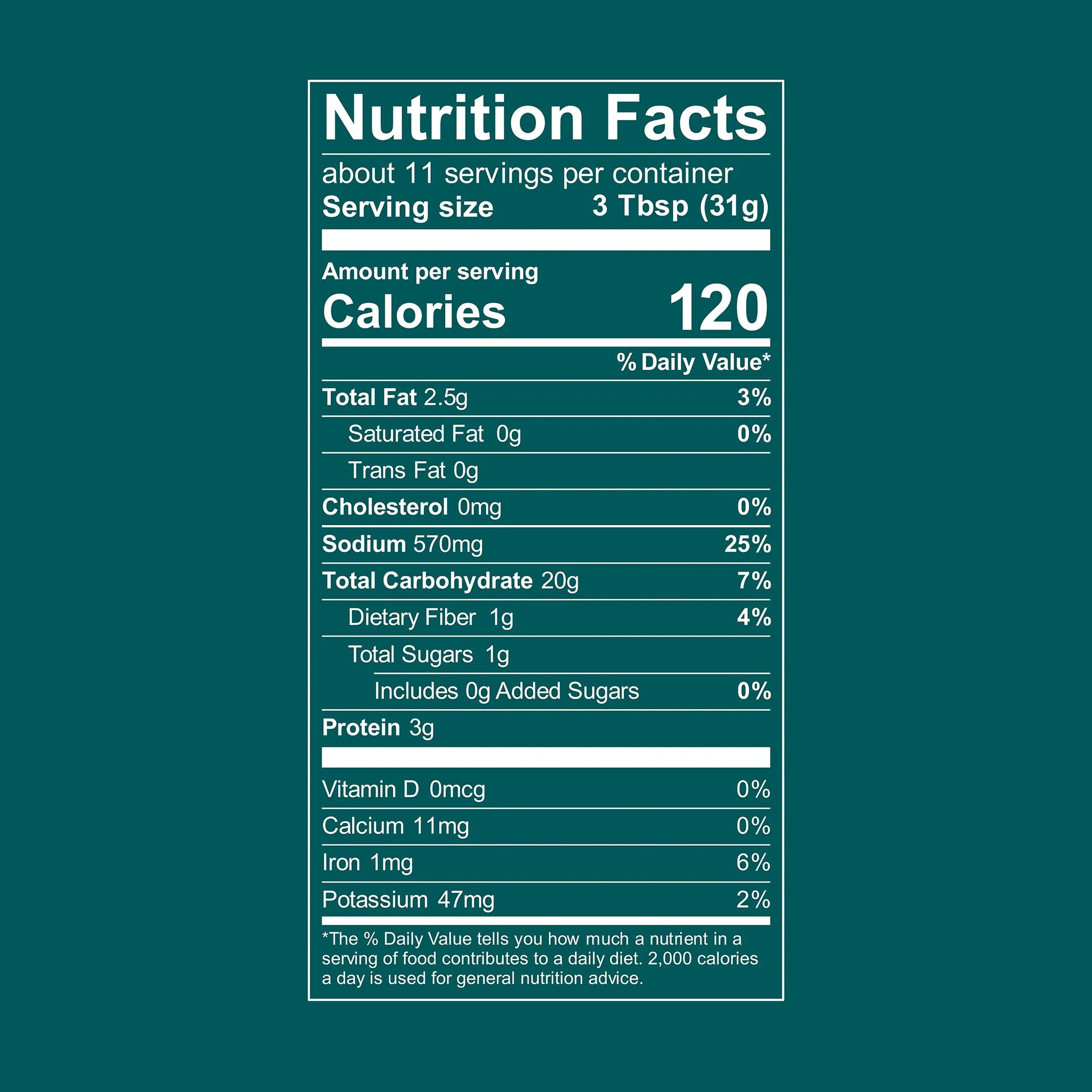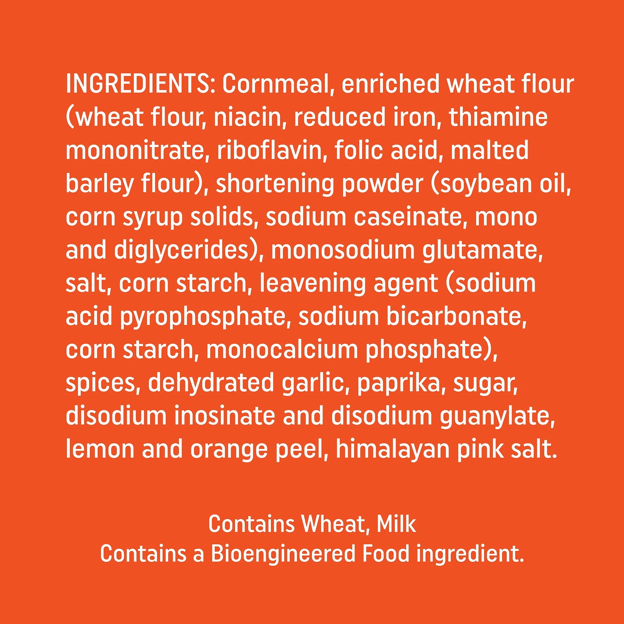 Cornmeal, enriched wheat flour (wheat flour, niacin, reduced iron, thiamine mononitrate, riboflavin, folic acid), monosodium glutamate, salt, corn starch, leavening agent (sodium acid pyrophosphate, sodium bicarbonate, corn starch, monocalcium phosphate), spices, dehydrated garlic, paprika, sugar, disodium inosinate and disodium guanylate, lemon and orange peel, Himalayan pink salt and pink peppercorns. Dairy Free, Nut Free, Plant-based, Soy Free, Vegan. Contains Wheat./div>