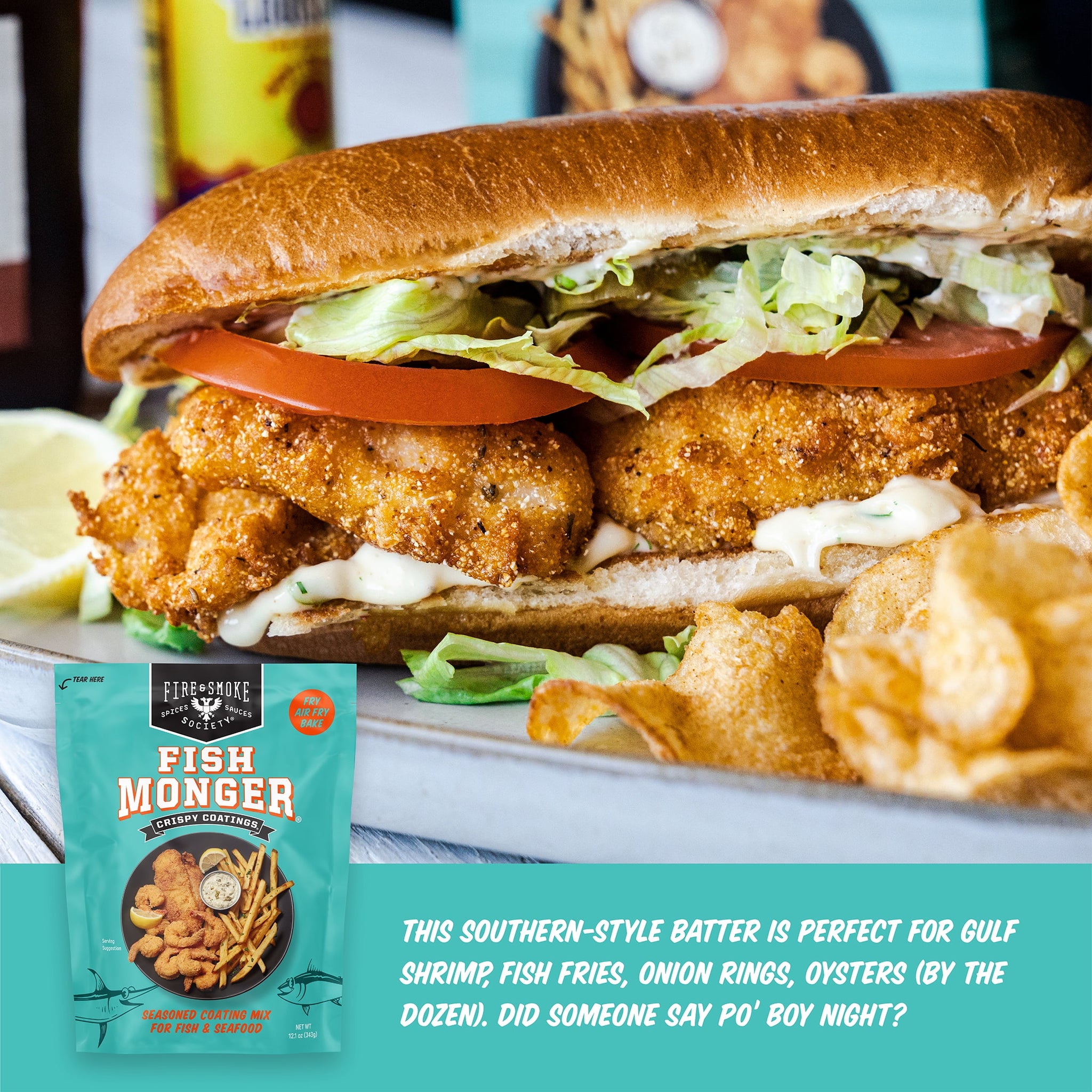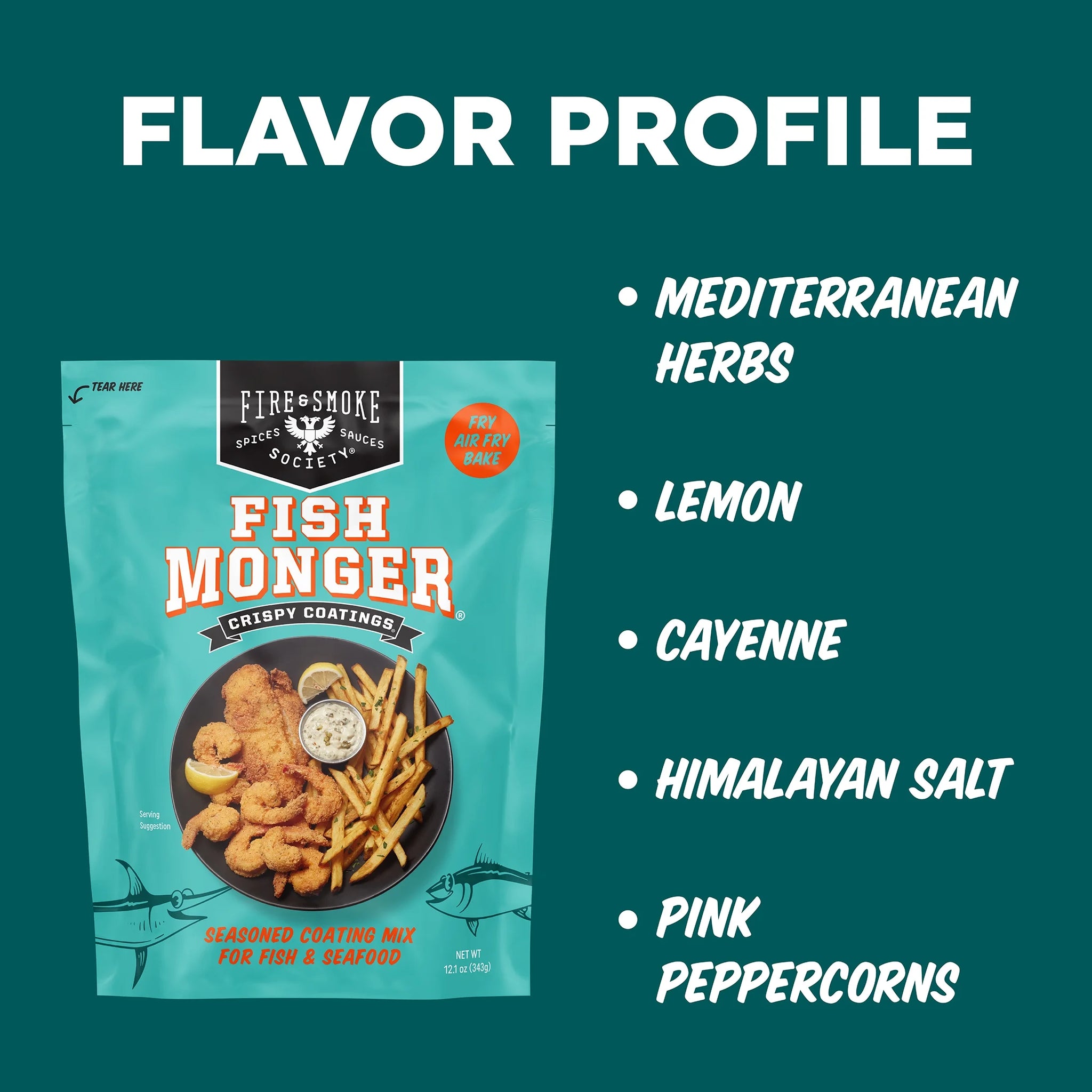 Get ready to elevate your seafood game with Fire & Smoke Society Fish monger fry seasoning mix. Indulge in a taste of the South with this delightful batter. Tailor-made for Gulf shrimp, fried fish, fish fries, onion rings, and even oysters by the dozen. Craving a po' boy night? Look no further! Elevate your culinary experience with the quintessential Southern-style crispy fish fry. This versatile fish seasoning isn't just limited to frying; it's also an excellent choice for baking or air frying. Discover the perfect blend of flavors and textures for a truly authentic Southern feast. Comes in a 12.1 oz bag.