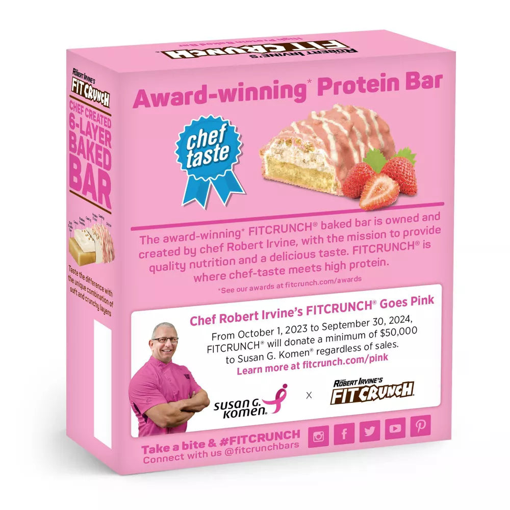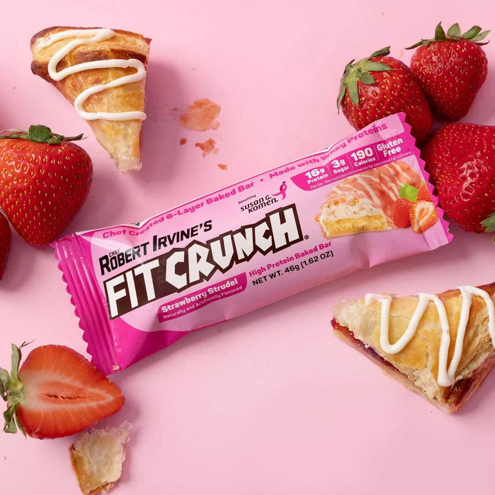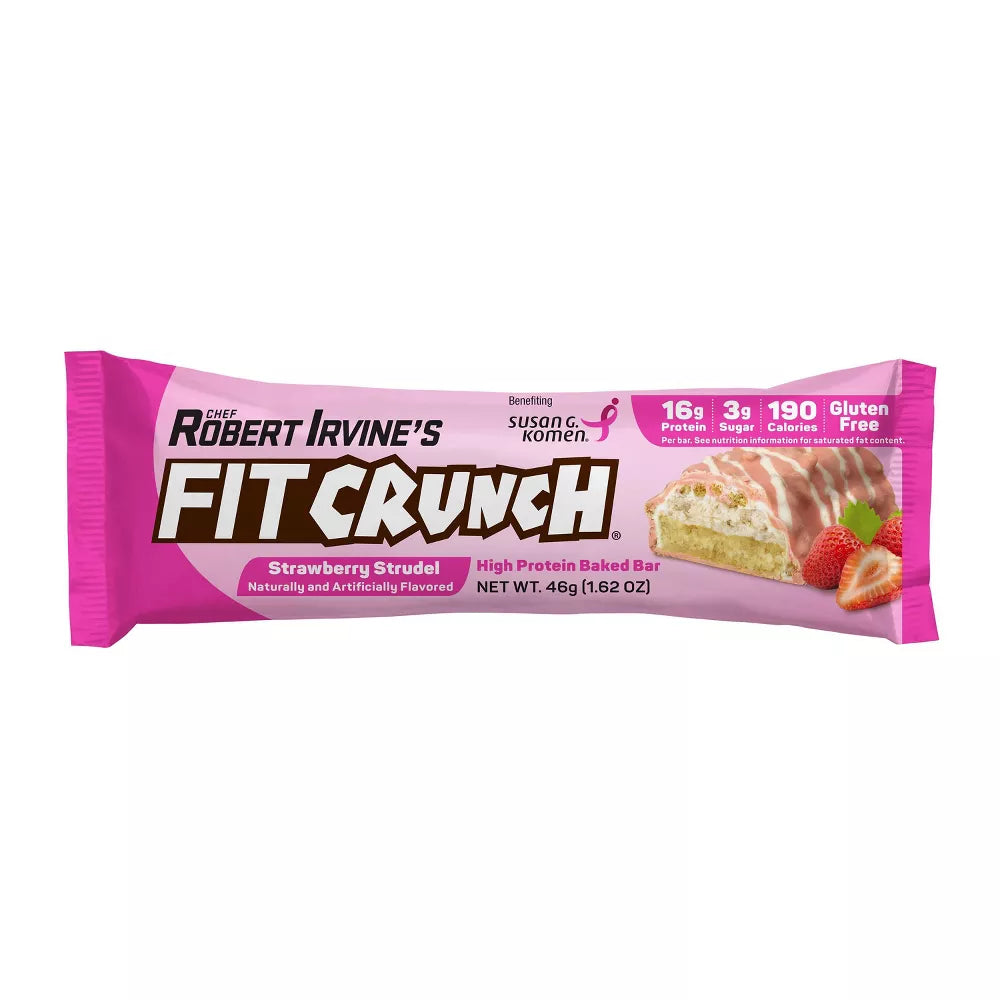 FITCRUNCH Strawberry Strudel, High Protein Baked Bar, 16g Protein, 4ct: Chef Robert Irvine’s FITCRUNCH® Strawberry Strudel protein bar captures the flavor of the classic pastry without the guilt that comes with a sugary bakery treat. On top of a soft-baked cookie bar sits a rich layer of strawberry-flavored cream, smooth layers of white chocolate, graham cracker pieces for a crunch, and topped with a drizzle for some pizzaz. The Strawberry Strudel bar satisfies cravings with an unmatched taste that you’d only expect from a world-renowned chef. FITCRUNCH® makes getting your protein more enjoyable than ever before.