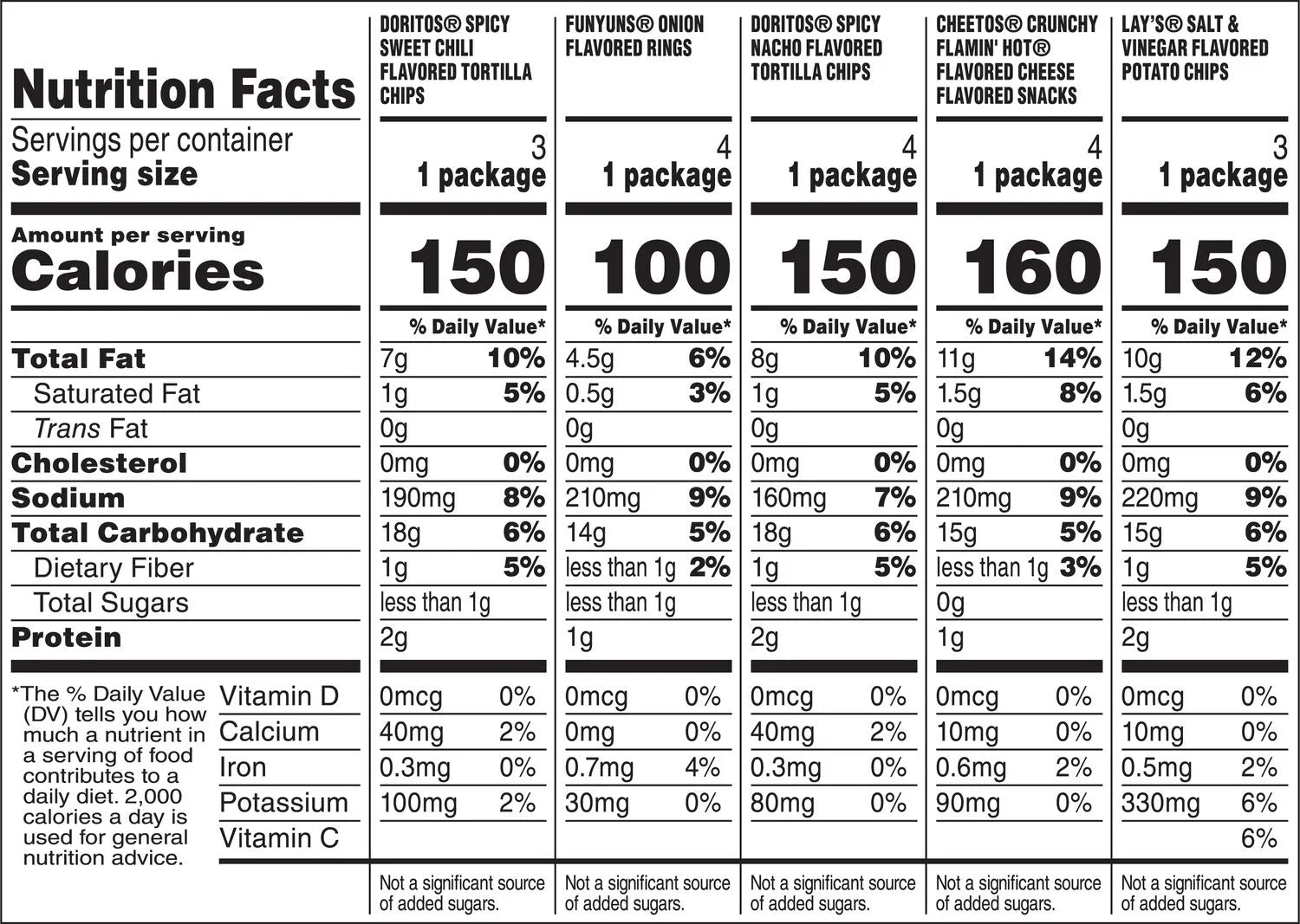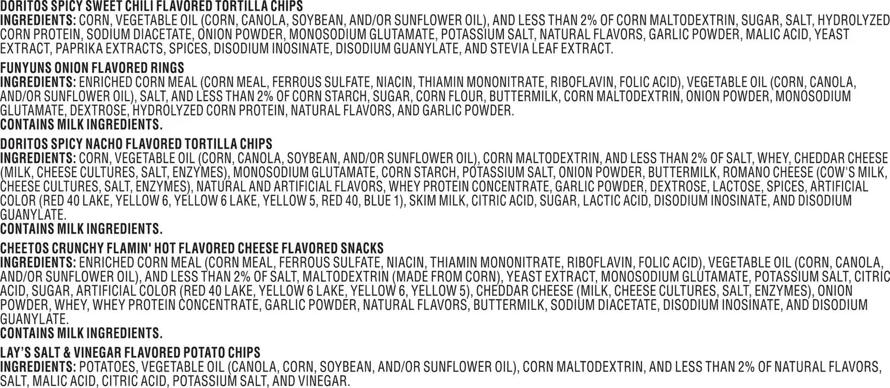 - Includes Cheetos Flamin' Hot Crunchy cheese snacks, Lay's Salt and Vinegar flavored potato chip, Doritos Spicy Sweet Chili flavored potato chips, Funyuns onion flavored rings snacks, and Doritos Spicy Nacho flavored tortilla chips