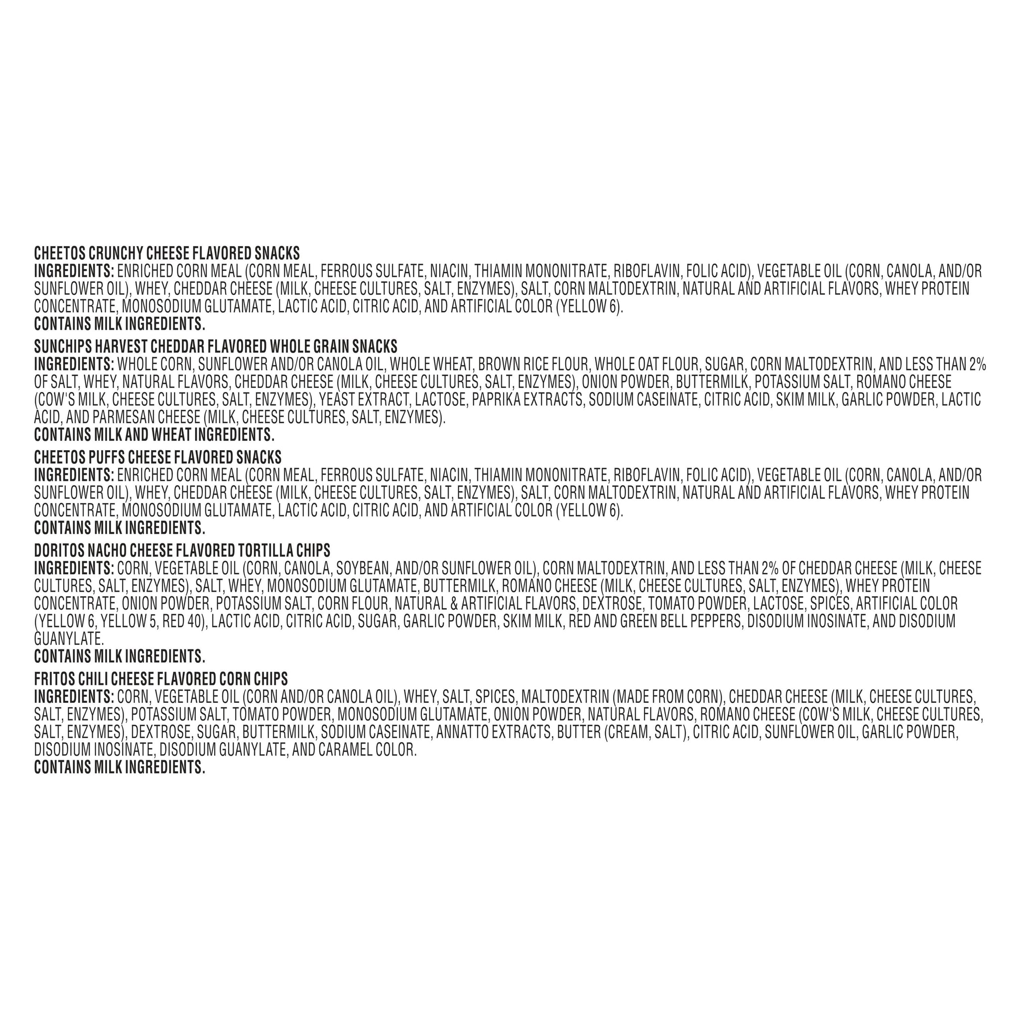 Frito-Lay Cheesy Mix Variety Pack, Frito-Lay Variety Packs provides the perfect portion size and variety to keep your entire family happy. No matter what the occasion from stocking the pantry, to your next family party, to the lunch box, or even a desk break, all you have to do is grab a pack and go! With a wide variety of flavors, there is something for everyone to snack on in an easy to grab, individual package.Shelf-Stable / Ambient. Multipack Retail Packaging. Frito-Lay Chips and Snacks. Perfect for on the go snacking and adventures the whole family can enjoy!