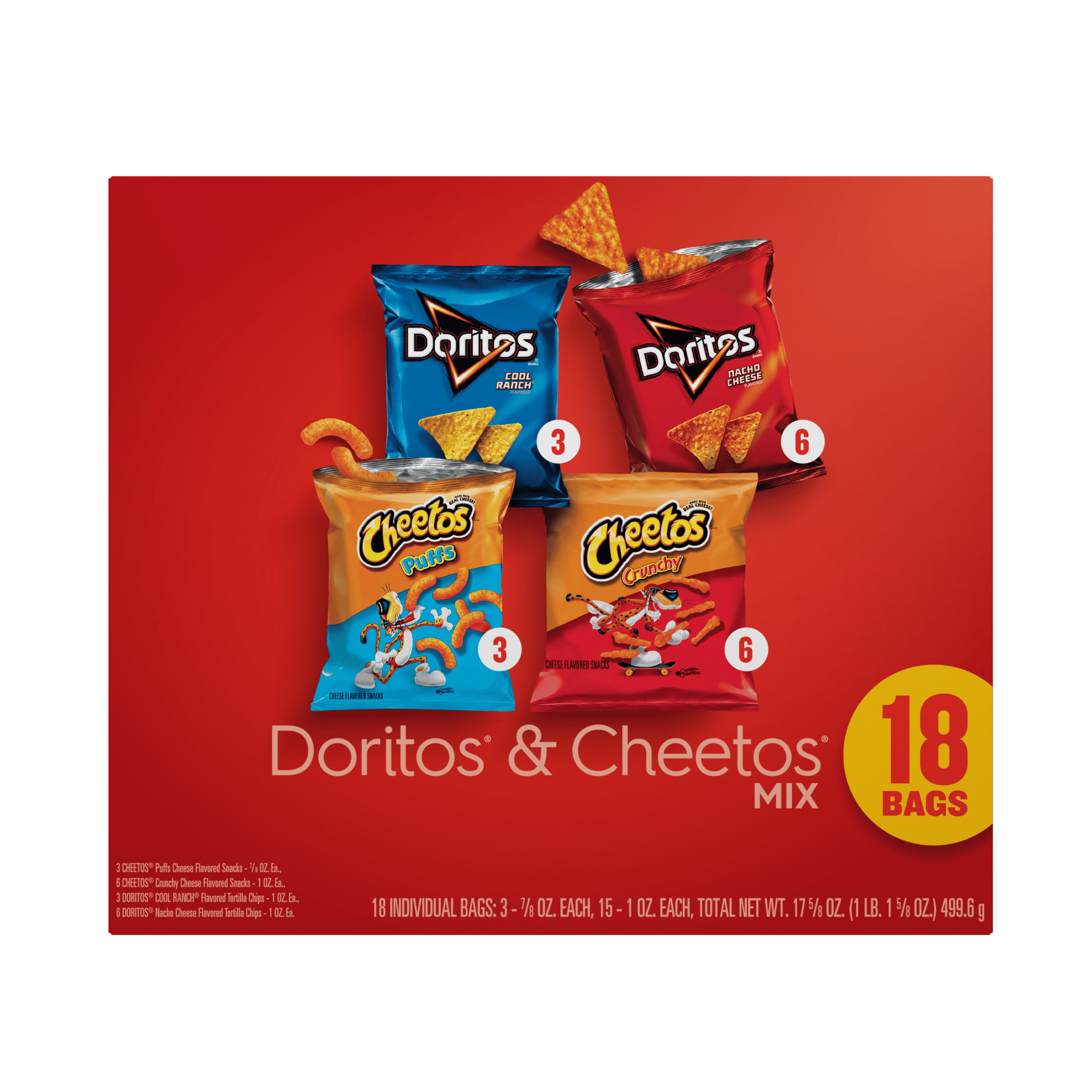 - Includes Doritos Nacho Cheese flavored tortilla chips, Doritos Cool Ranch flavored tortilla chips, Cheetos Crunchy cheese snacks, and Cheetos Puffs cheese snacks