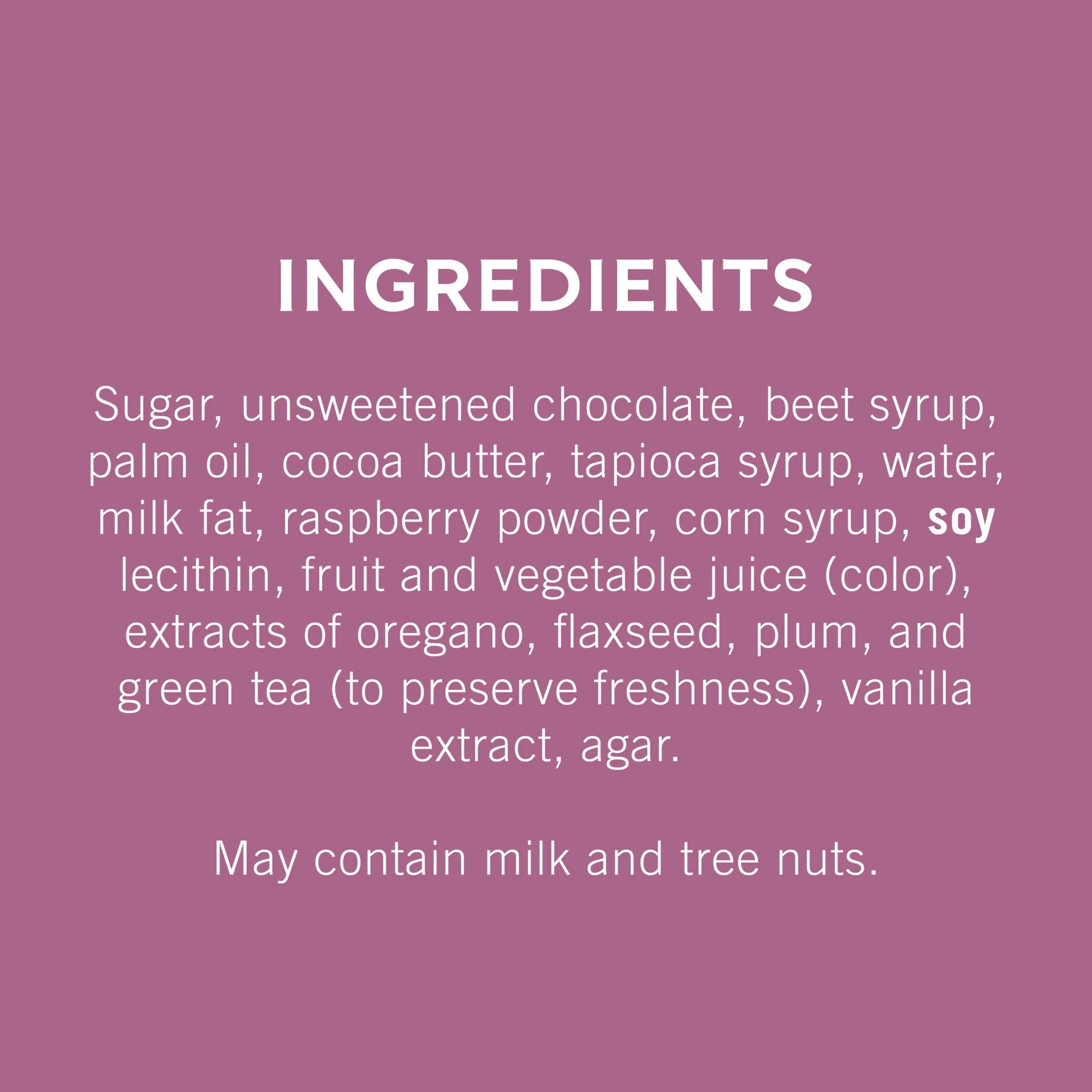 Ingredients: Sugar, unsweetened chocolate, beet syrup, palm oil, cocoa butter, tapioca syrup, water, milk fat, raspberry powder, corn syrup, soy lecithin, fruit and vegetable juice (color), extracts of oregano, flaxseed, plum and green tea (to preserve freshness), vanilla extract, agar./div>