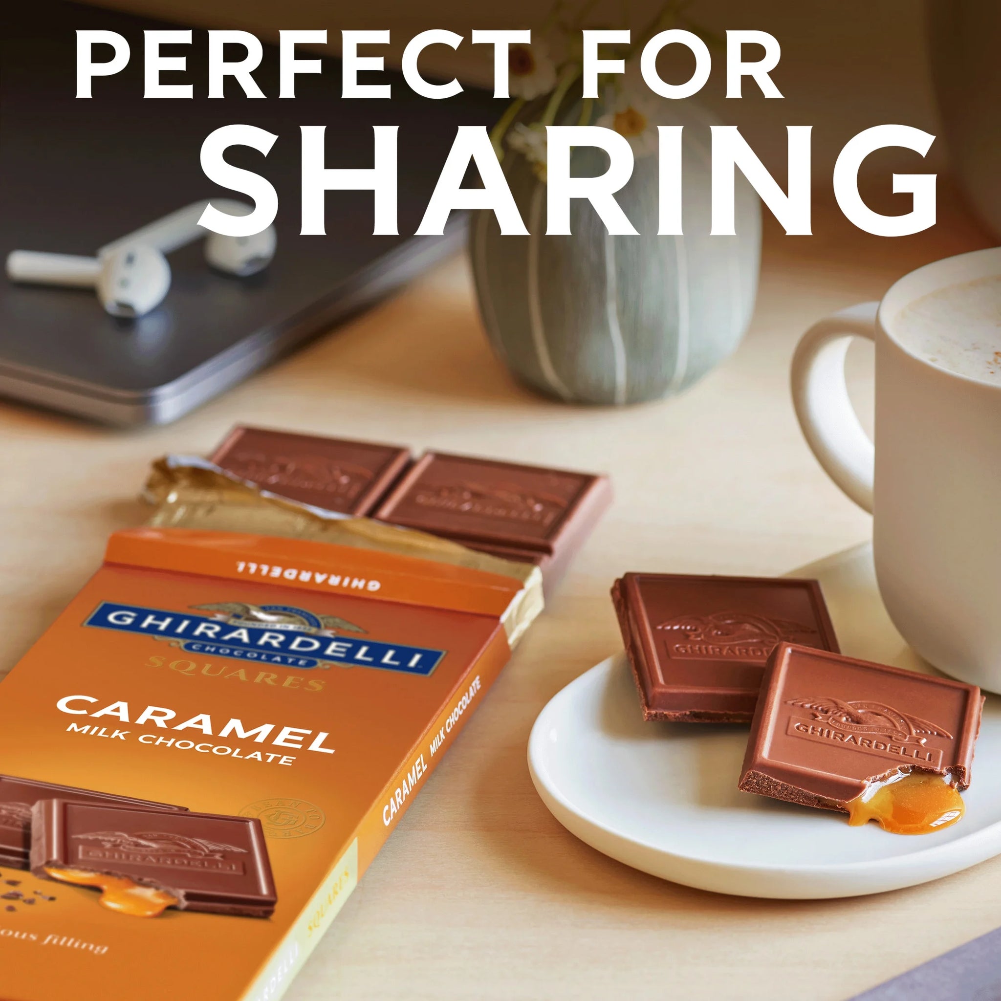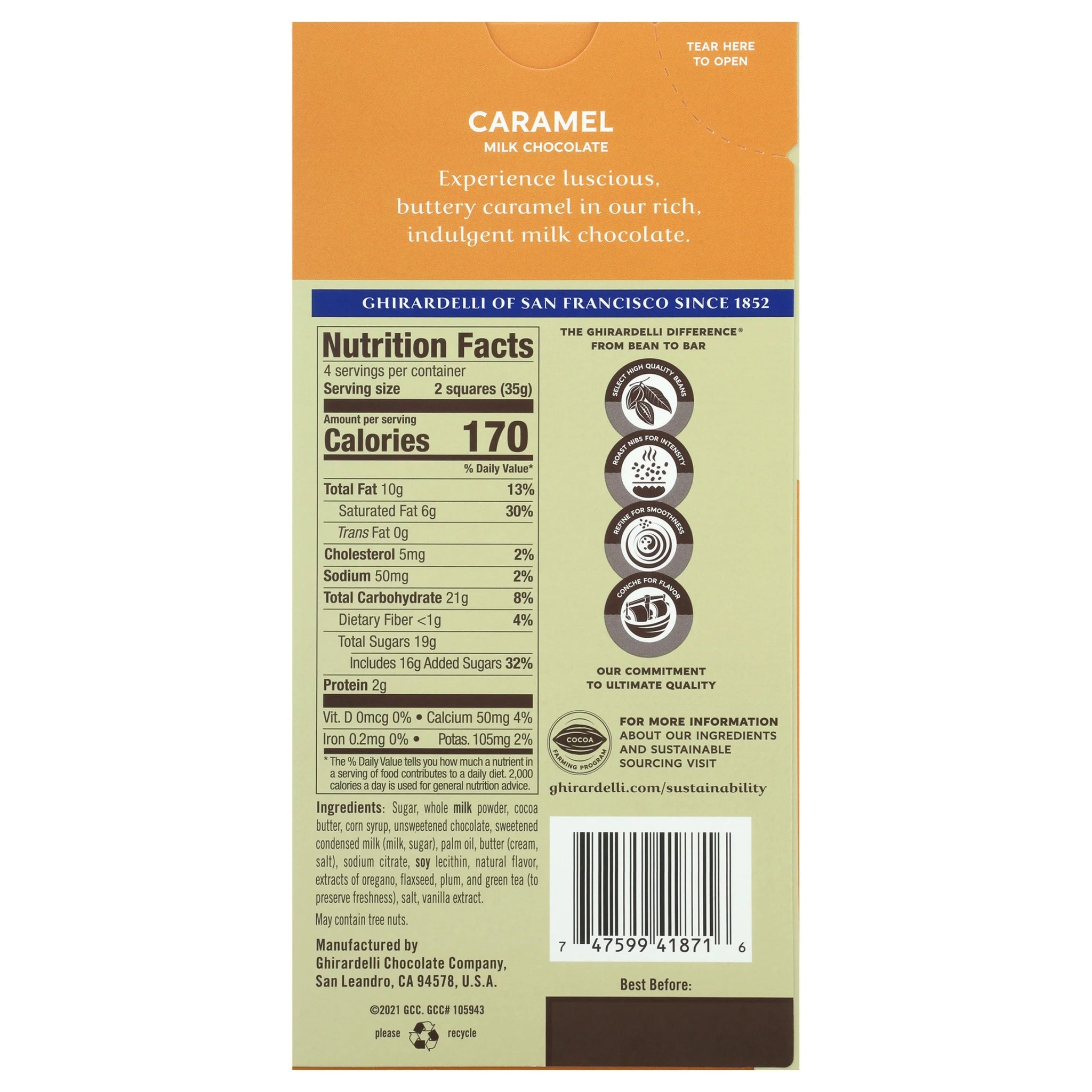 Experience luscious indulgence with each bite of this GHIRARDELLI Milk Chocolate Bar with Caramel Filling. Perfectly balanced for a luxurious treat anytime, this milk chocolate bar adds a sweet touch to your day on its own and adds a sweet twist to s'mores and other desserts for something special. Share the sweet moments of joy and delight with someone special when you give this chocolate caramel bar as a gift. Luscious caramel fills the slow-melting milk chocolate for pure bliss in every square. Each bar comes with marked squares to break apart easily for the perfect bite. Premium ingredients, including high quality cocoa beans, are part of the GHIRARDELLI difference: a commitment to ultimate quality from Bean to Bar. GHIRARDELLI Makes Life a Bite Better.