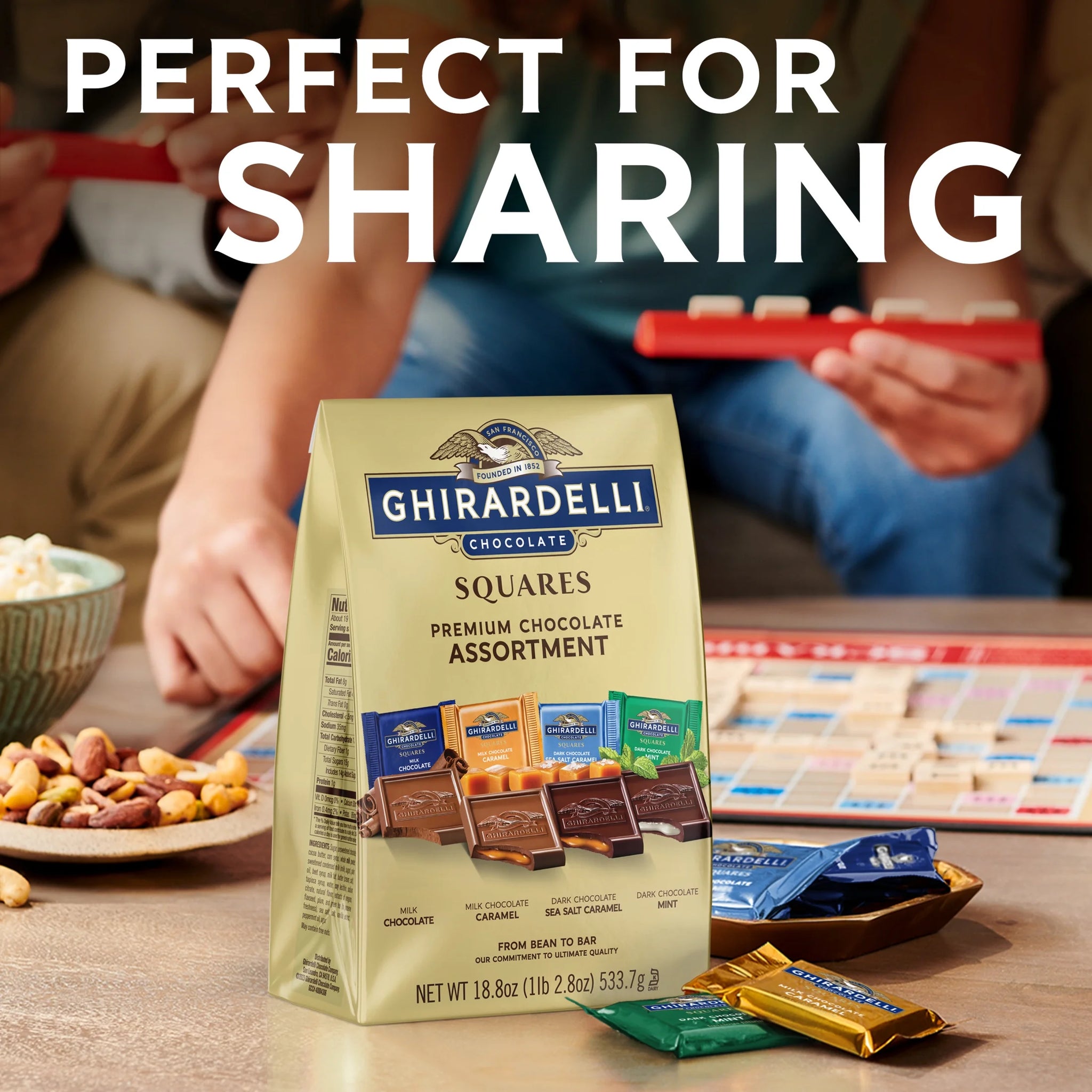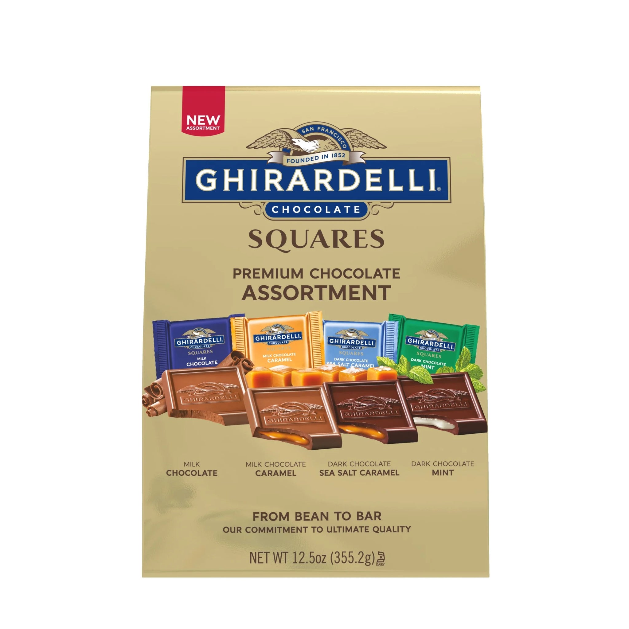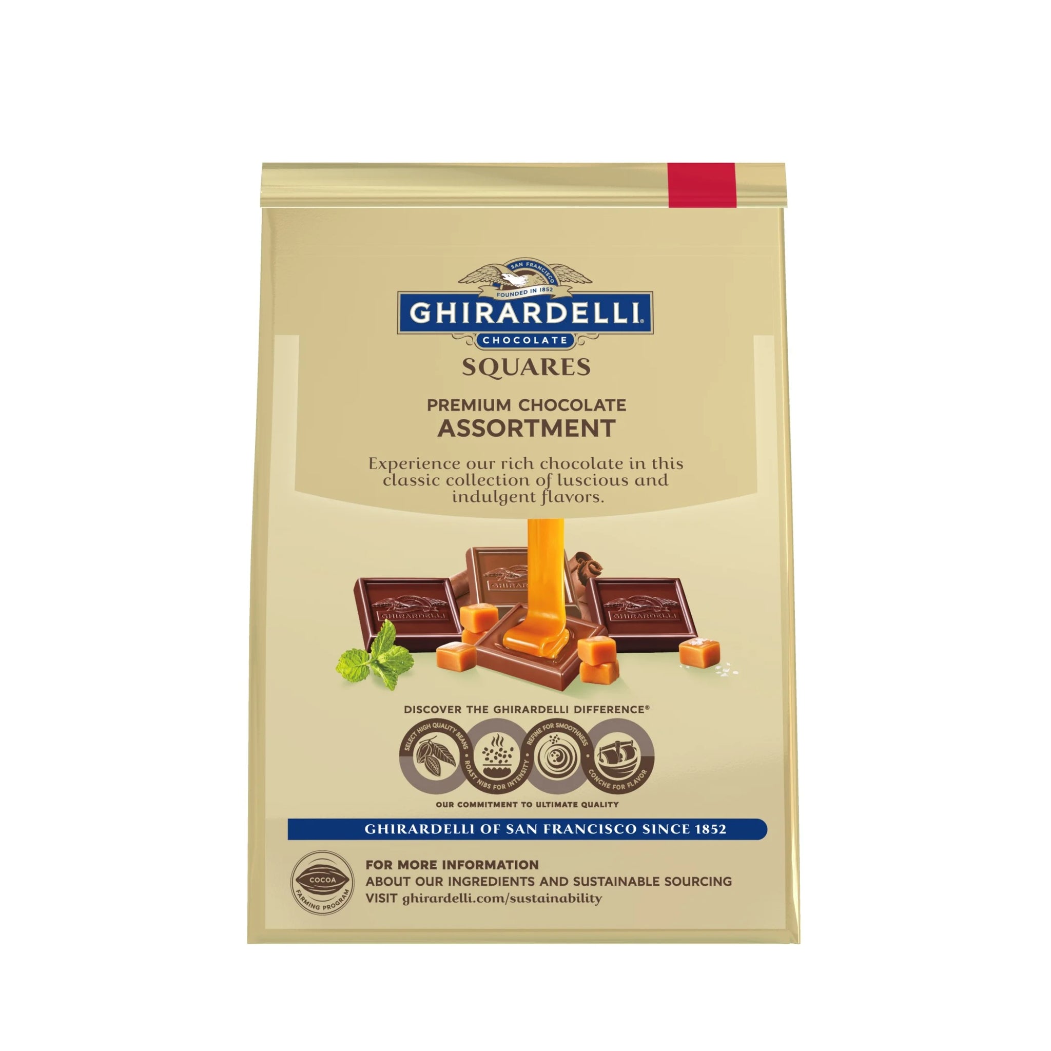 Indulge in a premium chocolate assortment with GHIRARDELLI Premium Assorted Chocolate Squares. This bag of individually wrapped candy SQUARES is perfect for gifting, entertaining and personal enjoyment. There's a chocolate in this collection for everyone, whether you crave rich, indulgent milk chocolate, slow-melting dark chocolate, mint chocolate or luscious caramel. Each bag of GHIRARDELLI SQUARES includes a variety of best selling flavors, including Dark Chocolate Mint, Milk Chocolate Caramel, Dark Chocolate Sea Salt Caramel and Milk Chocolate. GHIRARDELLI chocolate SQUARES are individually wrapped, making them ideal to tuck in purses, bags and desk drawers for an afternoon pick-me-up. Committed to ultimate quality from bean to bar, GHIRARDELLI chocolate is crafted with care using high quality ingredients for a smooth, delectable treat. GHIRARDELLI Makes Life A BITE BETTER.
