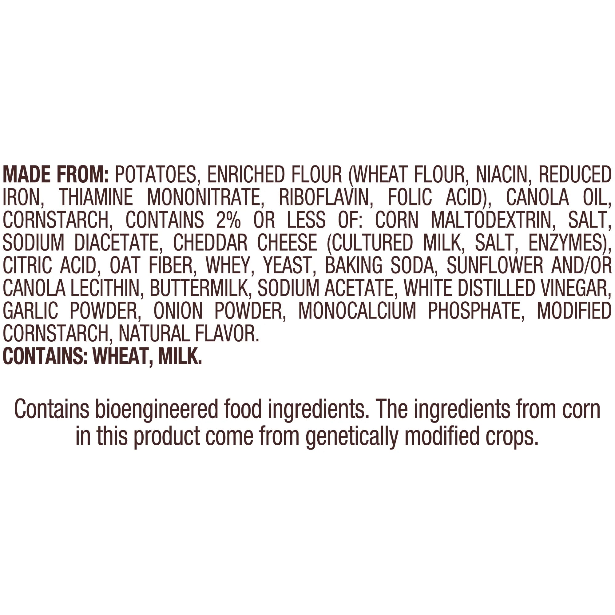 Made From: Potatoes, Enriched Flour (Wheat Flour, Niacin, Reduced Iron, Thiamine Mononitrate, Riboflavin, Folic Acid), Canola Oil, Cornstarch, Contains 2% Or Less Of: Corn Maltodextrin, Salt, Sodium Diacetate, Cheddar Cheese (Cultured Milk, Salt, Enzymes), Citric Acid, Oat Fiber, Whey, Yeast, Baking Soda, Sunflower And/Or Canola Lecithin, Buttermilk, Sodium Acetate, White Distilled Vinegar, Garlic Powder, Onion Powder, Monocalcium Phosphate, Modified Cornstarch, Natural Flavor. Contains: Wheat, Milk./div>