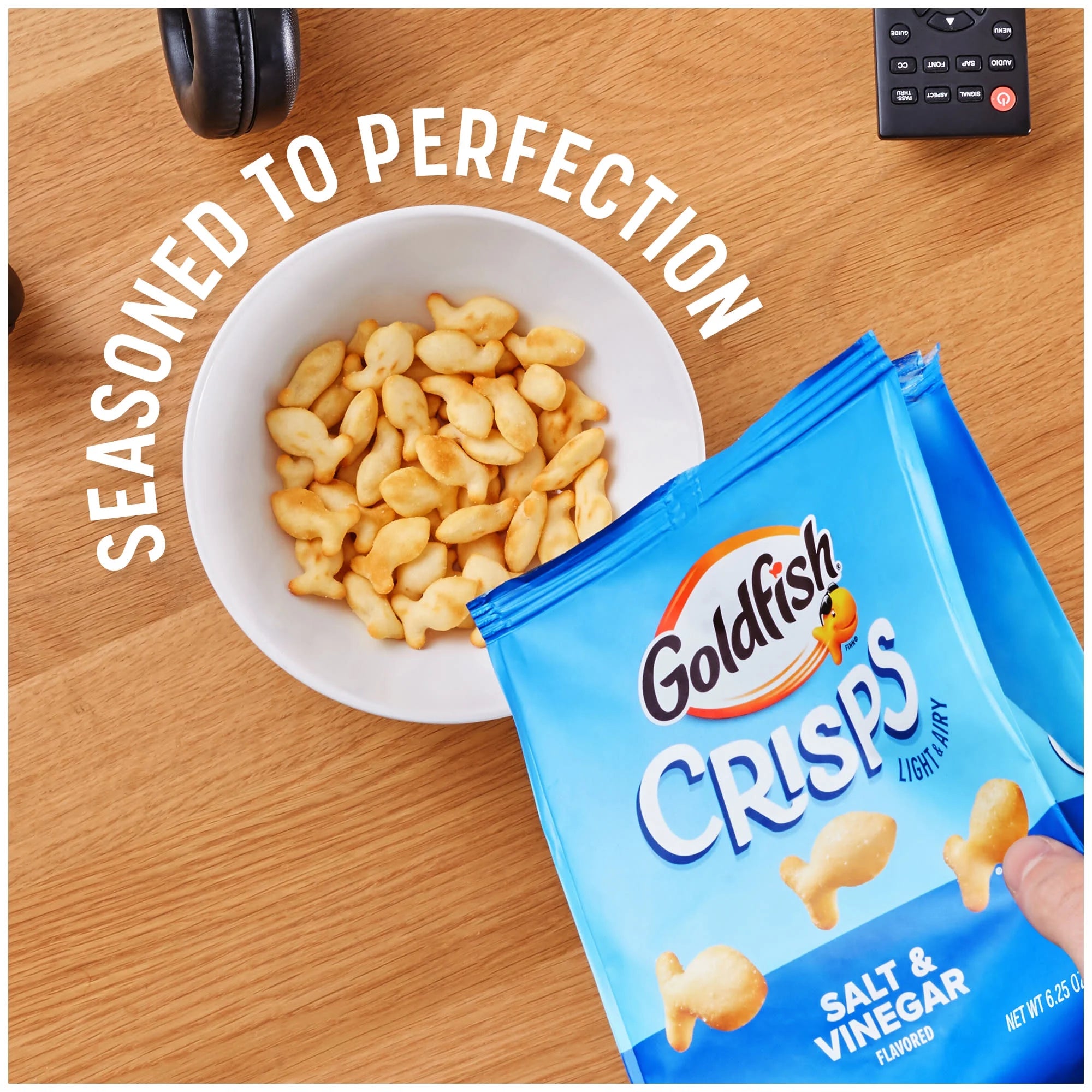 Experience New Salt and Vinegar Flavored Goldfish Crisps! These irresistible Goldfish are light and airy, always baked, and seasoned to perfection. New bite-sized Goldfish Crisps are the perfect chip-like snack, baked with potato and wheat! With the crisp flavors of delicious salt and tangy vinegar, these crisps are seasoned to perfection and ready for your enjoyment. The 6.25-ounce bag is perfect for sharing, solo snacking, or taking on the go. Try these delicious, fish shaped crisps - in Cheddar, Sour Cream and Onion, and Salt and Vinegar flavored. Taste How Goldfish Does Chips!
