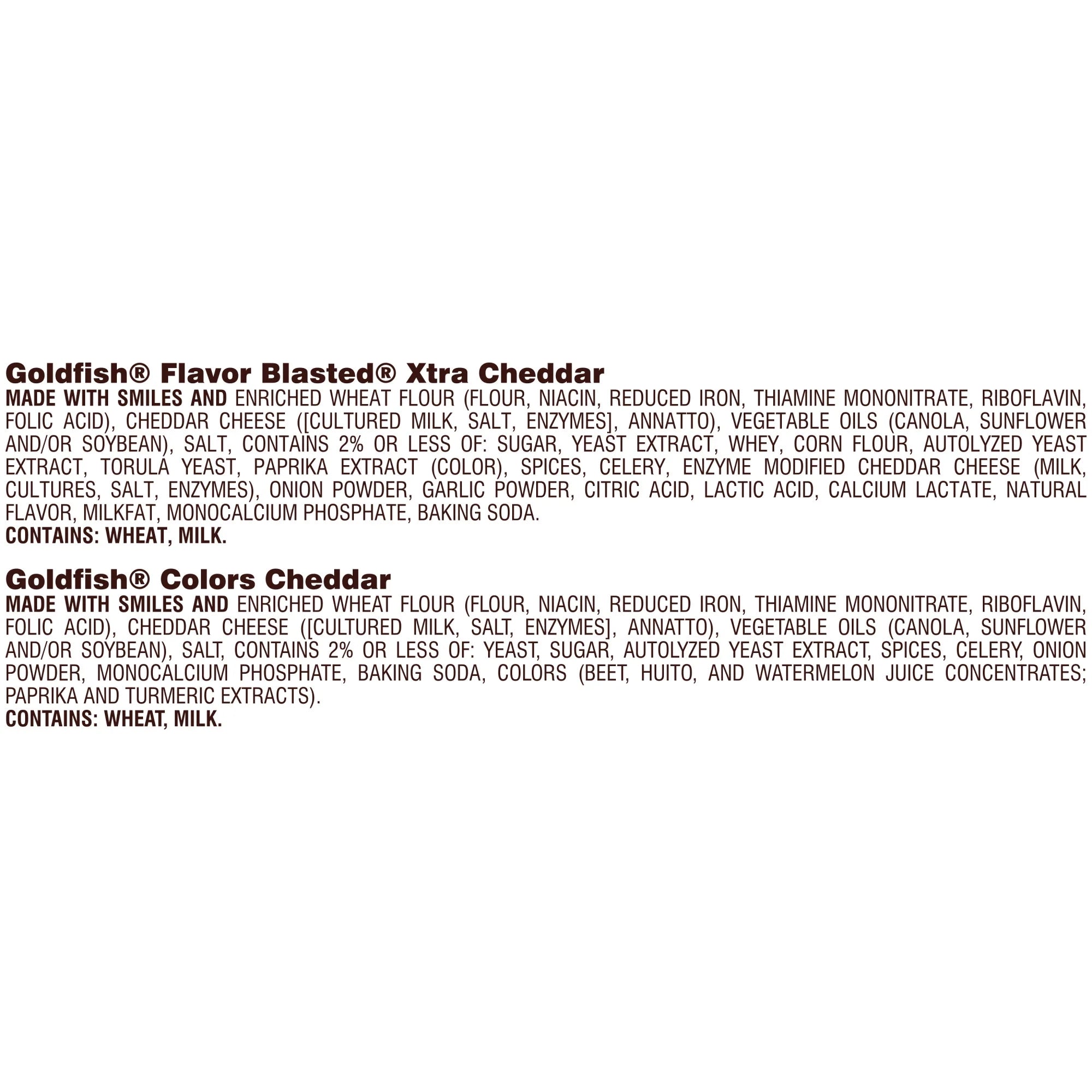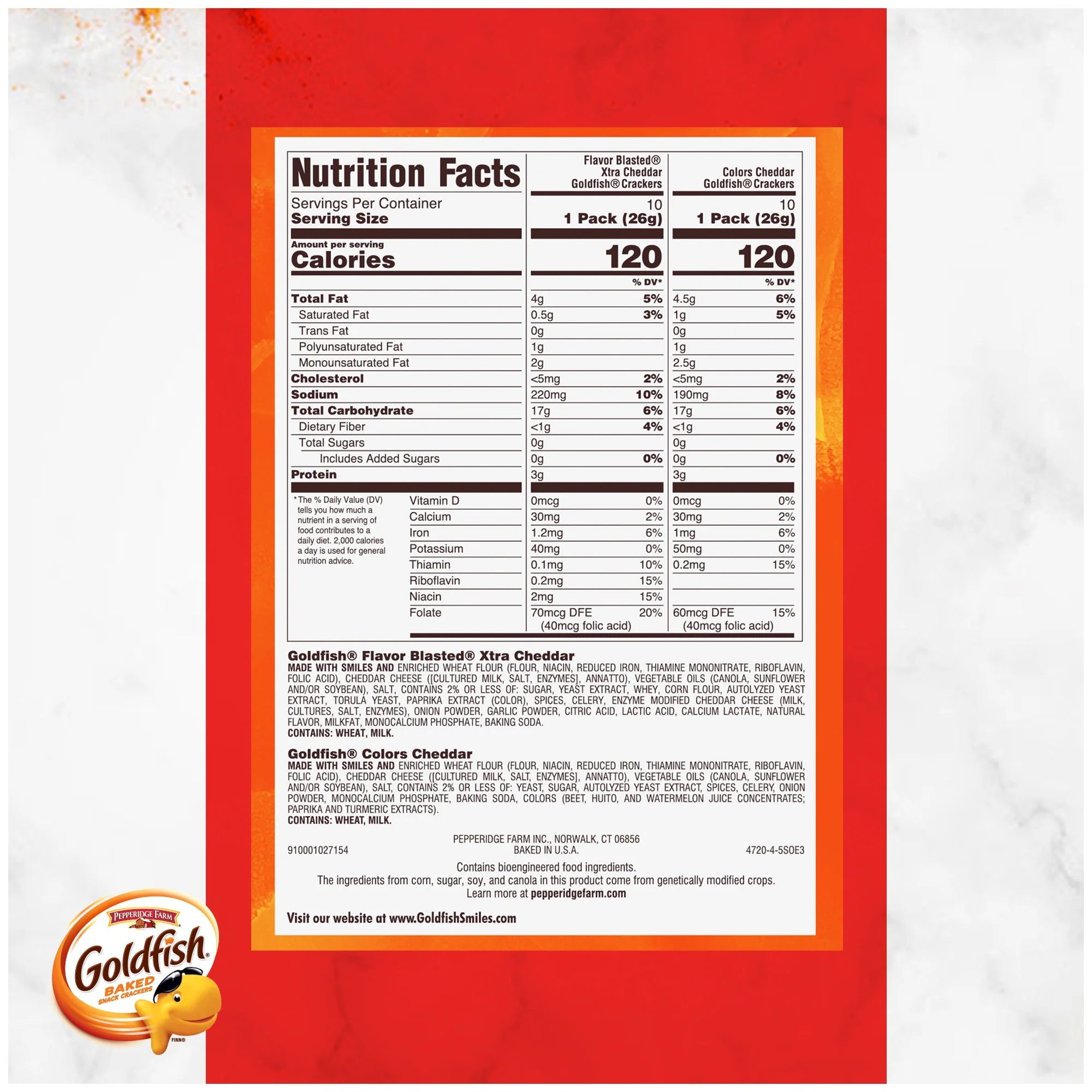 - VARIETY PACK INCLUDES: 10 single-serving packs of Goldfish Colors and 10 single-serve snack packs in Flavor Blasted Xtra Cheddar flavor (1 ounce each).