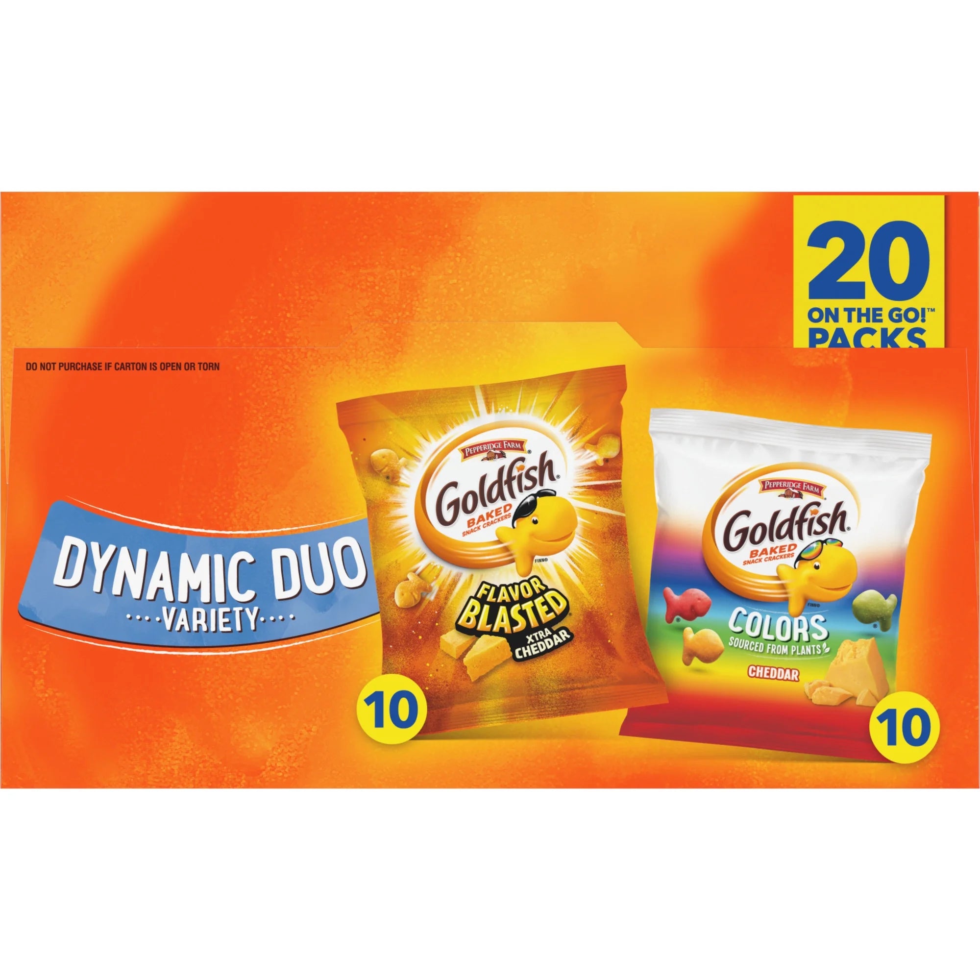 When it comes to snacking, there are a lot of ways to enjoy Goldfish snack crackers. This 20-count Dynamic Duo Variety Pack comes with 10 single-serving snack packs (0.9 oz each) of Goldfish Colors Cheddar crackers as well as 10 packs of Goldfish Flavor Blasted Xtra Cheddar crackers. Both varieties are super munchable snacks that are easy to enjoy whether you’re at home or out and about hanging with your friends. Even better, whoever you’re sharing with can pick their favorite - the intensity of Flavor Blasted Xtra Cheddar or all the colors of the rainbow with Goldfish Colors Cheddar. Both varieties are made with real cheese and baked for Goldfish deliciousness that always delights. All those perfectly portioned individual bags mean there is plenty to go around, and everyone gets to enjoy their own pack. They’re always ready when you’re craving a crunchable, munchable snack. Turn up snack time with the delicious taste of Goldfish Crackers. Go for the handful! Shelf-stable product.