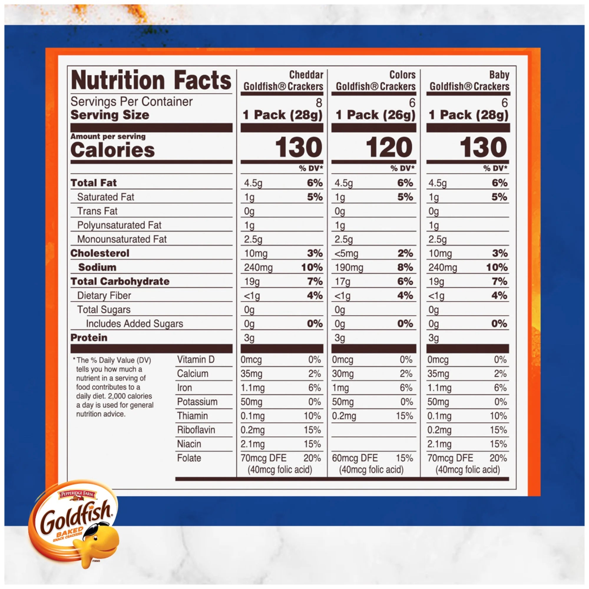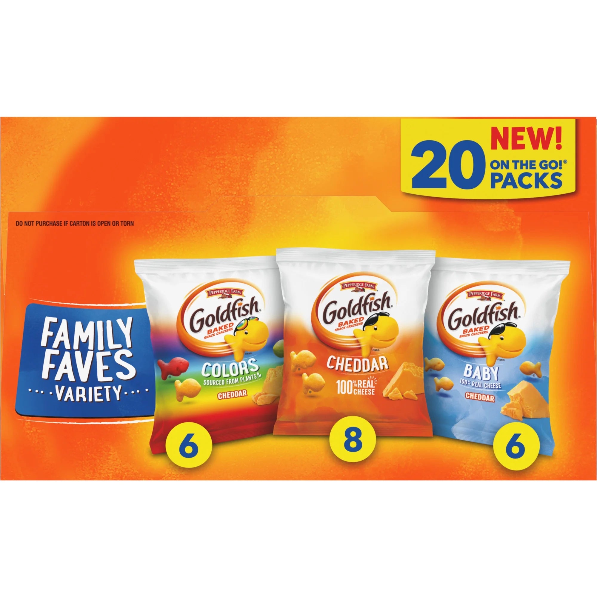 - VARIETY PACK INCLUDES 8 single-serving packs of Goldfish Cheddar, 6 packs of Goldfish Colors and 6 packs of Goldfish Baby crackers.