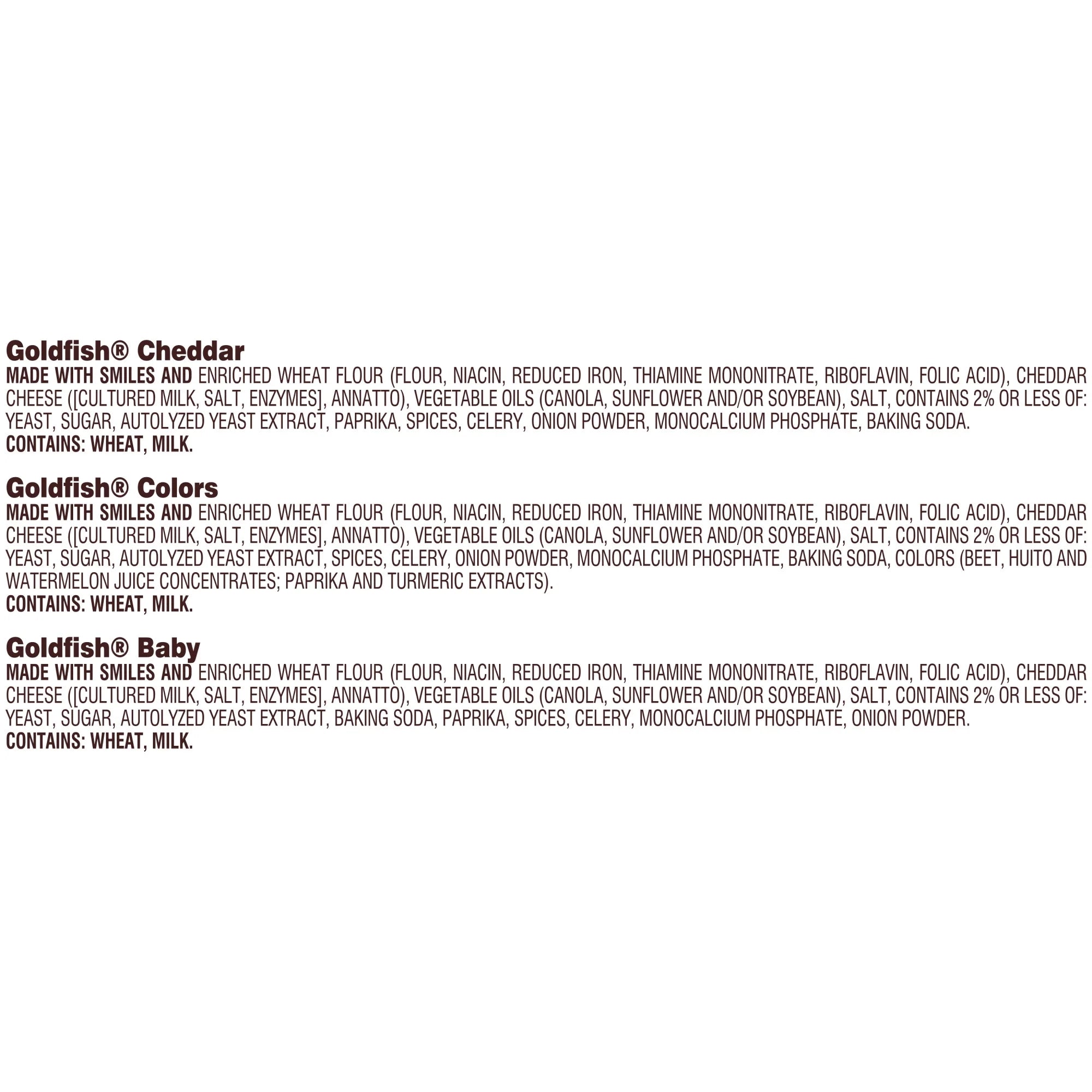 {U}Cheddar Goldfish (7523){/U} Made With Smiles And Enriched Wheat Flour (Flour, Niacin, Reduced Iron, Thiamine Mononitrate, Riboflavin, Folic Acid), Cheddar Cheese ([Cultured Milk, Salt, Enzymes], Annatto), Vegetable Oils (Canola, Sunflower And/Or Soybean), Salt, Contains 2% Or Less Of: Yeast, Sugar, Autolyzed Yeast Extract, Paprika, Spices, Celery, Onion Powder, Monocalcium Phosphate, Baking Soda. Contains: Wheat, Milk. {U}Colors Goldfish (8607){/U} Made With Smiles And Enriched Wheat Flour (Flour, Niacin, Reduced Iron, Thiamine Mononitrate, Riboflavin, Folic Acid), Cheddar Cheese ([Cultured Milk, Salt, Enzymes], Annatto), Vegetable Oils (Canola, Sunflower And/Or Soybean), Salt, Contains 2% Or Less Of: Yeast, Sugar, Autolyzed Yeast Extract, Spices, Celery, Onion Powder, Monocalcium Phosphate, Baking Soda, Colors (Beet, Huito And Watermelon Juice Concentrates; Paprika And Turmeric Extracts). Contains: Wheat, Milk. {U}Baby Goldfish (5200){/U} Made With Smiles And Enriched Wheat Flour (Flour, Niacin, Reduced Iron, Thiamine Mononitrate, Riboflavin, Folic Acid), Cheddar Cheese ([Cultured Milk, Salt, Enzymes], Annatto), Vegetable Oils (Canola, Sunflower And/Or Soybean), Salt, Contains 2% Or Less Of: Yeast, Sugar, Autolyzed Yeast Extract, Baking Soda, Paprika, Spices, Celery, Monocalcium Phosphate, Onion Powder. Contains: Wheat, Milk./div>
