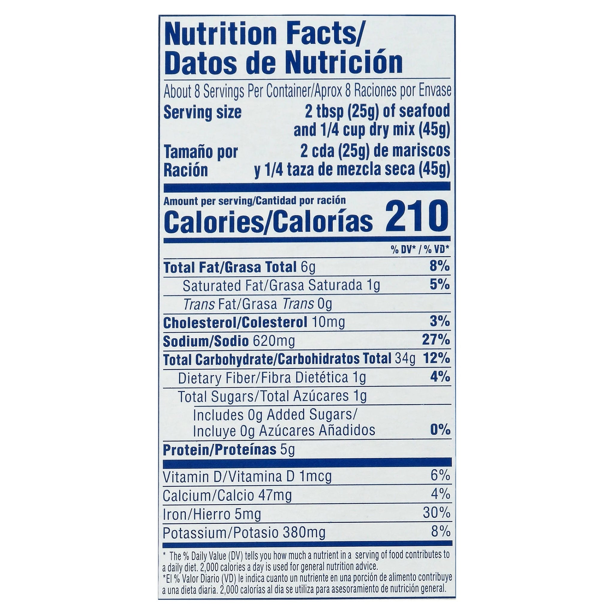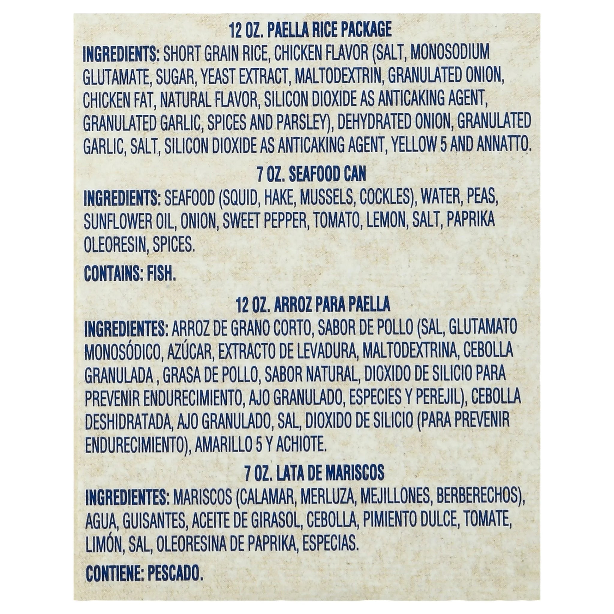 Paella Rice Package Ingredients: Short Grain Rice, Chicken Flavor (Salt, Monosodium Glutamate, Sugar, Yeast Extract, Maltodextrin, Granulated Onion, Chicken Fat, Natural Flavor, Silicon Dioxide as Anticaking Agent, Granulated Garlic, Spices and Parsley), Dehydrated Onion, Granulated Garlic, Salt, Silicon Dioxide as Anticaking Agent, Yellow 5 and Annatto. Seafood Can Ingredients: Seafood (Squid, Hake, Mussels, Cockles), Water, Peas, Sunflower Oil, Onion, Sweet Pepper, Tomato, Lemon, Salt, Paprika, Oleoresin, Spices./div>