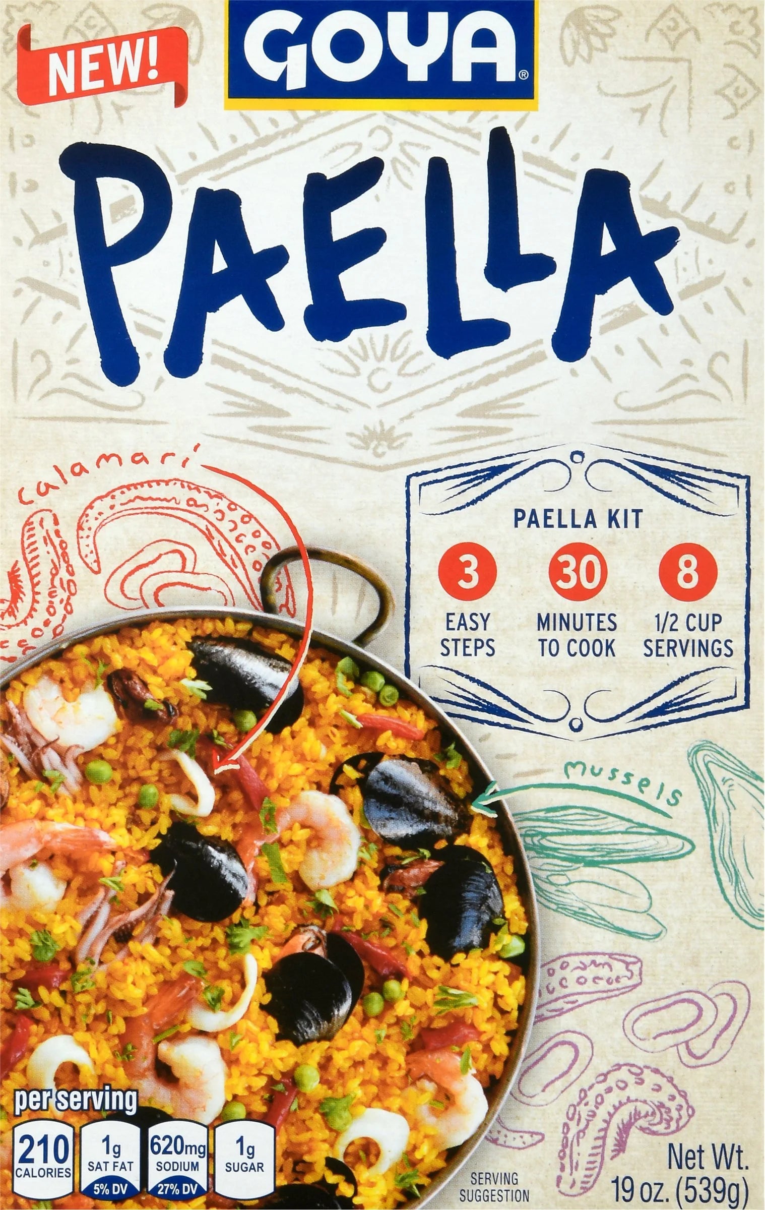 GOYA Paella 19 Oz. GOYA® Paella—it’s all in the box! This Paella is a traditional Spanish dish made with premium seafood and Valencia-type rice. This short grain absorbs liquid and flavor quickly and stays relatively firm during cooking, perfect to prepare this classic dish. Ready in three easy steps!
