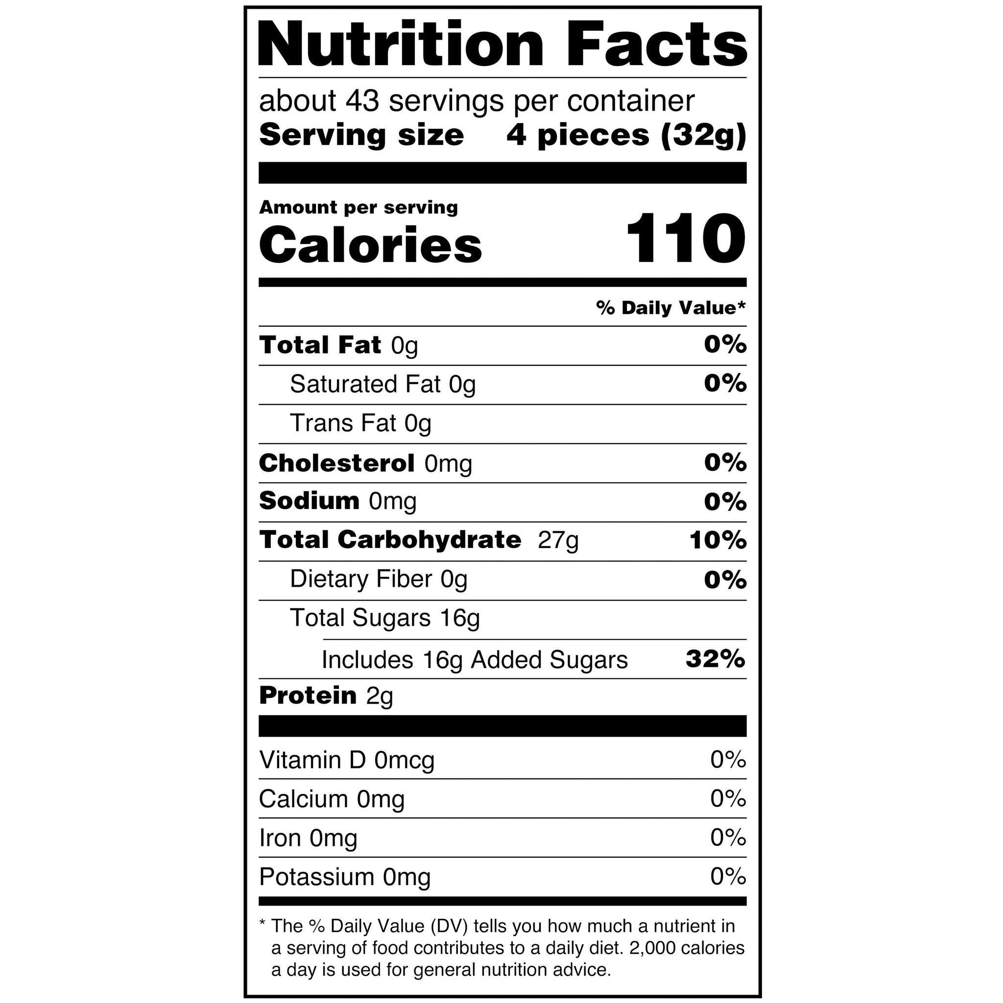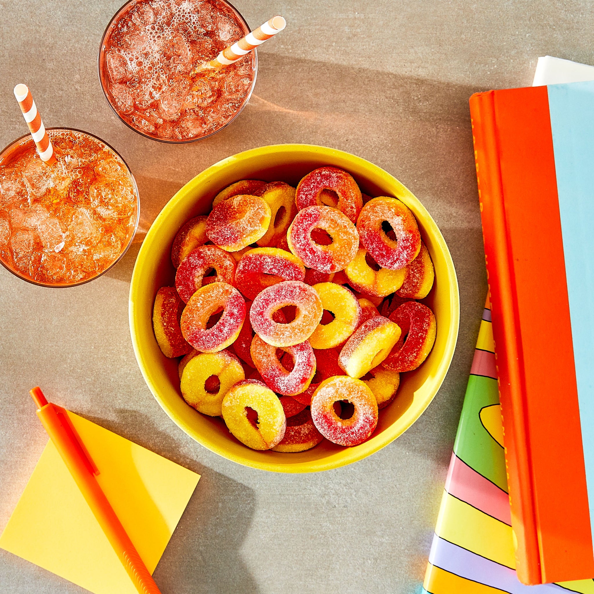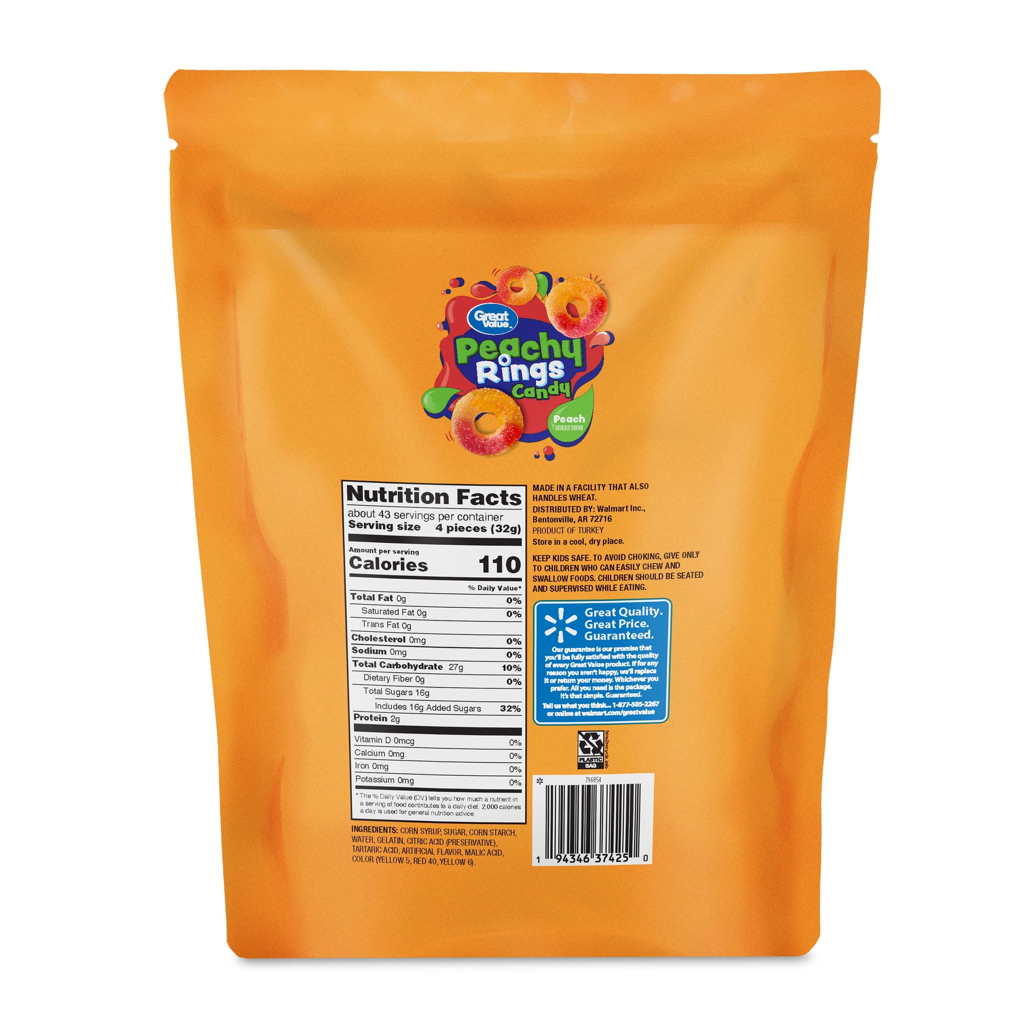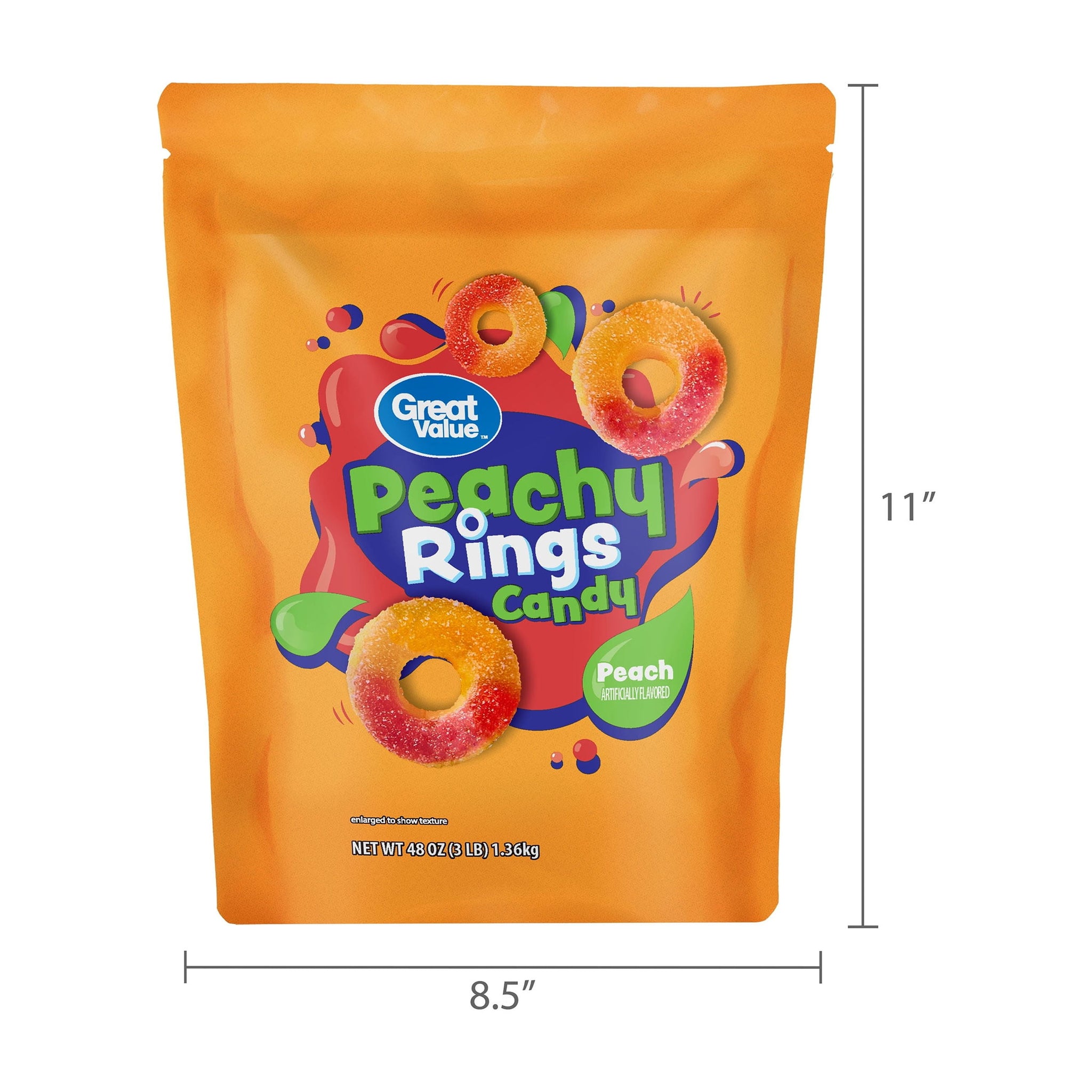 Great Value Peachy Rings Gummy Candy are classic, sugar-dusted chewy candies in bright colors and bursting with peach flavors. These deliciously sweet and sour candies have been popular with children of all ages and continue to excite the candy lovers of this generation. These moist, chewy, and incredibly tasty candies will satisfy your sweet tooth. They offer the perfect combination of sweet and tangy that will quickly make them a family favorite. They are also excellent as snacks, gifts or treats for sharing with friends. Delight your taste buds with Great Value Peachy Rings Gummy Candy.