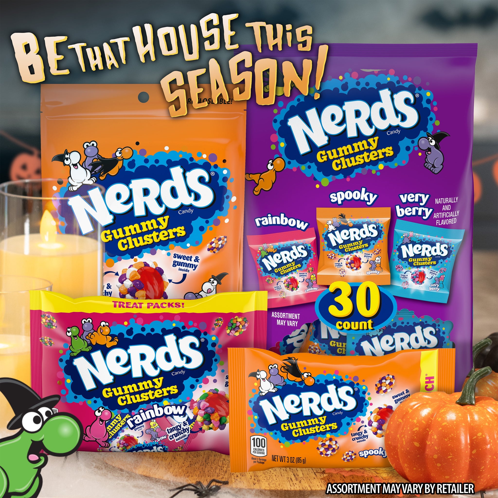 - SWEET, TANGY AND SPOOKY: Get ready for trick-or-treaters with NERDS Gummy Clusters 28 convenient treat size packs including the limited edition Spooky Gummy Clusters.