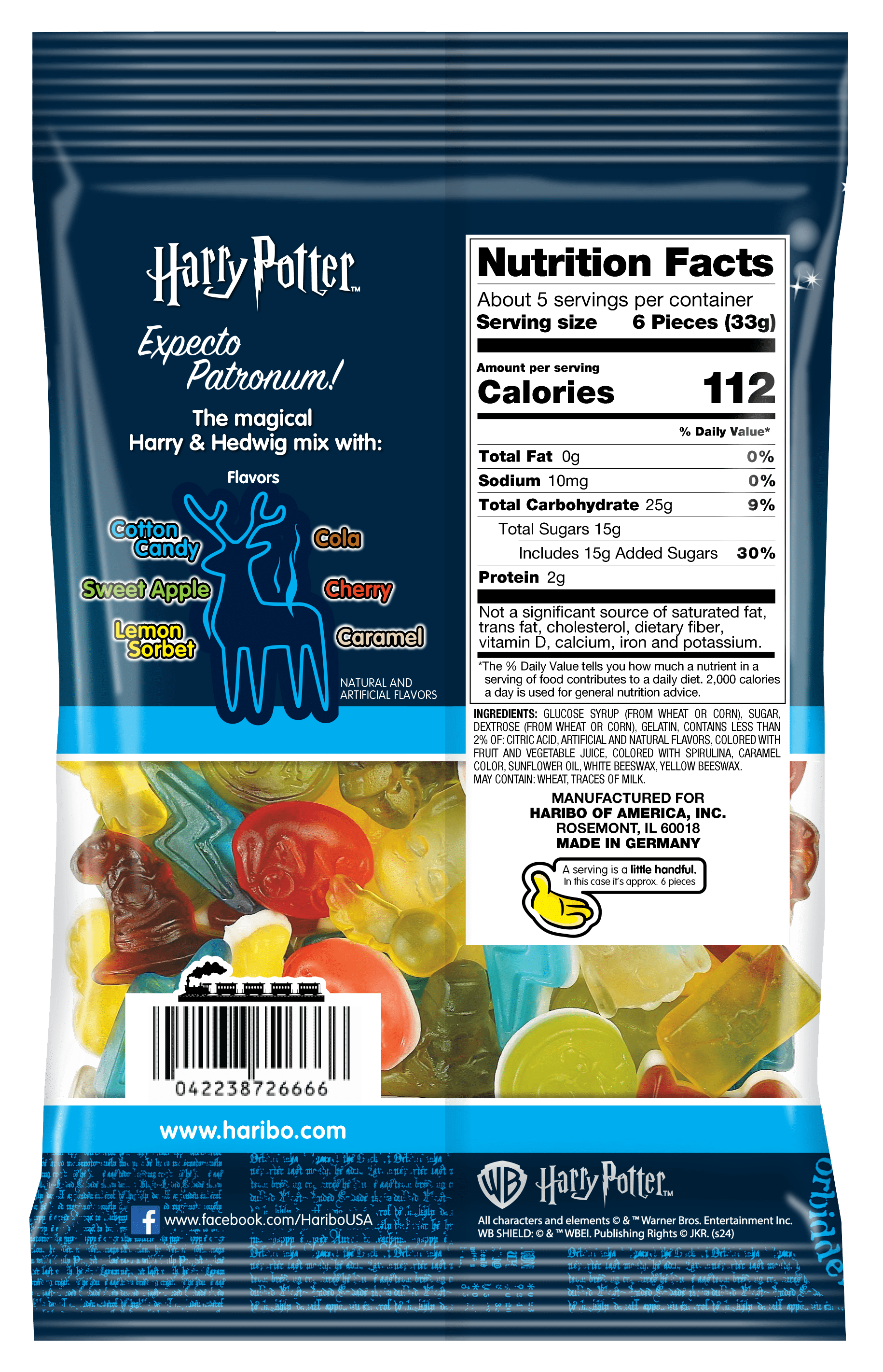 Expecto Patronum! The clever Harry & Hedwig mix with flavors: Cotton Candy, Cola, Sweet Apple, Cherry, Lemon Sorbet, and Caramel. “Kids and grown-ups love it so, the happy world of HARIBO®”