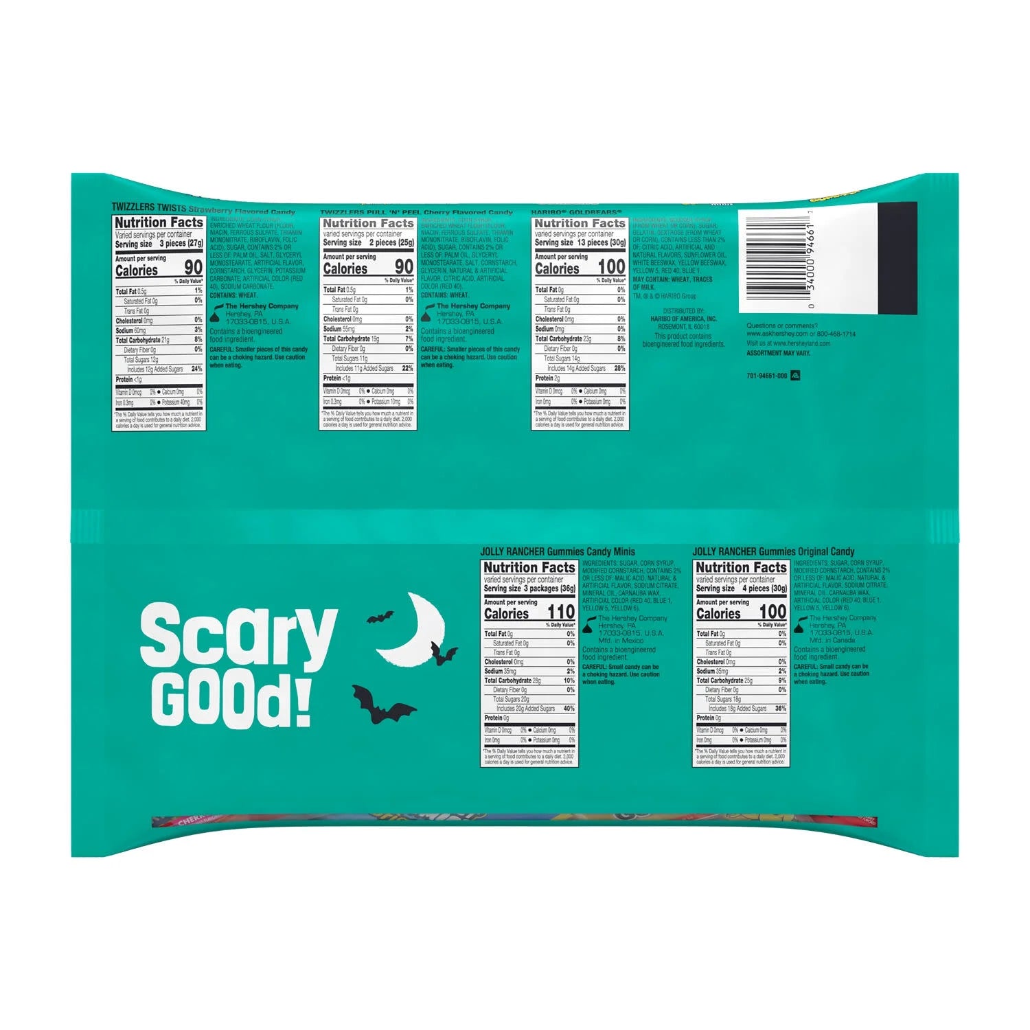 Enjoy a delicious fruit flavored treat anywhere and anytime with this fruity assortment of trick or treat candy. Offering six crowd pleasing favorites, this Halloween candy assortment is perfect for sharing with family, friends, teammates and co-workers. Take this variety candy bag into the office break room, pour some individually wrapped candies into your candy jar at home or take a bag to your next sports game to celebrate the win. This variety bag of fruit flavored candy includes HARIBO GOLDBEARS gummies, JOLLY RANCHER gummies candy, JOLLY RANCHER gummies minis candy, TWIZZLERS Twists strawberry flavored candy and TWIZZLERS PULL 'N' PEEL cherry flavored chewy candy.
