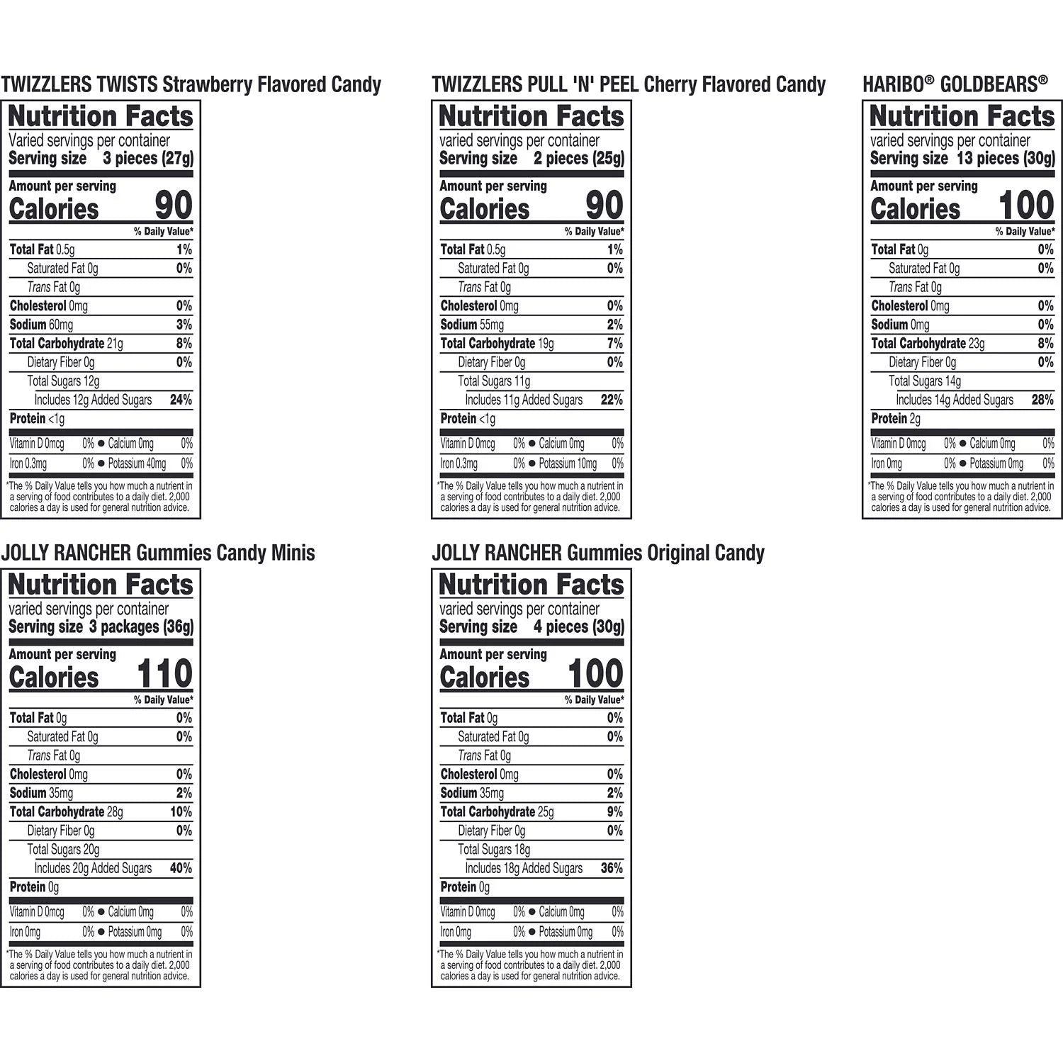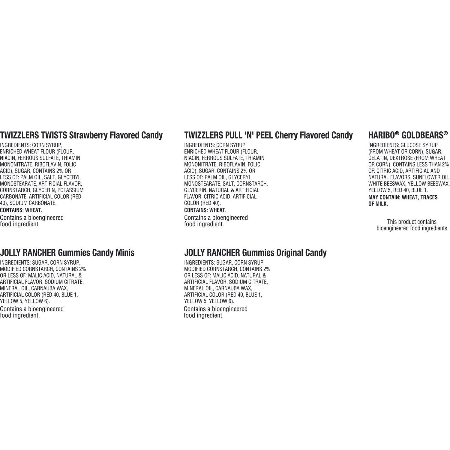 - Includes HARIBO GOLDBEARS gummies, JOLLY RANCHER gummies candy, JOLLY RANCHER gummies minis candy, TWIZZLERS Twists strawberry flavored candy and TWIZZLERS PULL 'N' PEEL cherry flavored chewy candy