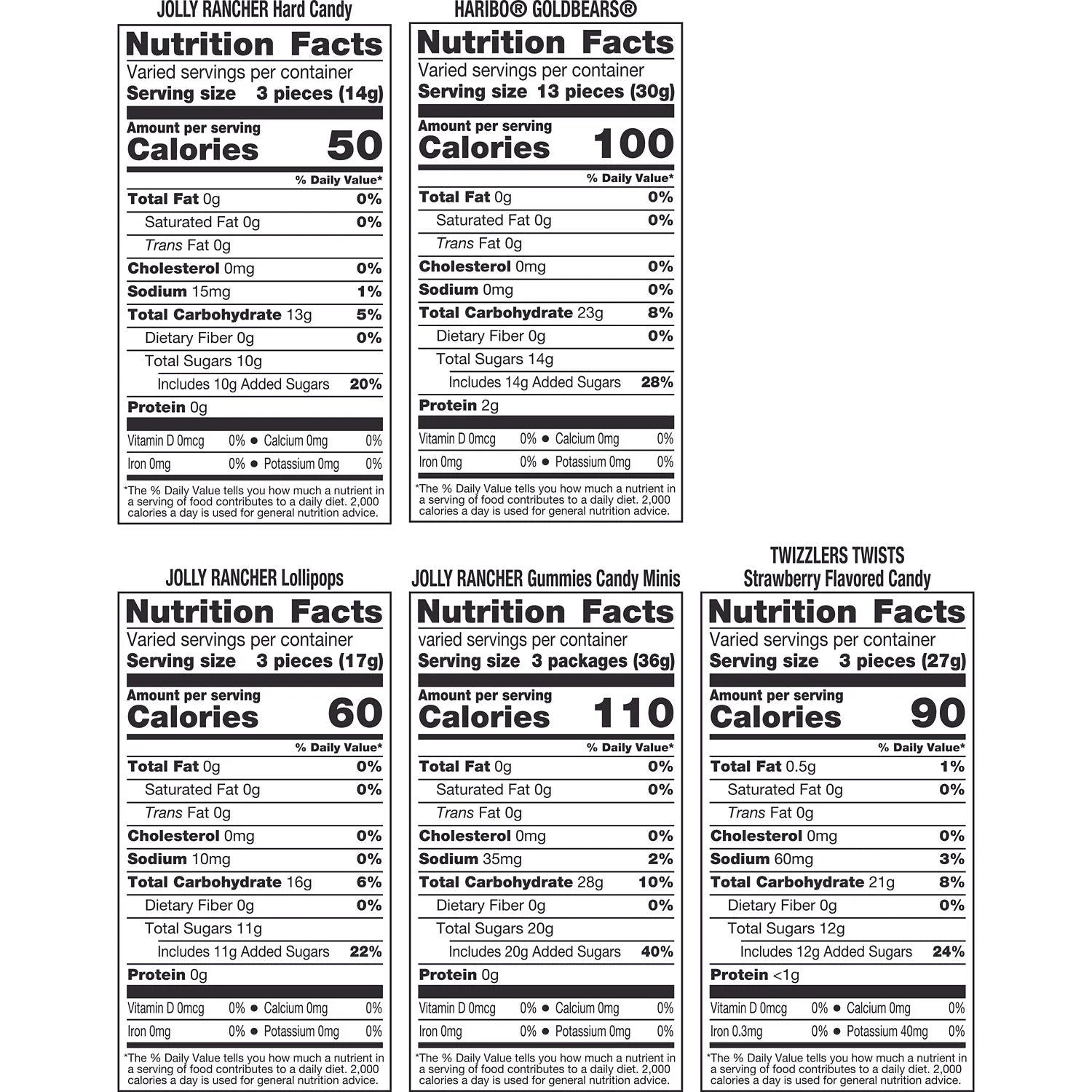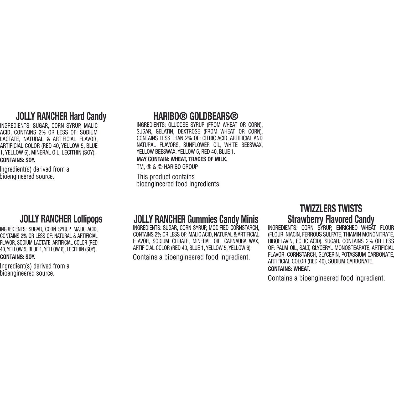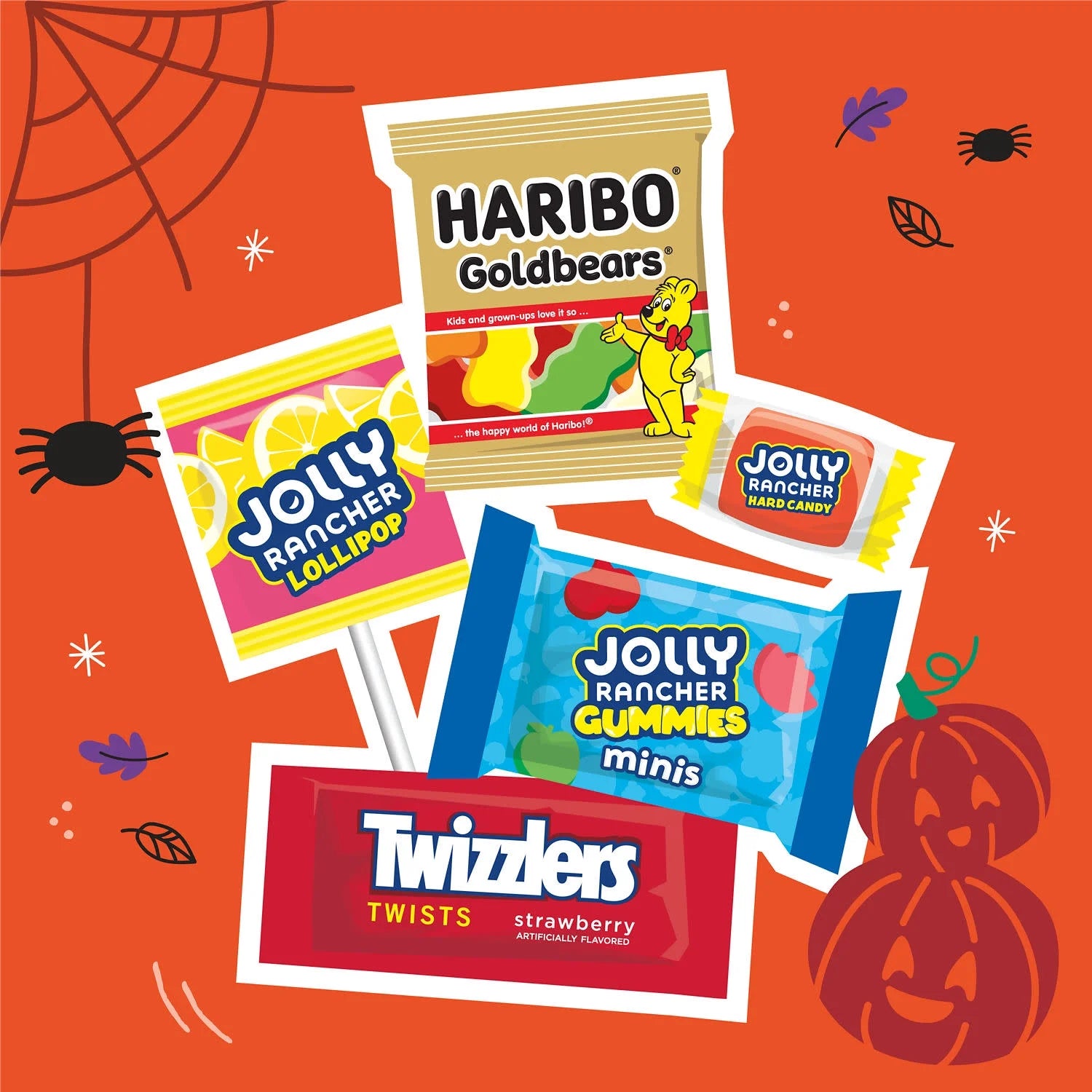 - Includes HARIBO GOLDBEARS gummies, JOLLY RANCHER gummies minis candy, JOLLY RANCHER hard candy, JOLLY RANCHER lollipops and TWIZZLERS Twists strawberry flavored candy