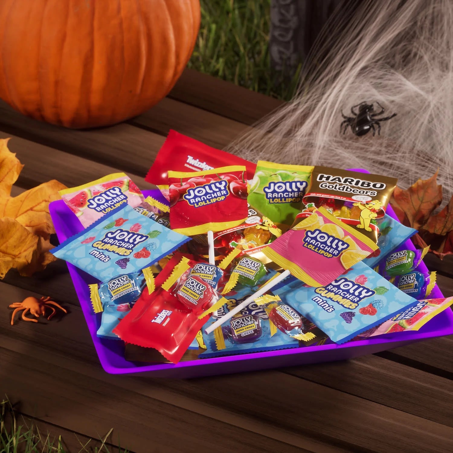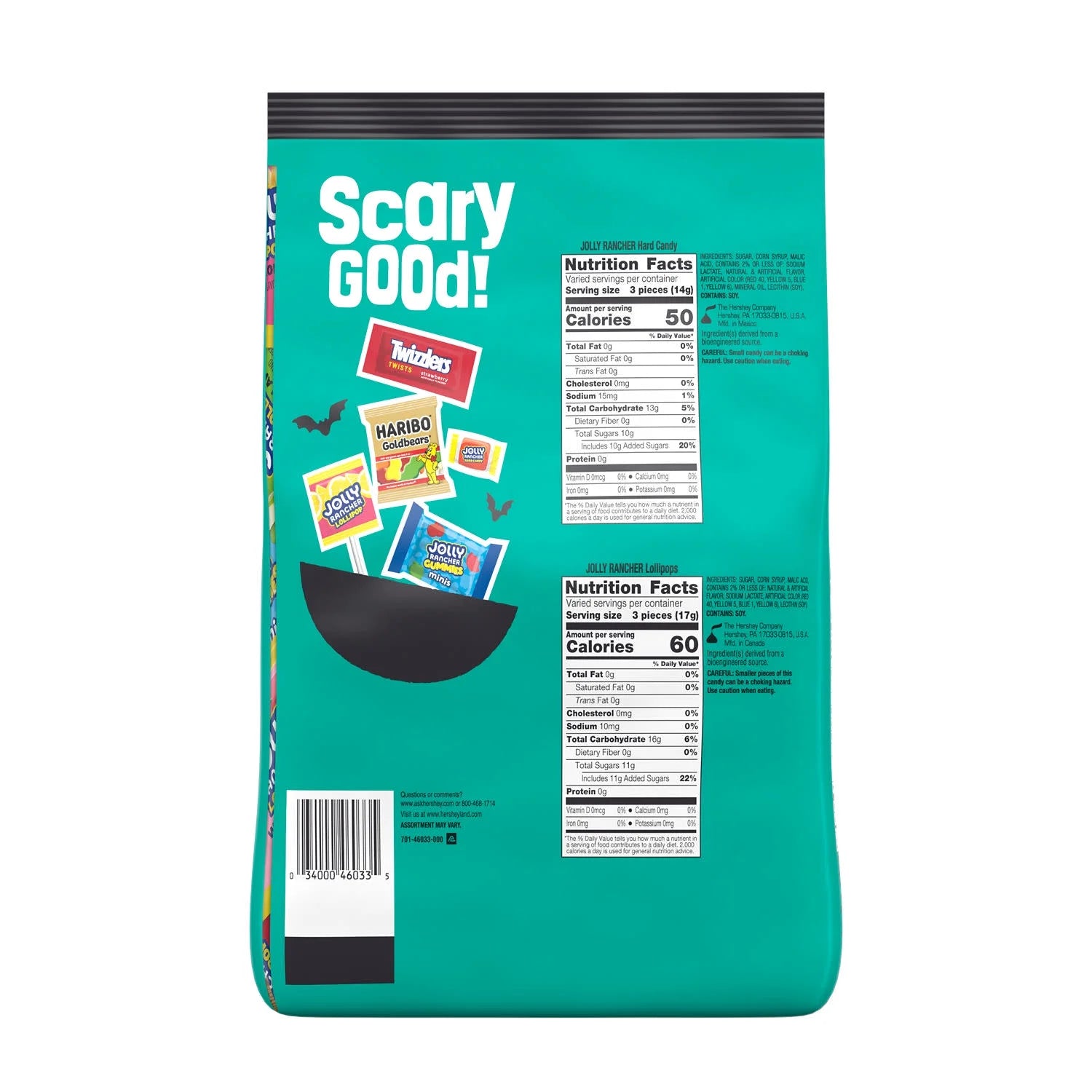 Enjoy a delicious fruit flavored treat anywhere and anytime with this fruity assortment of Halloween candy. Offering five crowd pleasing favorites, this trick or treat candy assortment is perfect for sharing with family, friends, teammates and co-workers. Take this variety candy bag into the office break room, pour some individually wrapped candies into your candy jar at home or take a bag to your next sports game to celebrate the win. This variety bag of assorted fruit flavored candy includes HARIBO GOLDBEARS gummies, JOLLY RANCHER gummies minis candy, JOLLY RANCHER hard candy, JOLLY RANCHER lollipops and TWIZZLERS Twists strawberry flavored candy.