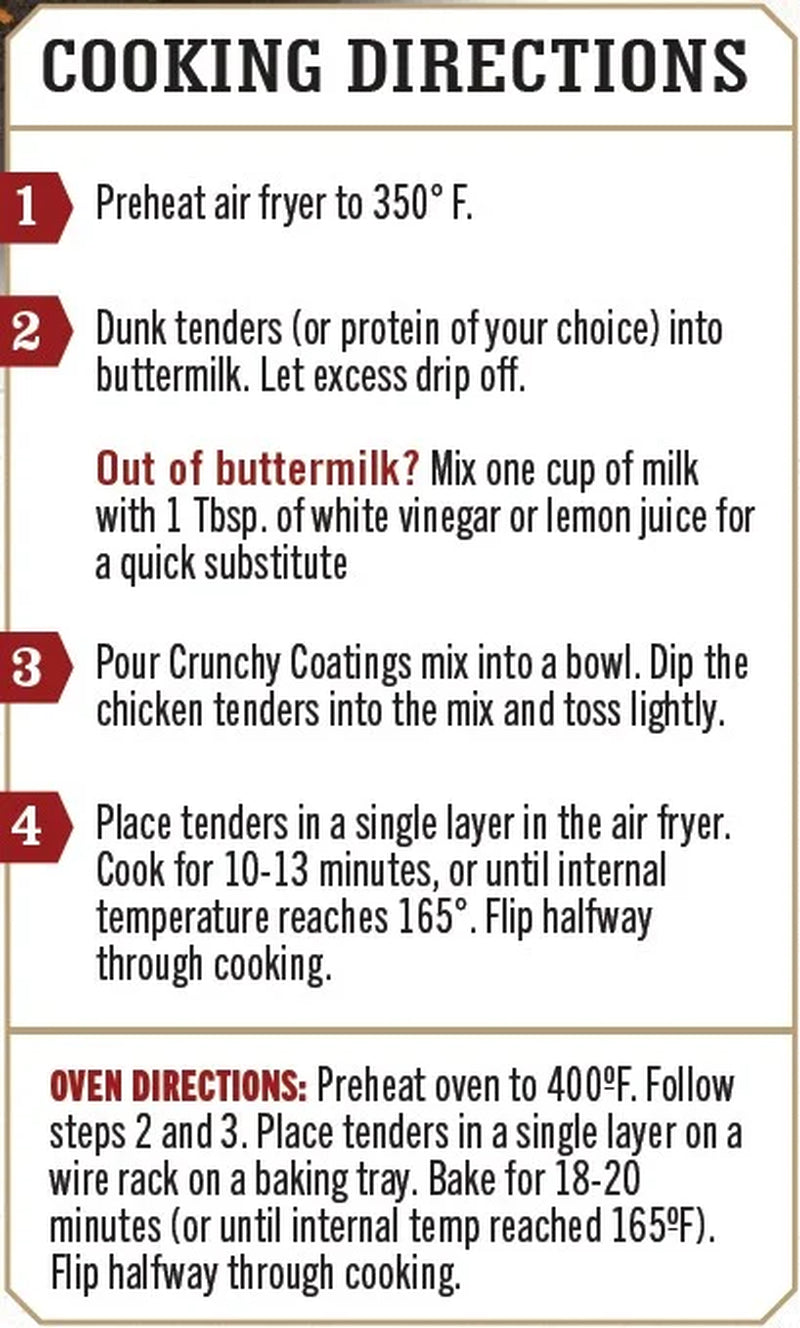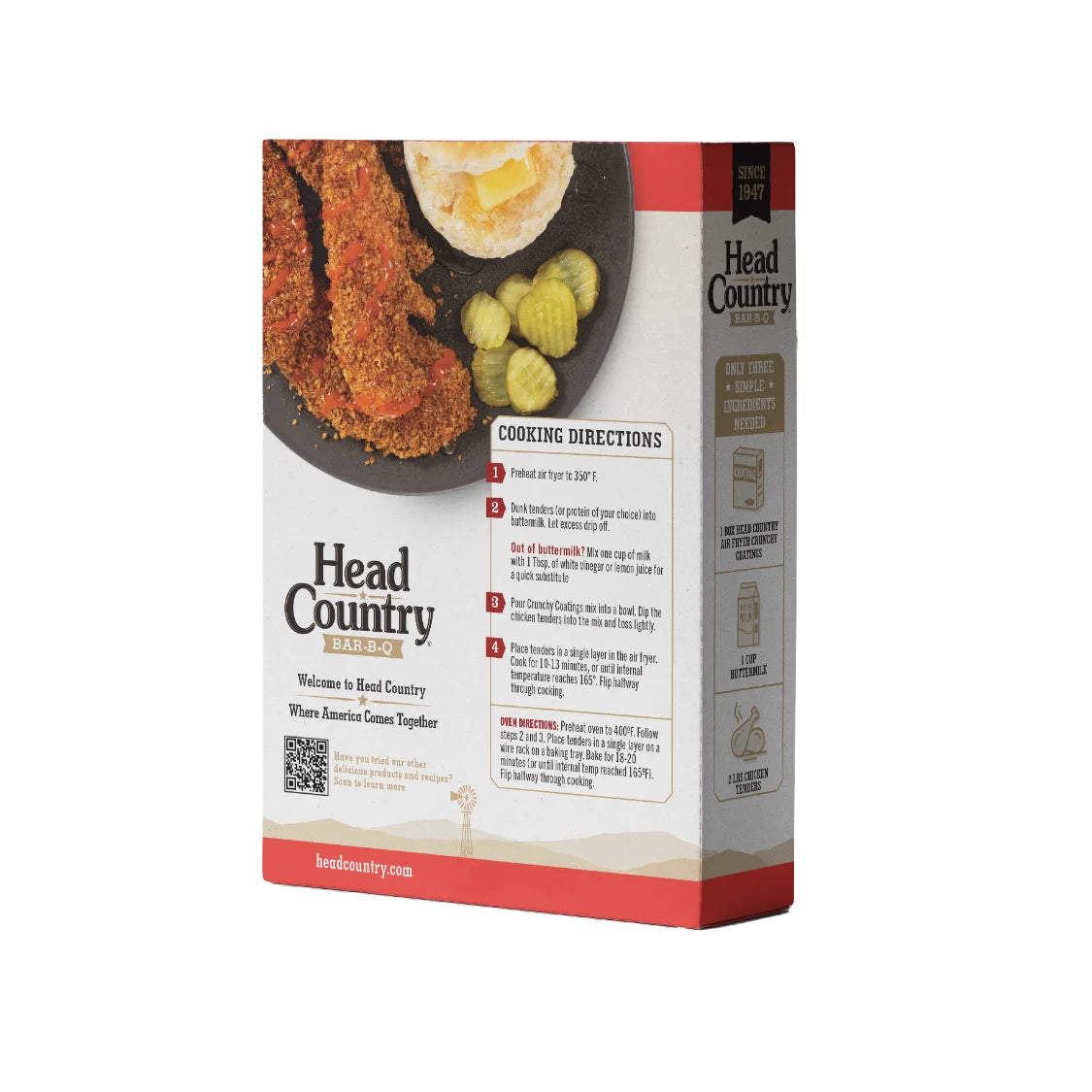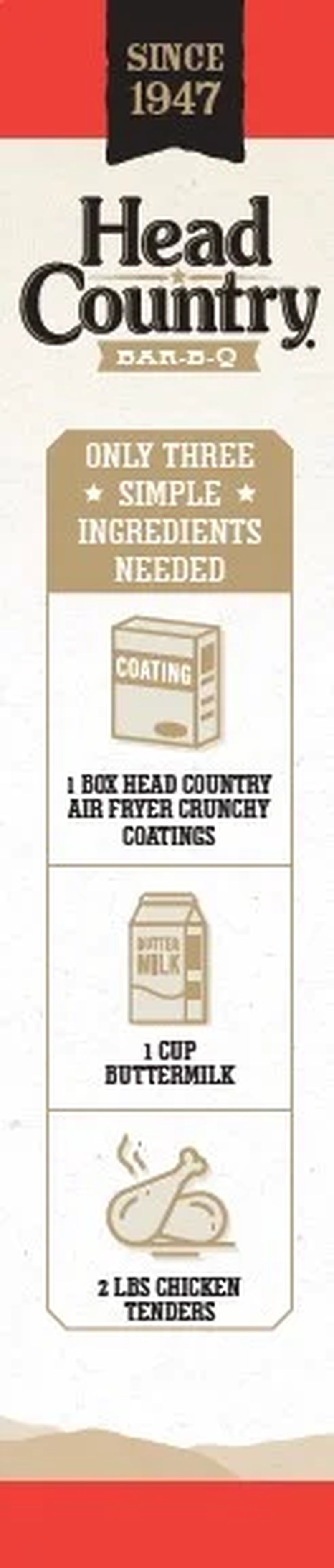 Head Country Bar-B-Q presents a new meat Crispy Coating perfectly made to cook in the Air Fryer in a new flavor of Nashville Hot 8-ounce box. Take you ‘Que from Good to Great at Head Country Bar-B-Q where you can find your favorite sauces and seasonings. The Head Country story started 75 years ago in the heartland of this great country. Our die-hard fans spread the word, and now we have fans all over the globe. Funny how sharing what you love with friends and family can change the world—or, at least, spread the sauce. From the same experts at Head Country who've been bringing barbecue to your table for over 75 years - our Air Fryer Crunchy Coatings will be a regular on your weekend dinner menu. A delicious meal with just three simple ingredients and your air fryer. Just dunk, dip, and go!