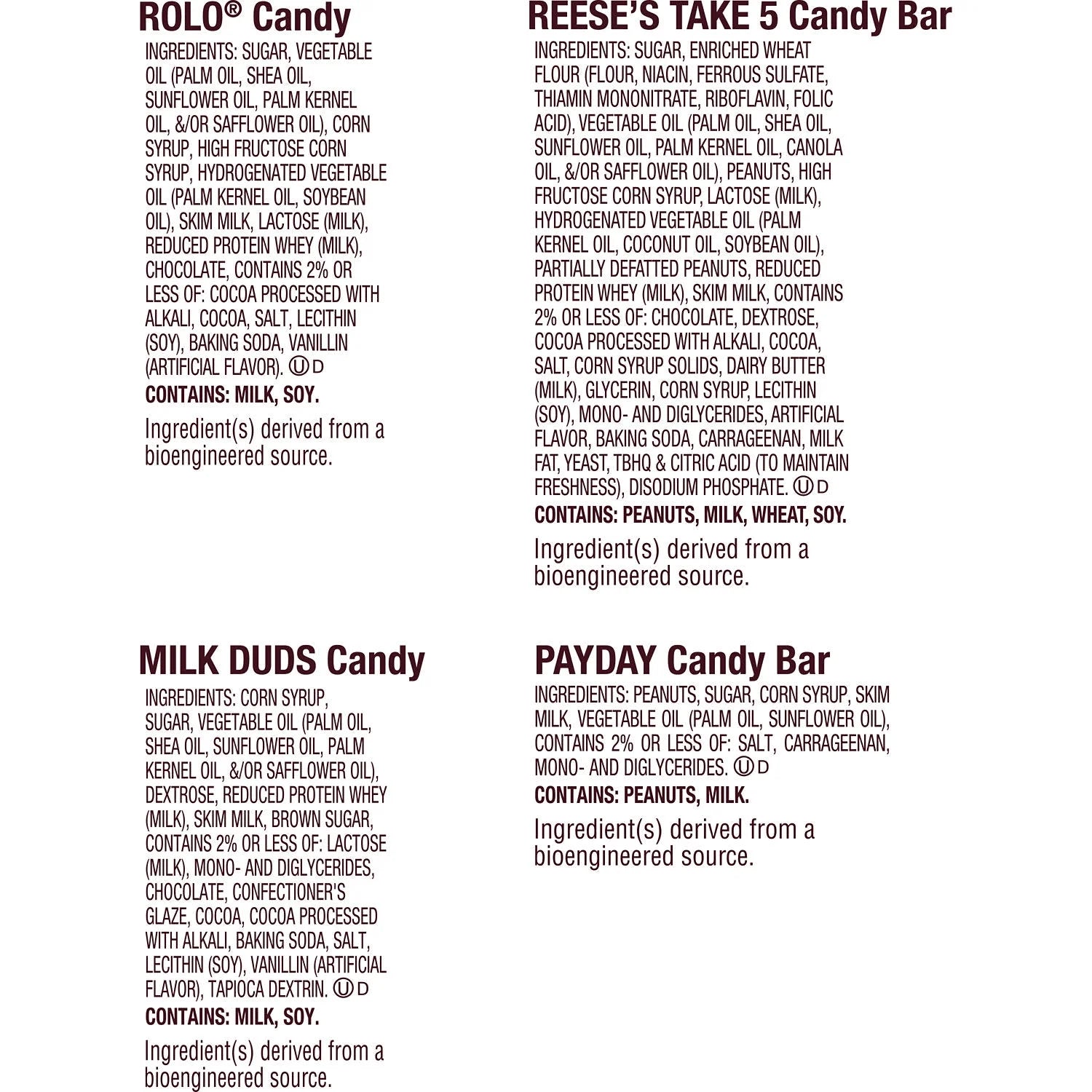 Payday Candy Bar: Peanuts, Sugar, Corn Syrup, Skim Milk, Vegetable Oil (Palm Oil, Sunflower Oil), Contains 2% or Less of: Salt, Carrageenan Mono- and Diglycerides. Rolo Candy: Sugar, Vegetable Oil (Palm Oil, Shea Oil, Sunflower Oil, Palm Kernel Oil, &/or Safflower Oil), Corn Syrup, High Fructose Corn Syrup, Hydrogenated Vegetable Oil (Palm Kernel Oil, Soybean Oil), Skim Milk, Lactose (Milk), Reduced Protein Whey (Milk), Chocolate, Contains 2% or Less of: Cocoa Processed with Alkali, Cocoa, Salt, Lecithin Soy, Baking Soda, Vanillin (Artificial Flavor). Milk Duds Candy: Corn Syrup, Sugar, Vegetable Oil (Palm Oil, Shea Oil, Sunflower Oil, Palm Kernel Oil, &/or Safflower Oil), Dextrose, Reduced Protein Whey (Milk), Skim Milk, Brown Sugar, Contains 2% or Less of Lactose (Milk), Mono- and Diglycerides, Chocolate, Confectioner's Glaze, Cocoa, Cocoa Processed with Alkali, Baking Soda, Salt, Lecithin (Soy), Vanillin (Artificial Flavor), Tapioca Dextrin. Reese's Take 5 Candy Bar: Sugar, Enriched Wheat Flour (Flour, Niacin Ferrous Sulfate, Thiamin Mononitrate, Riboflavin, Folic Acid), Vegetable Oil (Palm Oil, Shea Oil, Sunflower Oil, Palm Kernel Oil, Canola Oil, &/or Safflower Oil), Peanuts, High Fructose Corn Syrup, Lactose (Milk), Hydrogenated Vegetable Oil (Palm Kernel Oil, Coconut Oil, Soybean Oil), Partially Defatted Peanuts, Reduced Protein Whey (Milk), Skim Milk, Contains 2% or Less of: Chocolate, Dextrose, Cocoa Processed with Alkali, Cocoa, Salt, Corn Syrup Solids, Dairy Butter (Milk), Glycerin, Corn Syrup, Lecithin (Soy), Mono- and Diglycerides, Artificial Flavor, Baking Soda, Carrageenan, Milk Fat, Yeast, TBHQ & Citric Acid (to Maintain Freshness), Disodium Phosphate./div>