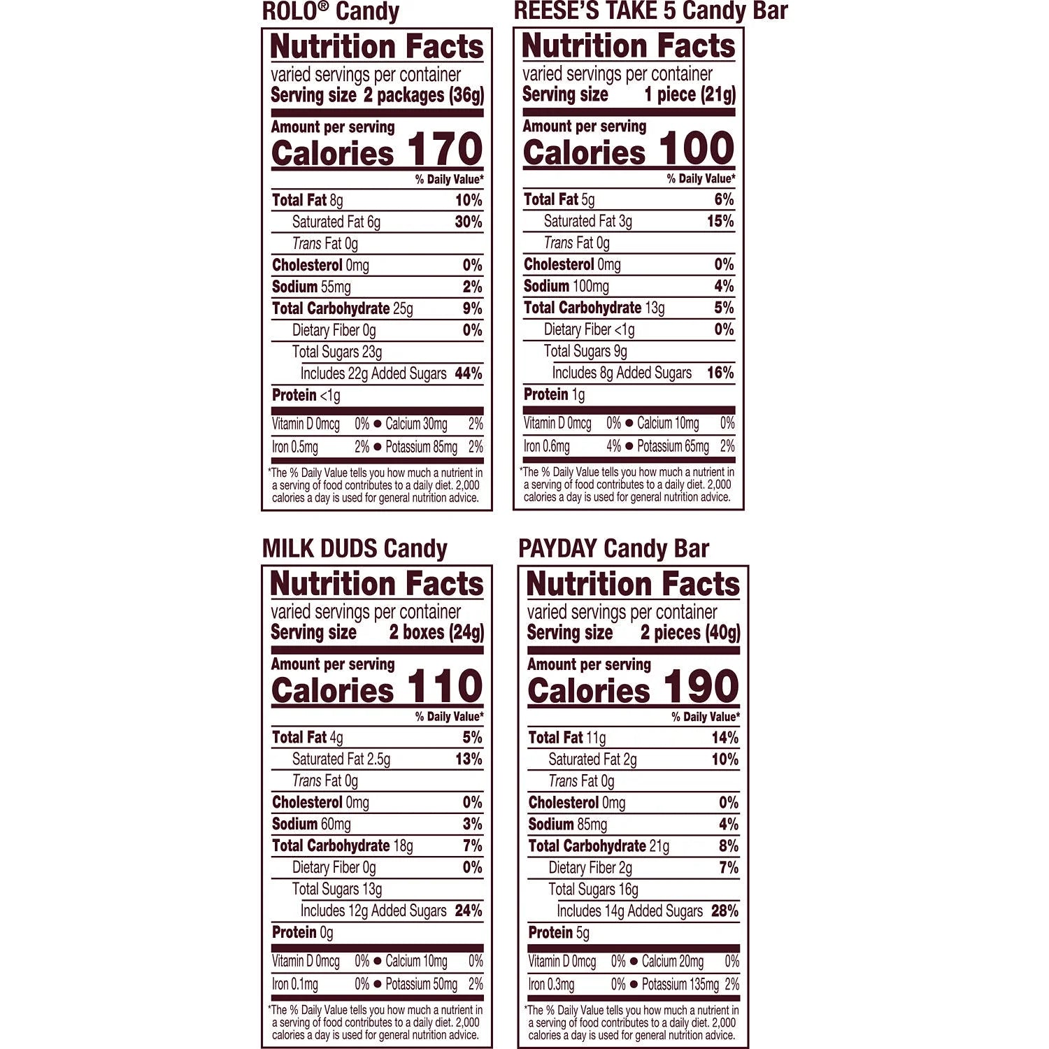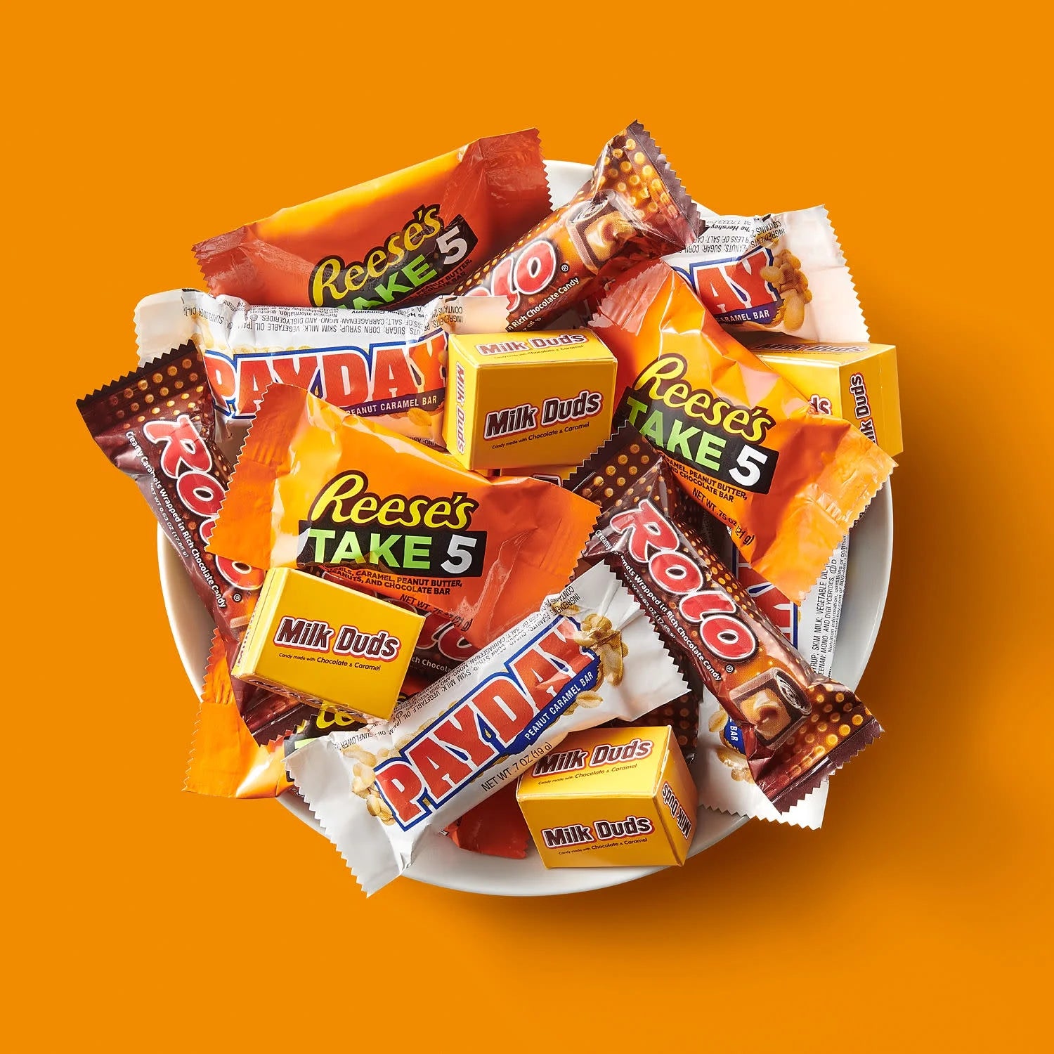 • Includes REESE'S TAKE 5 pretzel, caramel, peanut butter, peanut, and chocolate bars, PAYDAY peanut caramel bars, ROLO rich caramel candy and MILK DUDS chocolate and caramel candy