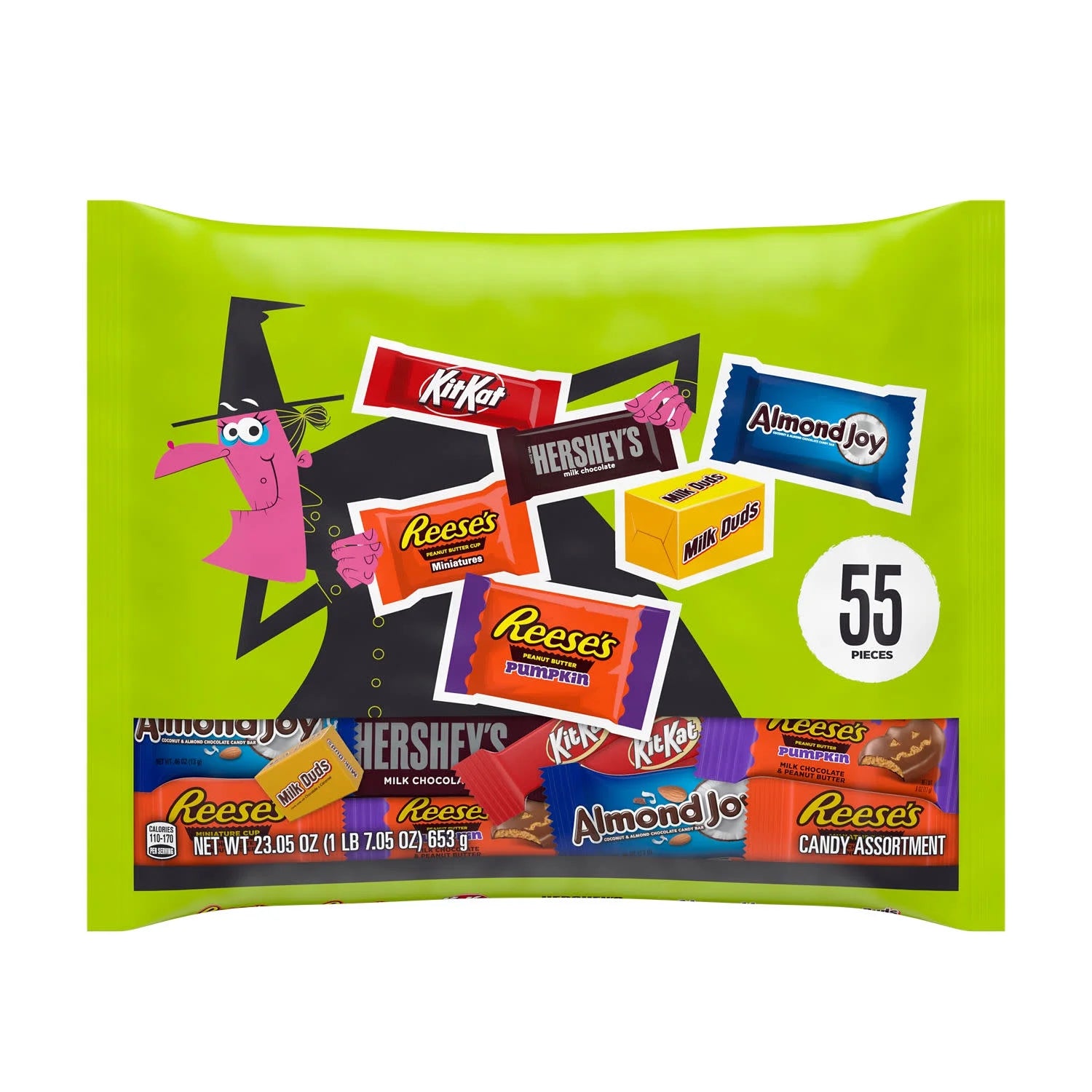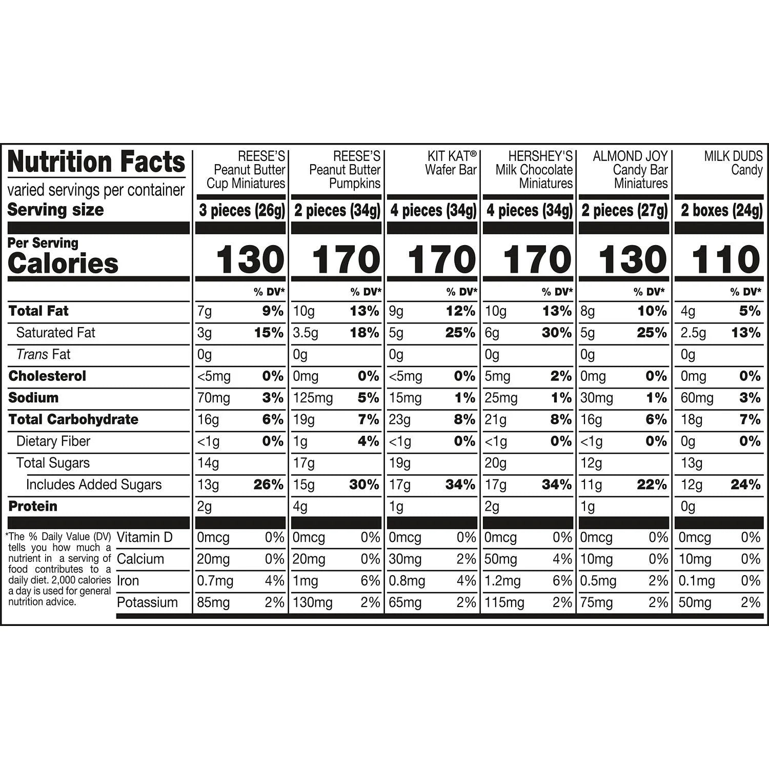 • Includes REESE'S milk chocolate peanut butter cups and pumpkins candy, HERSHEY'S milk chocolate candy bars, KIT KAT milk chocolate wafer bars, ALMOND JOY coconut and almond chocolate candy bars and MILK DUDS chocolate caramel candy