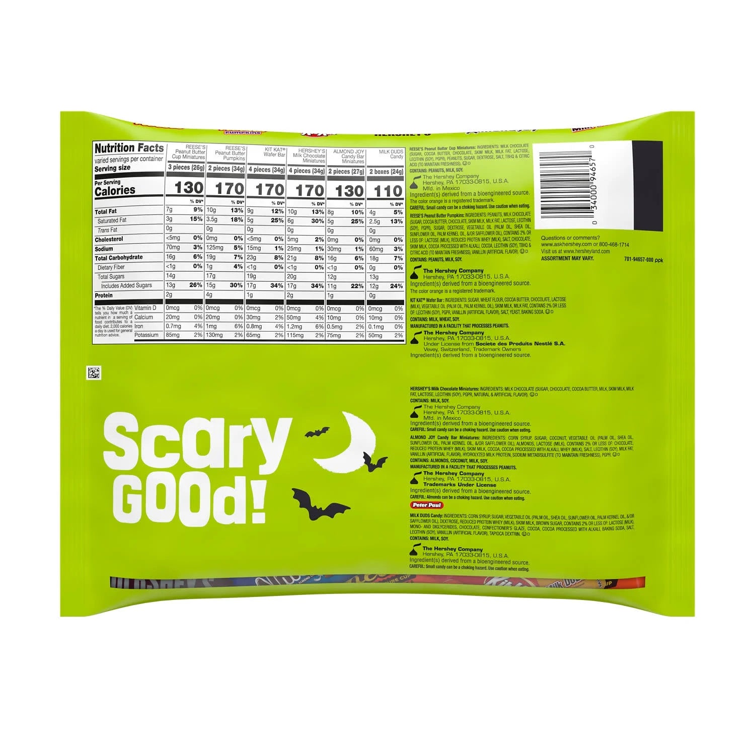 Enjoy a delicious chocolatey treat anywhere and anytime with a Hershey snack size chocolate candy assortment. Offering six crowd-pleasing favorites, this Halloween candy assortment is perfect for sharing with family, friends, teammates or co-workers. Take this variety candy bag into the office break room, pour some individually wrapped candies into your jar at home or take a bag to your next sports game to celebrate the win. This assorted bag of trick or treat candy includes REESE'S milk chocolate peanut butter cups and pumpkins candy, HERSHEY'S milk chocolate candy bars, KIT KAT milk chocolate wafer bars, ALMOND JOY coconut and almond chocolate candy bars, and MILK DUDS chocolate caramel candy.