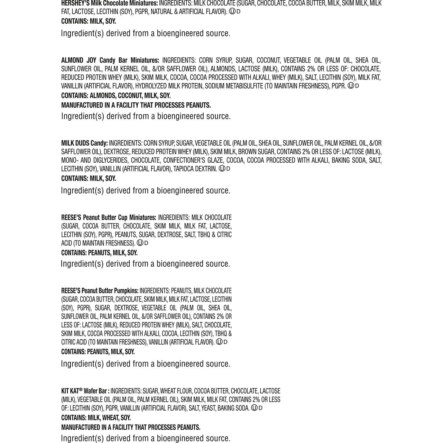 Reese's Peanut Butter Cup Miniatures: Milk Chocolate (Sugar, Cocoa Butter, Chocolate, Skim Milk, Milk Fat, Lactose Lecithin (Soy), PGPR), Peanuts, Sugar, Dextrose, Salt, TBHQ & Citric Acid (to Maintain Freshness). Reese's Peanut Butter Pumpkins: Peanuts, Milk Chocolate (Sugar, Cocoa Butter, Chocolate, Skim Milk, Milk Fat, Lactose, Lecithin (Soy), PGPR), Sugar, Dextrose, Vegetable Oil (Palm Oil, Shea Oil Sunflower Oil, Palm Kernel Oil, &/or Safflower Oil), Contains 2% or Less of: Lactose (Milk), Reduced Protein Whey (Milk), Salt, Chocolate, Skim Milk, Cocoa Processed with Alkali, Cocoa, Lecithin (Soy), TBHQ & Citric Acid (to Maintain Freshness), Vanillin (Artificial Flavor). Kit Kat Wafer Bar: Sugar, Wheat Flour, Cocoa Butter, Chocolate, Lactose (Milk), Vegetable Oil (Palm Oil, Palm Kernel Oil), Skim Milk, Milk Fat, Contains 2% or Less of: Lecithin (Soy), PGPR, Vanillin (Artificial Flavor), Salt, Yeast, Baking Soda. Hershey's Milk Chocolate Miniatures: Milk Chocolate (Sugar, Chocolate, Cocoa Butter, Milk, Skim Milk, Milk Fat, Lactose, Lecithin (Soy), PGPR, Natural & Artificial Flavor). Almond Joy Candy Bar Miniatures: Corn Syrup, Sugar, Coconut, Vegetable Oil (Palm Oil, Shea Oil Sunflower Oil, Palm Kernel Oil, &/or Safflower Oil), Almonds, Lactose (Milk), Contains 2% or Less of: Chocolate Reduced Protein Whey (Milk), Skim Milk, Cocoa, Cocoa Processed with Alkali, Whey (Milk), Salt, Lecithin (Soy), Milk Fat, Vanillin (Artificial Flavor), Hydrolyzed Milk Protein, Sodium Metabisulfite (to Maintain Freshness), PGPR. Milk Duds Candy: Corn Syrup, Sugar, Vegetable Oil (Palm Oil, Shea Oil, Sunflower Oil, Palm Kernel Oil, &/or Safflower Oil), Dextrose, Reduced Protein Whey (Milk), Skim Milk, Brown Sugar, Contains 2% or Less of: Lactose (Milk Mono-and Diglycerides, Chocolate, Confectioner's Glaze, Cocoa, Cocoa Processed with Alkali, Baking Soda, Salt, Lecithin (Soy), Vanillin (Artificial Flavor), Tapioca Dextrin./div>