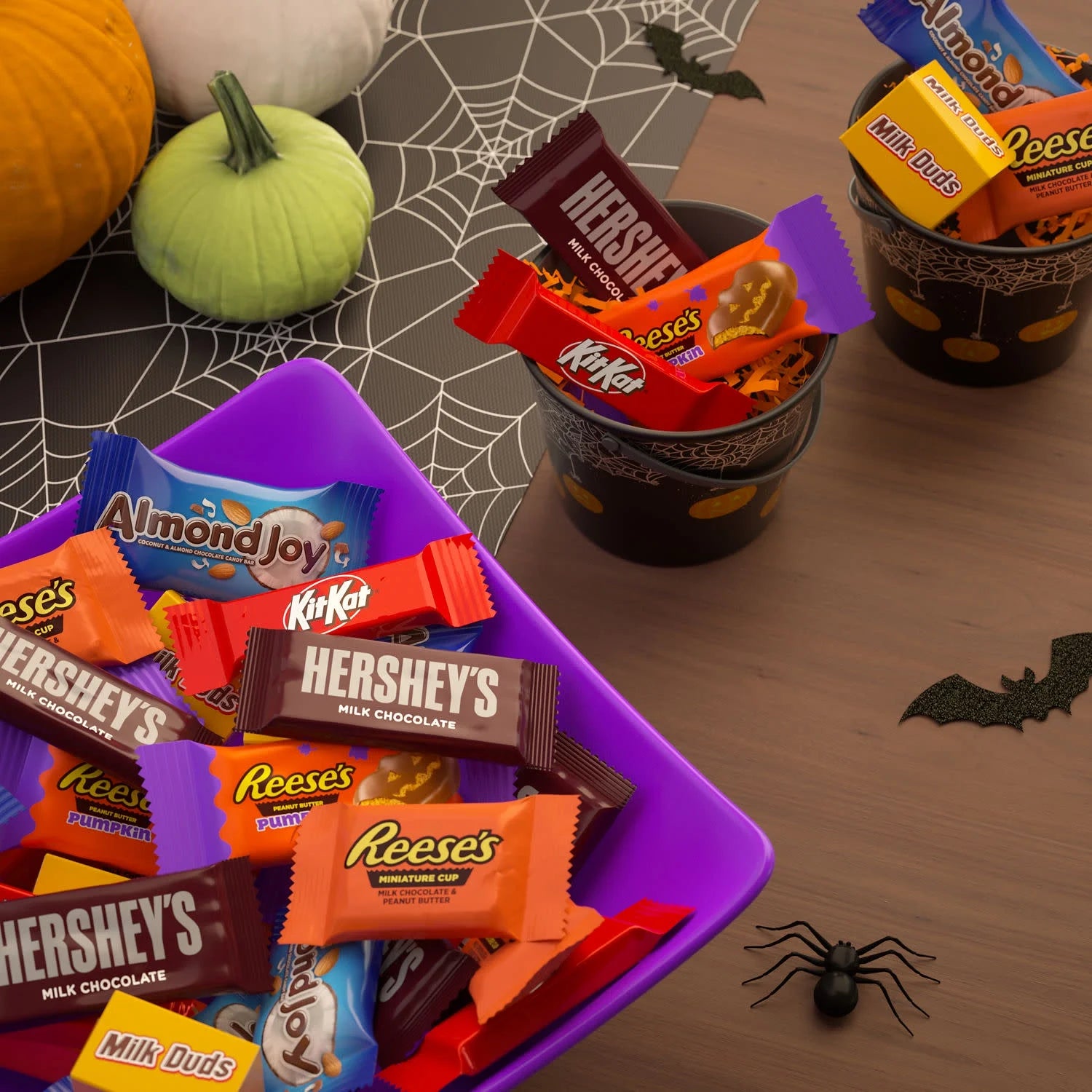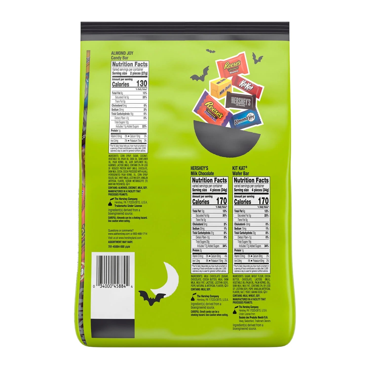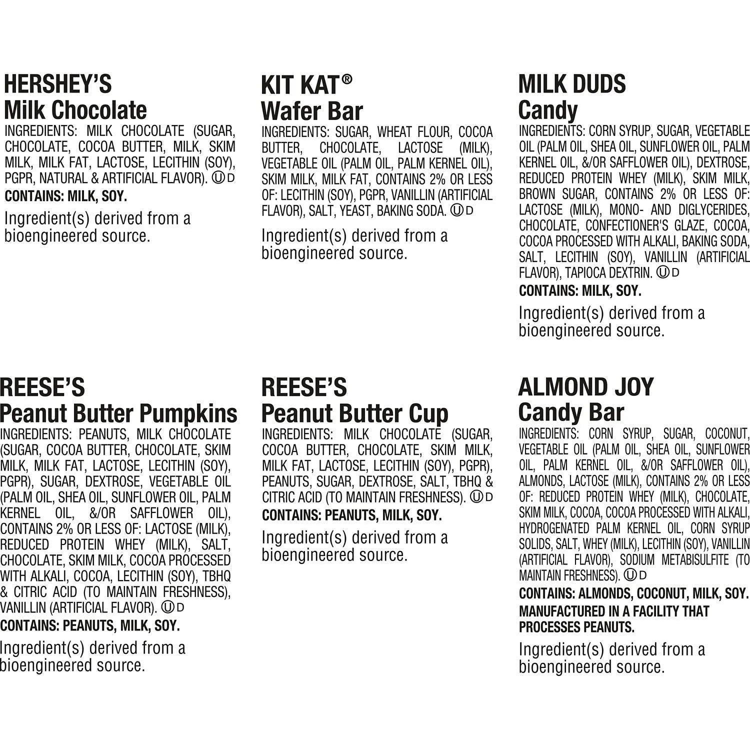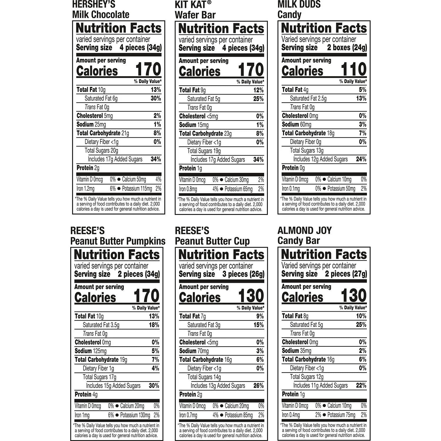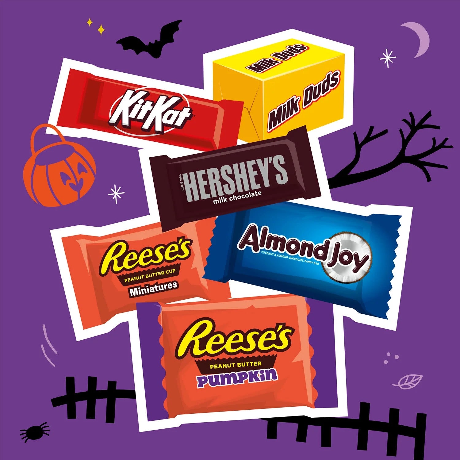 - Includes REESE'S milk chocolate peanut butter cups and pumpkins candy, HERSHEY'S milk chocolate candy bars, KIT KAT milk chocolate wafer bars, ALMOND JOY coconut and almond chocolate candy bars and MILK DUDS chocolate caramel candy