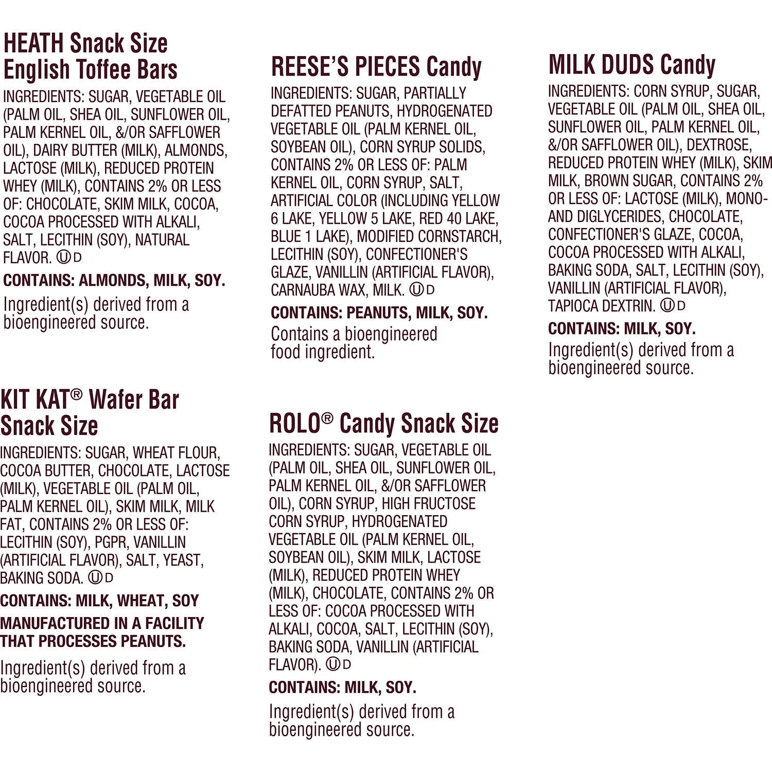 Reese's Pieces Candy: Sugar, Partially Defatted Peanuts, Hydrogenated Vegetable Oil (Palm Kernel Oil, Soybean Oil), Corn Syrup Solids, Contains 2% or Less of: Palm Kernel Oil, Corn Syrup, Salt, Artificial Color (Including Yellow 6 Lake, Yellow 5 Lake, Red 40 Lake, Blue 1 Lake), Modified Corn Starch Lecithin (Soy), Confectioner's Glaze, Vanillin (Artificial Flavor), Carnauba Wax, Milk. Rolo Candy Snack Size: Sugar, Vegetable Oil (Palm Oil, Shea Oil, Sunflower Oil, Palm Kernel Oil, &/or Safflower Oil), Corn Syrup, High Fructose Corn Syrup, Hydrogenated Vegetable Oil (Palm Kernel Oil, Soybean Oil), Skim Milk, Lactose (Milk), Reduced Protein Whey (Milk), Chocolate, Contains 2% or Less of: Cocoa Processed with Alkali, Cocoa, Salt, Lecithin (Soy), Baking Soda, Vanillin (Artificial Flavor). Heath Snack Size English Toffee Bars: Sugar, Vegetable Oil, (Palm Oil, Shea Oil, Sunflower Oil, Palm Kernel Oil, &/or Safflower Oil), Dairy Butter (Milk), Almonds, Lactose (Milk), Reduced Protein Whey (Milk), Contains 2% or Less of: Chocolate, Skim Milk, Cocoa, Cocoa Processed with Alkali, Salt, Lecithin (Soy), Natural Flavor. Kit Kat Wafer Bar Snack Size: Sugar, Wheat Flour, Cocoa Butter, Chocolate, Lactose (Milk), Vegetable Oil (Palm Oil, Palm Kernel Oil), Skim Milk, Milk Fat, Contains 2% or Less of: Lecithin (Soy), PGPR, Vanillin (Artificial Flavor), Salt, Yeast, Baking Soda. Milk Duds Candy: Corn Syrup, Sugar, Vegetable Oil (Palm Oil, Shea Oil, Sunflower Oil, Palm Kernel Oil, &/or Safflower Oil), Dextrose, Reduced Protein Whey (Milk), Skim Milk, Brown Sugar, Contains 2% or Less of: Lactose (Milk), Mono and Diglycerides, Chocolate, Confectioner's Glaze, Cocoa, Cocoa Processed with Alkali, Baking Soda, Salt, Lecithin (Soy), Vanillin (Artificial Flavor), Tapioca Dextrin./div>