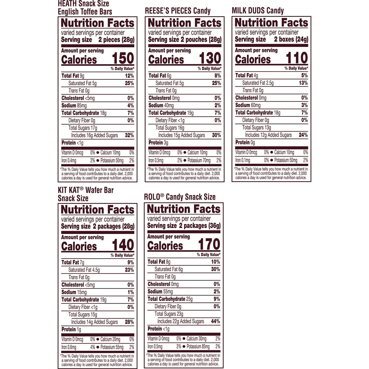 - Includes HEATH chocolatey English toffee bars, REESE'S PIECES peanut butter candy, MILK DUDS chocolate caramel candy, KIT KAT milk chocolate wafer bars and ROLO rich chocolate caramel candy